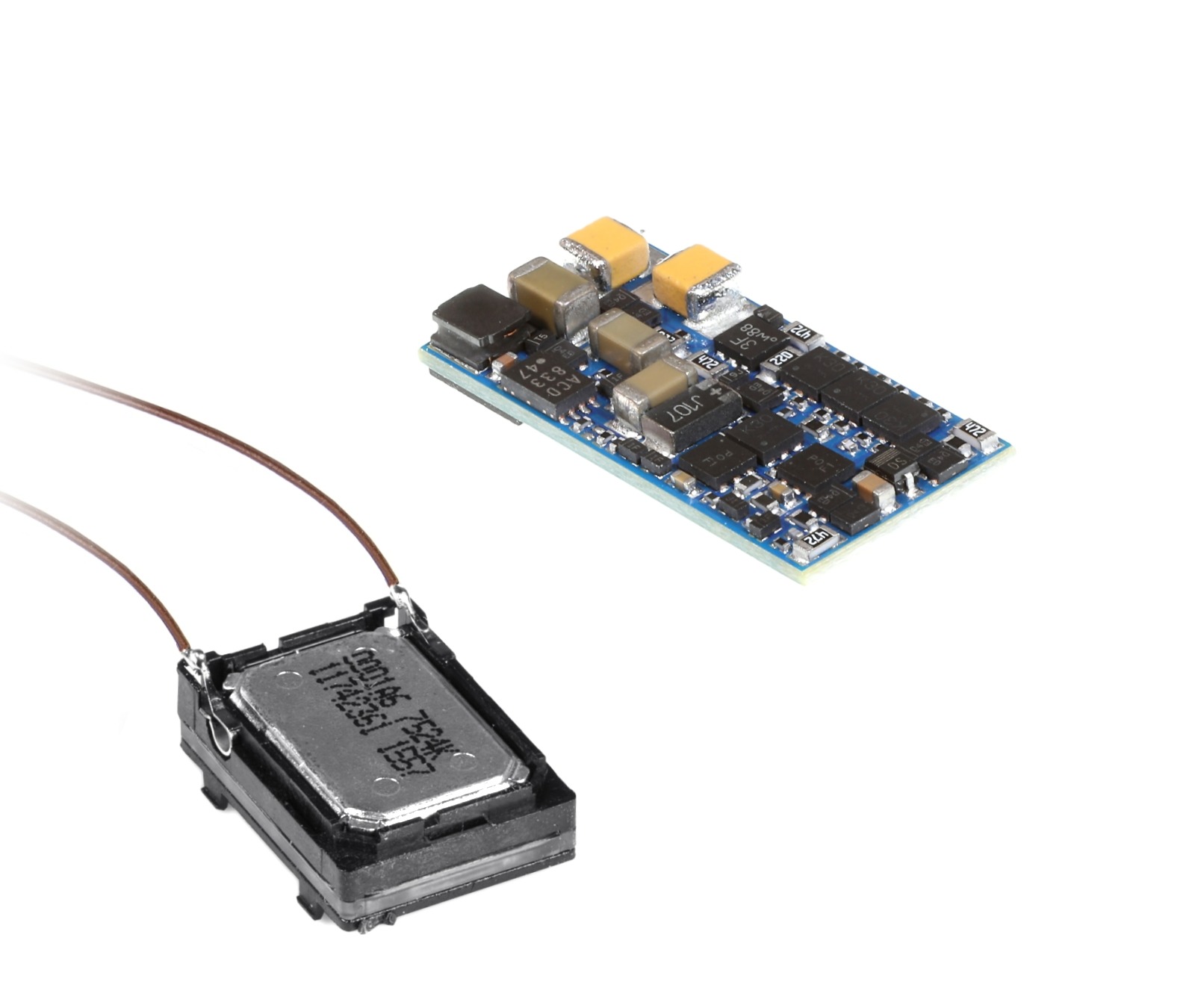 De LokSound 5 micro is een "klein wonder": met een afmeting van slechts 21 mm x 10 mm is het verreweg de kleinste LokSound-decoder die we ooit hebben gebouwd. Dit betekent dat hij geschikt is voor gebruik in alle N- en TT-spoorvoertuigen, evenals in kleine H0-voertuigen. LokSound 5 micro-decoders zijn altijd voorzien van een Next18-interface en worden geleverd met adapterstekkers voor alle gangbare interfaces. Een 11x15 mm "suikerklontje"-luidspreker en een geluidscapsuleset worden ook altijd meegeleverd. Bedrijfsmodi De LokSound 5 micro is ook een echte multiprotocoldecoder. Hij ondersteunt het DCC-dataformaat, evenals Motorola®, Selectrix® en M4. In DCC-formaat zijn 14 tot 128 snelheidsstappen standaard, evenals 2- en 4-cijferige adressen en maximaal 32 functies. Dankzij RailComPlus® melden de decoders zich volledig automatisch aan bij een geschikte digitale centrale. Het ondersteunt alle DCC-programmeermodi en dankzij RailCom® kunnen CV-waarden op het hoofdspoor worden uitgelezen met geschikte centrales. Hulpregisters zijn beschikbaar voor centrales die alleen CV's 1-255 kunnen programmeren.