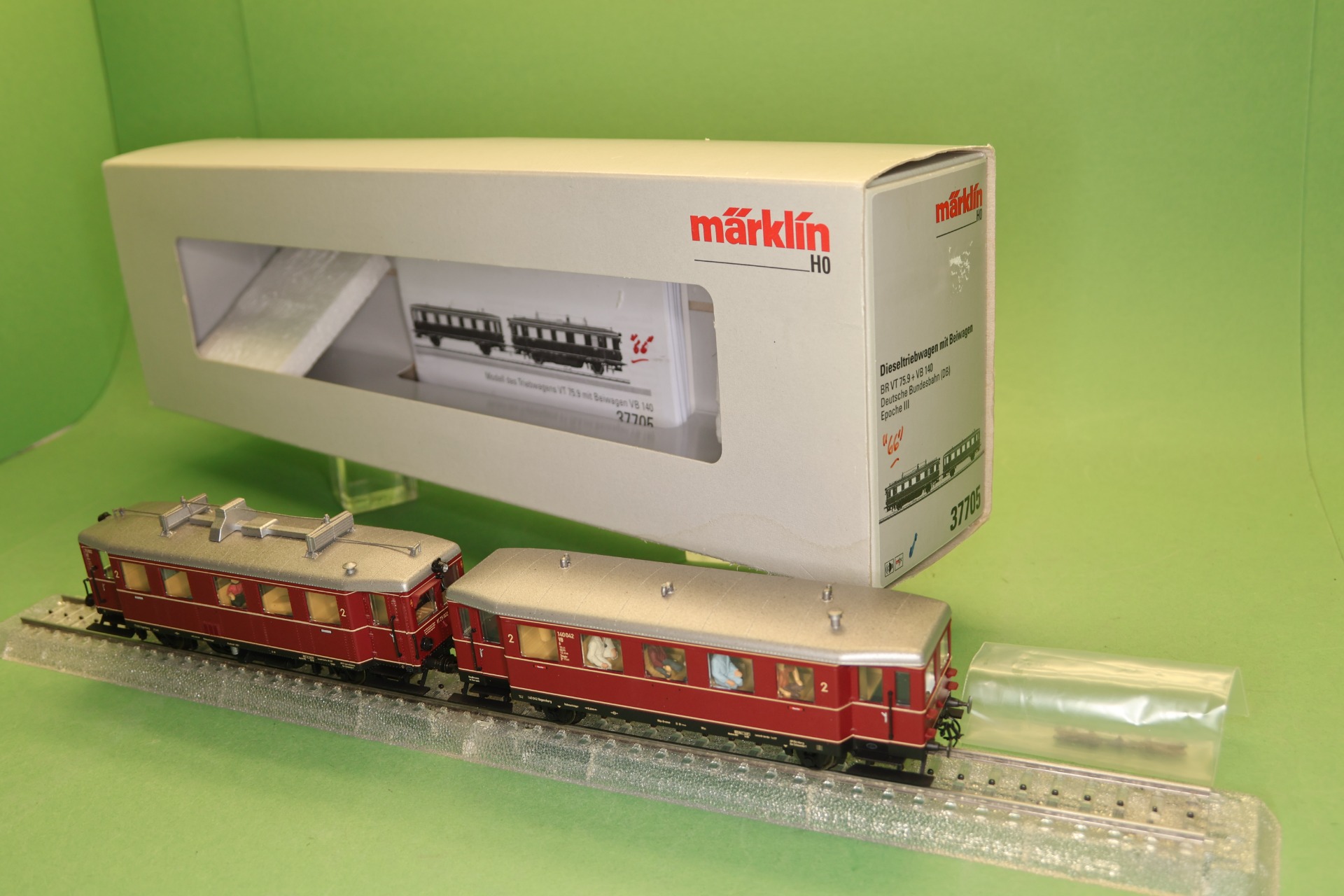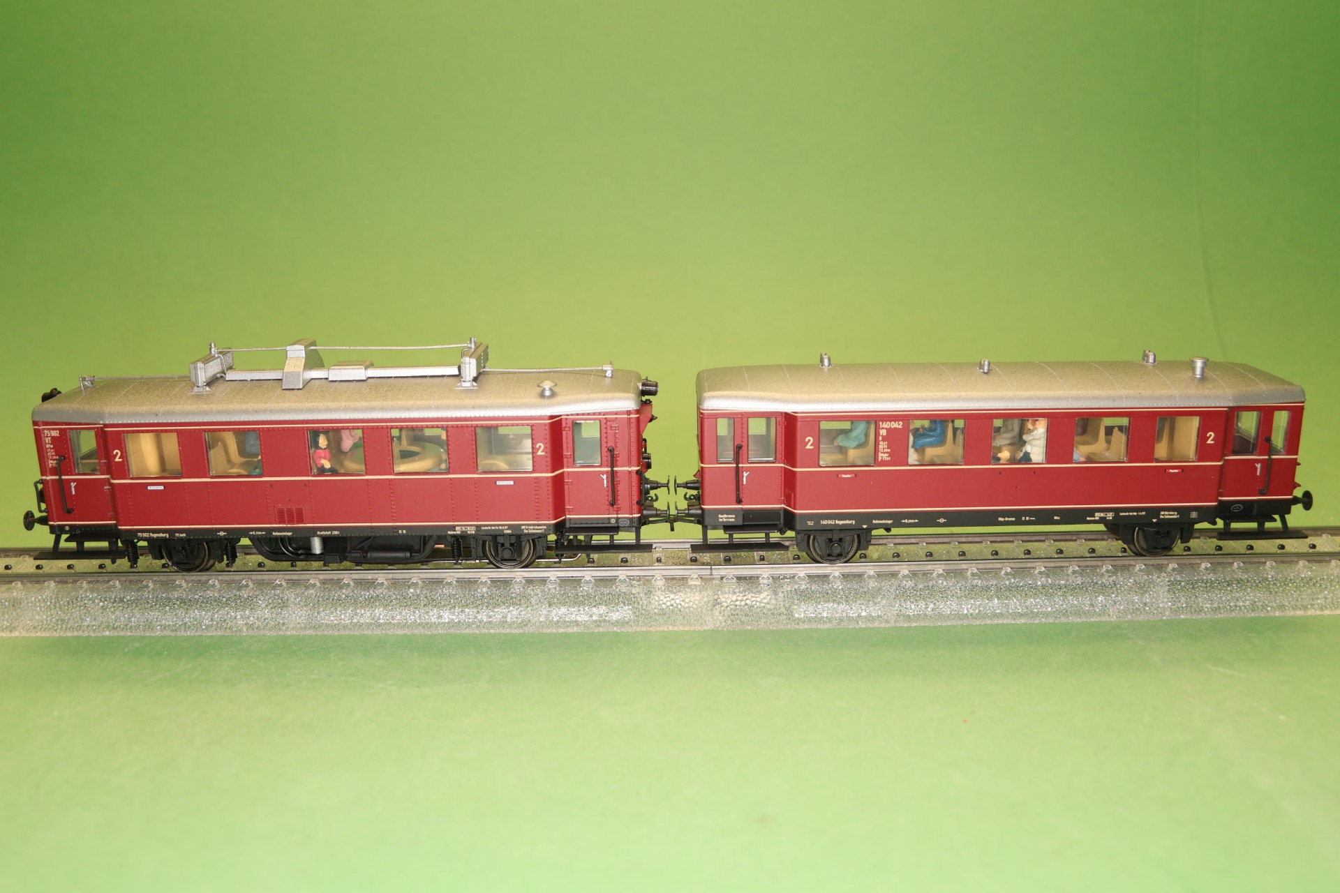 Model: Met Digital-decoder mfx en uitgebreide geluidsfuncties. Geregelde hoogvermogenaandrijving met vliegwiel in het motorrijtuig. Beide assen in het motorrijtuig aangedreven. Antislipbanden. Standaard ingebouwde interieurverlichting in het motorrijtuig en het aanhangrijtuig. Driepuntsfrontsein wisselt met de rijrichting en 2 rode sluitseinen op het motorrijtuig en interieurverlichting traditioneel in bedrijf, digitaal schakelbaar. Verlichting met onderhoudsarme warmwitte LED’s. Rood sluitsein op het motorrijtuig is aan zijde 2 aan de kant van het aanhangrijtuig afzonderlijk digitaal schakelbaar. Aanhangwagen voorbeeldgetrouw zonder frontsein. Tussen de voertuigeenheden stroomgeleidende verbinding met koppeldissel met schaargeleiding. Interieur. Onbelemmerde doorkijk in het motorrijtuig en het aanhangrijtuig. Op het motorrijtuig afzonderlijk gemonteerde ladder. Lengte over de buffers van de tweedelige wagengroep 28,1 cm.