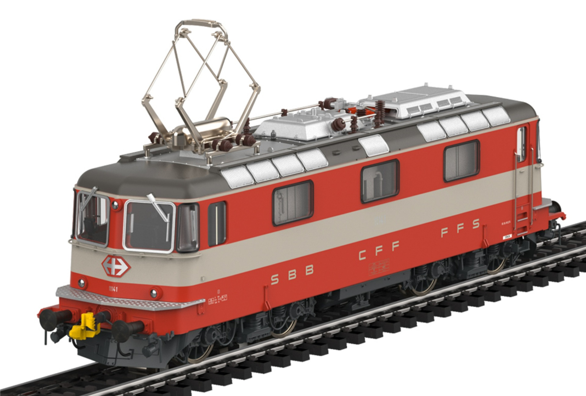 Elektrische locomotief Re 4/4 II, Eerste uitvoering van de Schweizerische Bundesbahnen (SBB). In de kiezelgrijze/bloedoranje kleuren van de Swiss Express. Locomotiefnummer 11141. Model in de uitvoering vanaf 1975.