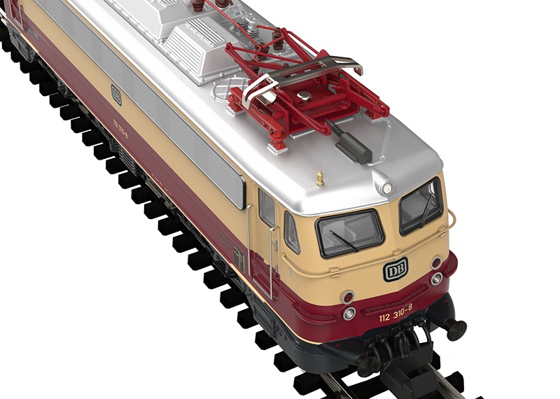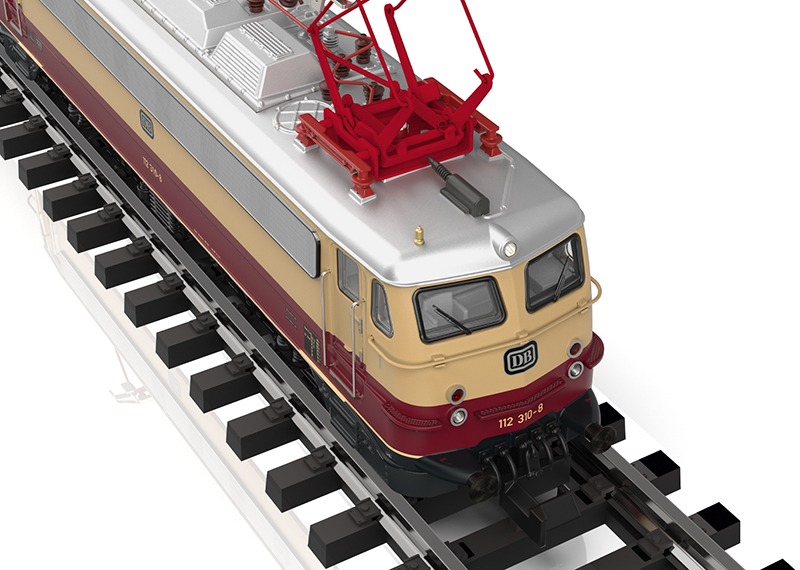 Standaard elektrische locomotief van de Duitse Spoorwegen (DB), serienummer 112 310-8. Sneltreinlocomotief met aerodynamische uiteinden, met de zogenaamde "broekplooi". Basiskleurstelling karmozijnrood/ivoor. Doorlopende regengoot, zijpanelen en bufferbekleding. De locomotief ziet eruit zoals rond 1971 voor de TEE "Rheinpfeil". Gebruik: Passagierstreinen op lange afstanden en incidenteel ook voor forensen- en goederenvervoer.