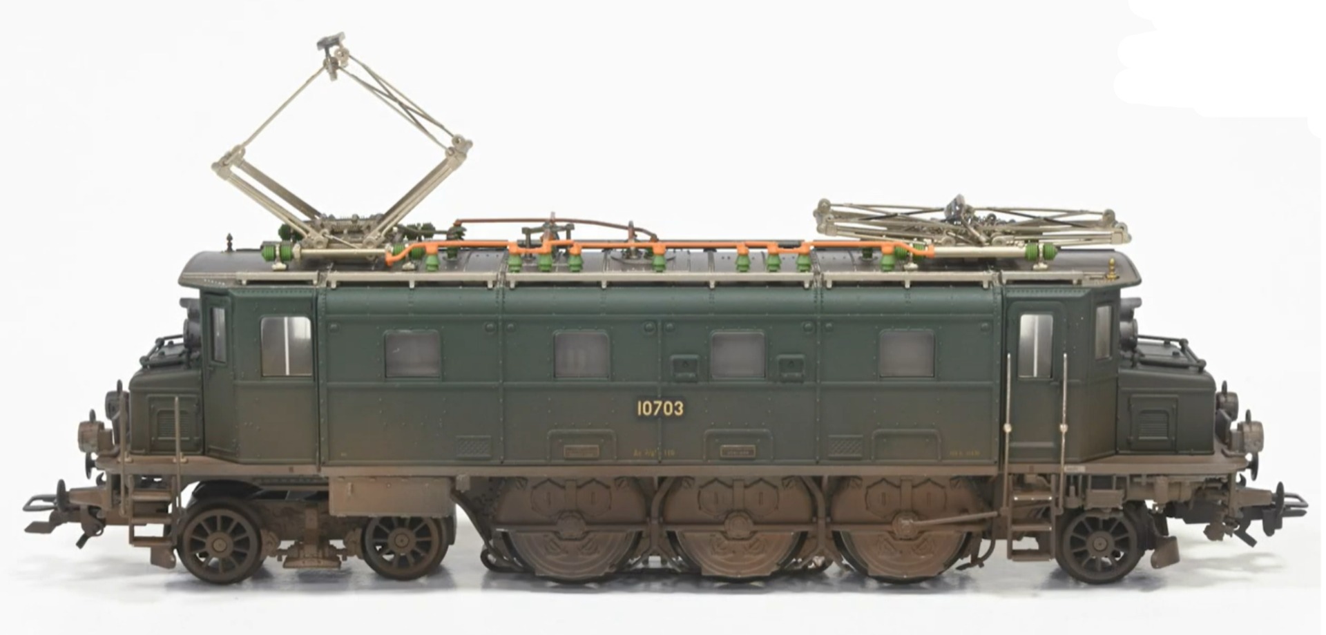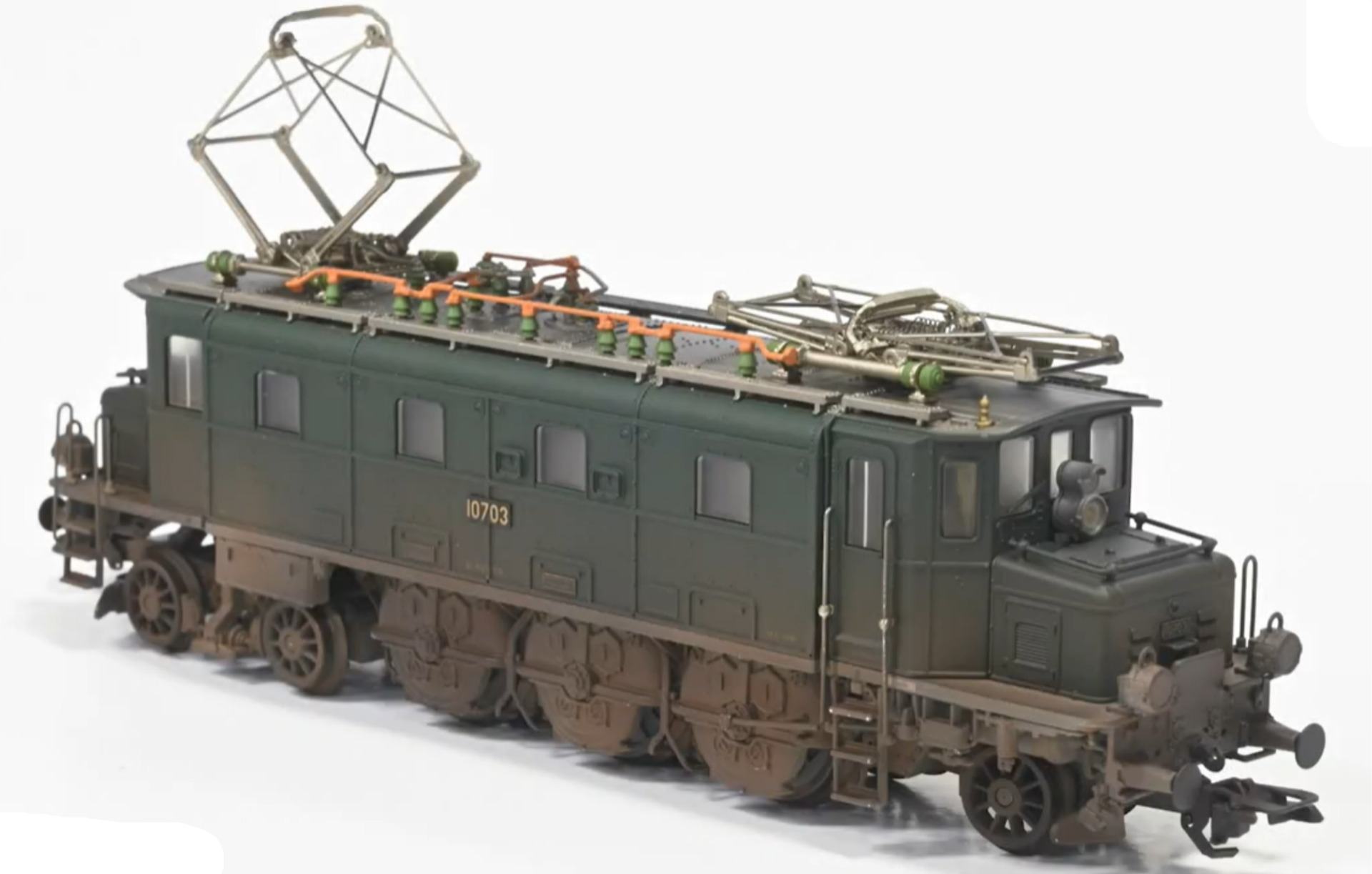 Elektrische locomotief type Ae 3/6 I van de Schweizerische Bundesbahnen (SBB). Locomotief uit de achtste productieserie. Kleur dennengroen met grijs onderstel. Met stangenbuffers, overgangsplatformen aan de kopzijden en vier machinistencabinedeuren aan de zijkanten. Waarschuwing voor spookrijden door de bovenste lamp aan beide zijden. Locomotief bestemd voor gebruik voor lichte sneltreinen in vlakke gebieden, op het traject Genève-Bern-Zürich. Locomotiefnummer 10703. Model in de uitvoering van begin jaren '50 .