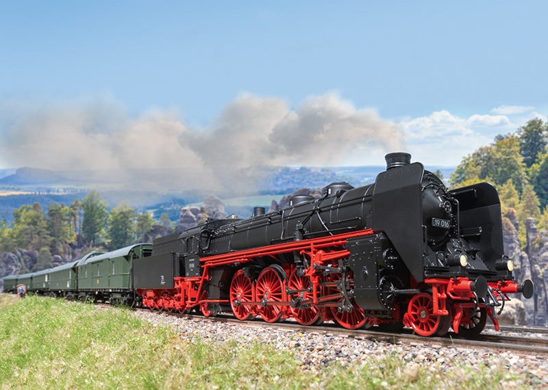 Voorbeeld: Sneltrein-stoomlocomotief type 19.0, de 'Sachsenstolz' (Saksische bouwserie XXHV), met sleep-kolentender 2'2 T31. Model van de Deutsche Reichsbahn van de DDR (DR/DDR). Met grote windleiplaten. Locomotiefnummer 19 016. Model in de uitvoering van Periode IIIa, uit het begin van de jaren '50.