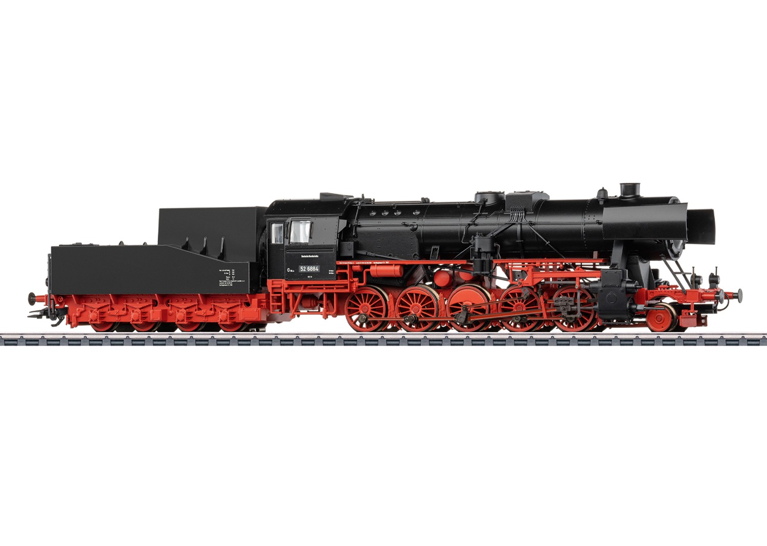 Zware goederen stoomlocomotief type 52, met Steifrahmen (star frame) tender K4 T30 van de Deutsche Bundesbahn (DB). Kleur zwart/rood. Met Witte windleiplaten. Voorloopas met massieve wielen. Locomotiefnummer 52 6884. Model zoals in gebruik omstreeks 1951