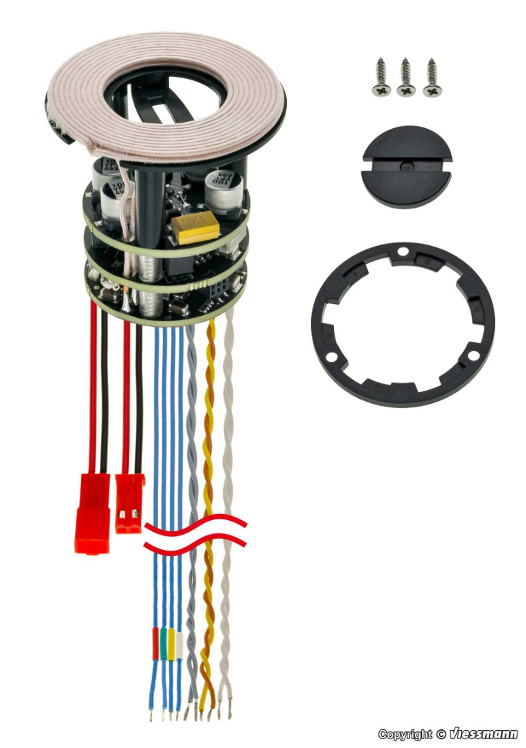 De InductiveCharger maakt draadloos opladen van voertuigen en inductieve communicatie met het voertuig mogelijk. Voertuigen stoppen op de module en positioneren zich automatisch boven de laadspoel, waarbij de laadstroom automatisch wordt aangepast. Deze modules zijn met name geschikt voor locaties met langere stoptijden, zoals verkeerslichten, spoorwegovergangen of tankstations. Meerdere modules kunnen met toekomstige software-updates met elkaar worden verbonden om voertuigen autonoom naar laadposities te leiden. Een regeluitgang voor de gemotoriseerde 2/3-wegkoppeling (artikel 8448), die ook servo's kan aansturen, completeert de mogelijkheden. Voor vrachtwagens is de verhouding tussen reistijd en laadtijd ongeveer 3:1. Dit maakt een vrijwel onbeperkte reistijd mogelijk. De InductiveCharger kan ook voertuigen met ontvangerspoelen in- en uitschakelen. De voertuigen moeten achteraf worden uitgerust met de ontvangerspoel (artikel 8440). Diameter laadspoel: 40 mm, diameter elektronica: 30 mm, hoogte: 60 mm