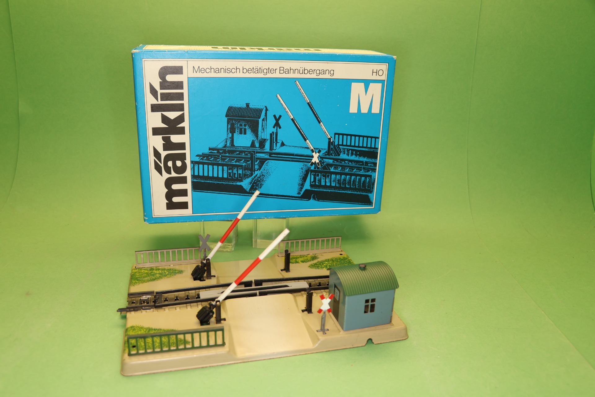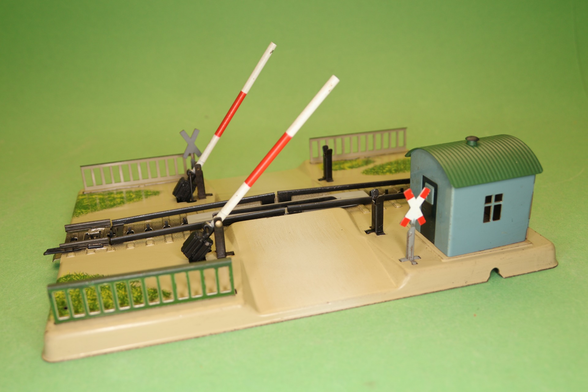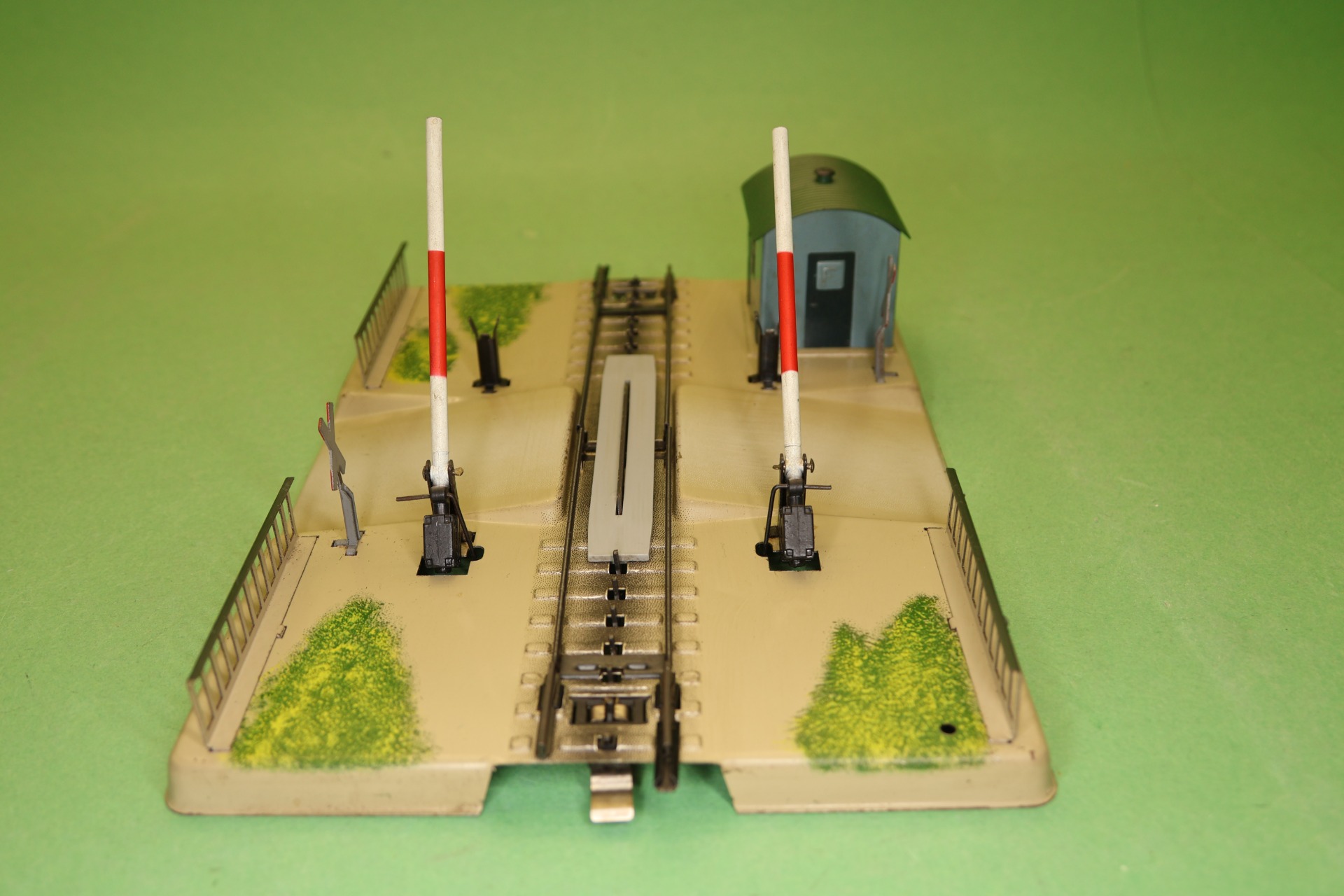 Met volledige slagboom. Voor enkelsporige lijnen met geïntegreerde metalen rails. Het tuimelaarframe wordt door passerende voertuigen ingedrukt, waardoor de slagbomen sluiten. Inclusief seinhuis en waarschuwingskruizen. Onderbouw en bovenbouw van metaal. Spoorlengte: 5106 mm. Afmetingen onderbouw: 135 x 180 mm.