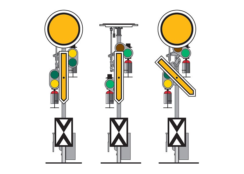 Met bedienbare seinvleugel en bedienbare schijf. Licht wisselt van geel/geel naar groen/groen of naar geel/groen. Met twee servo's.