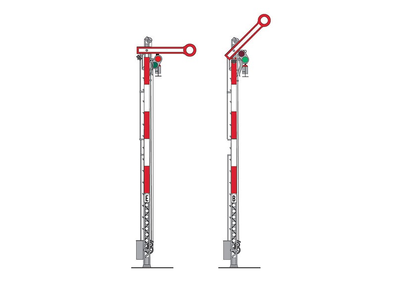 Met één arm en opengewerkte vakwerkmast. Licht wisselt van rood naar groen.