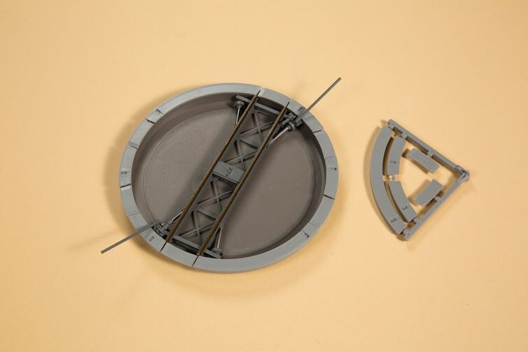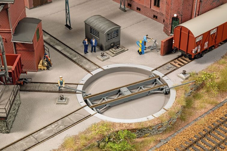Deze handmatige draaischijf is een robuuste oplossing voor iedereen die bewust zonder elektriciteit wil werken. De bouwset is bedoeld voor wagons en heeft geen stroomvoorziening of elektrische functies. Ideaal voor industriële en andere scènes met eenvoudige rangeerhandelingen. Podiumlengte 95 mm, totale diameter 111 mm. Afgaande hoek 90/45 graden. Geschikt voor railsystemen met een profielhoogte van 2,07 mm (bijv. Tillig).