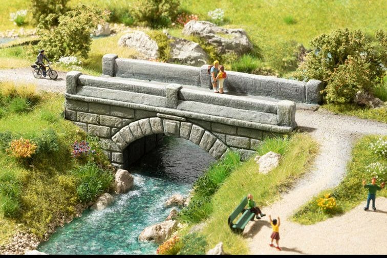De stabiele Obersdorf rug kan rivieren, kanalen en dalen overbruggen. Voetgangers, fietsers maar ook tractoren en auto's kunne nde 3,8 cm breedte overbruggen. Hardschuim kan heel eenvoudug met een mesje of zaag aan de inbouwsituatie worden aangepast en met acryl verf beschilderd.