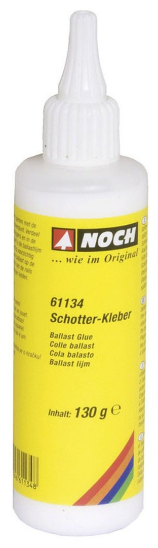 Plaats losse ballast rond de dwarsliggers en in de ruimtes ertussen. Breng vervolgens voorzichtig de ballastlijm aan op de ballast met behulp van de fijne applicatorpunt. Zorg ervoor dat er geen ballaststenen op het spoor achterblijven, aangezien deze later het treinverkeer kunnen verstoren.