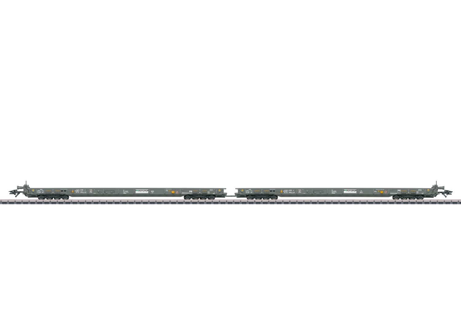 Twee lagevloer transportwagons type Saadkms van de RALpin AG (Olten) voor het doorgaand verkeer van de "Rollende Landstrasse". Kleur kwartz-grijs. Model in de uitvoering vanaf 2018.