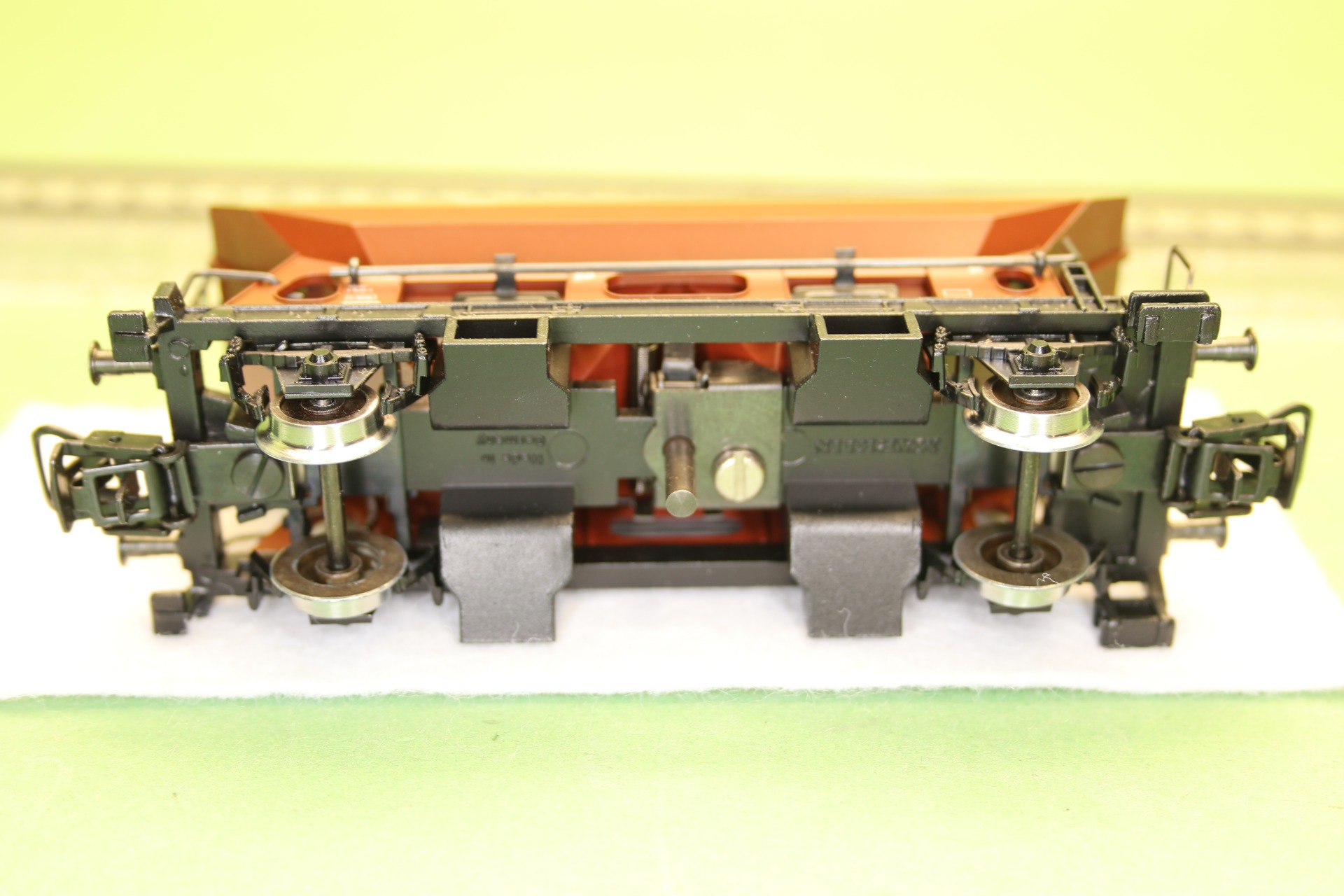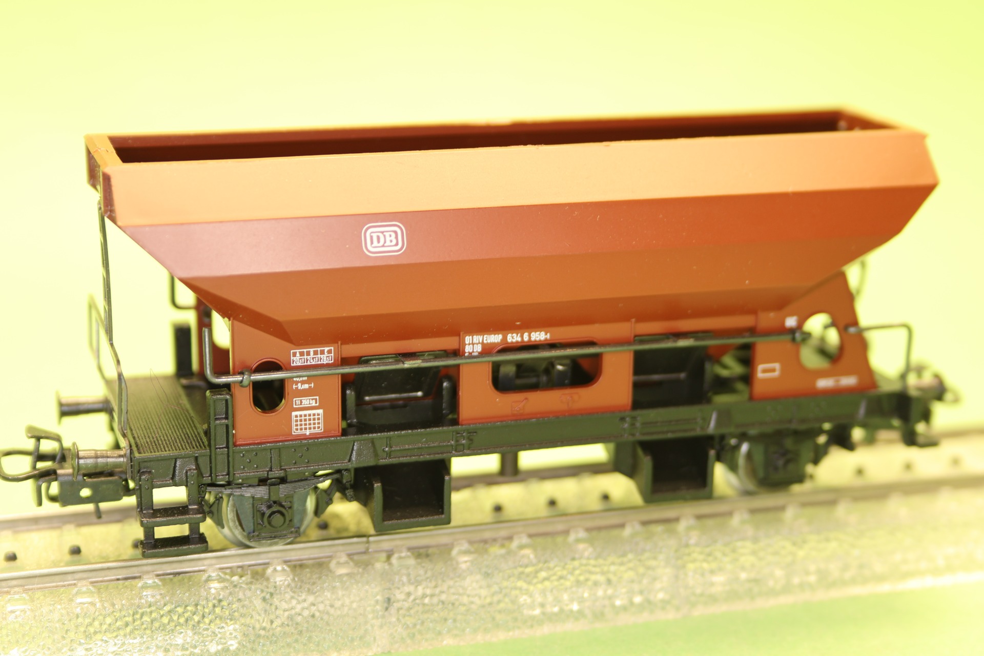 Model: Loskleppen door hendel of op afstand geregeld via ontkoppelrails om de kleppen te openen. Lengte over de buffers 11,2 cm.