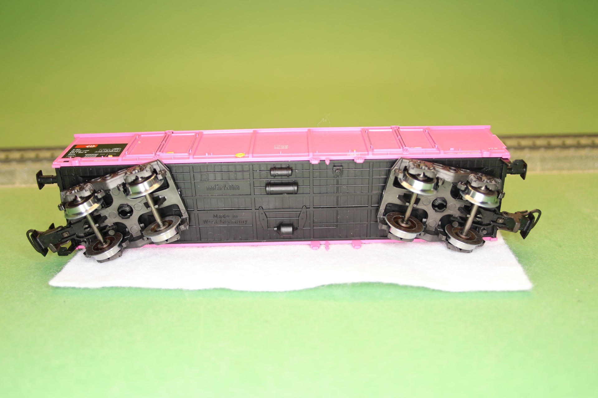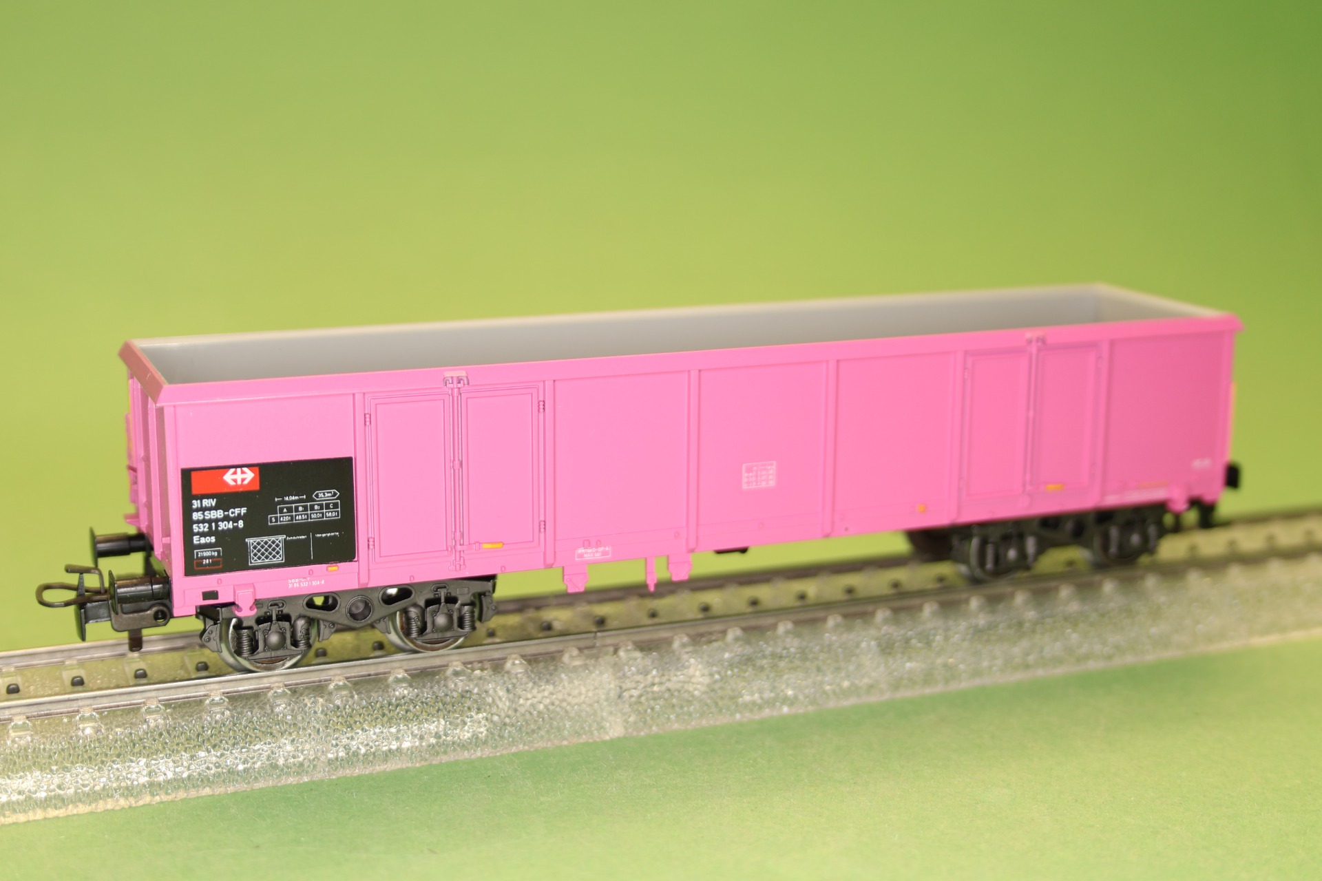 Open goederenwagon van het type Eaos van de Schweizerische Bundes Bahn (SBB) in roze uitvoering uit tijdperk V. De wagon heeft 2 draaistellen, 4 assen en heeft een totale lengte van 16,1 cm.
