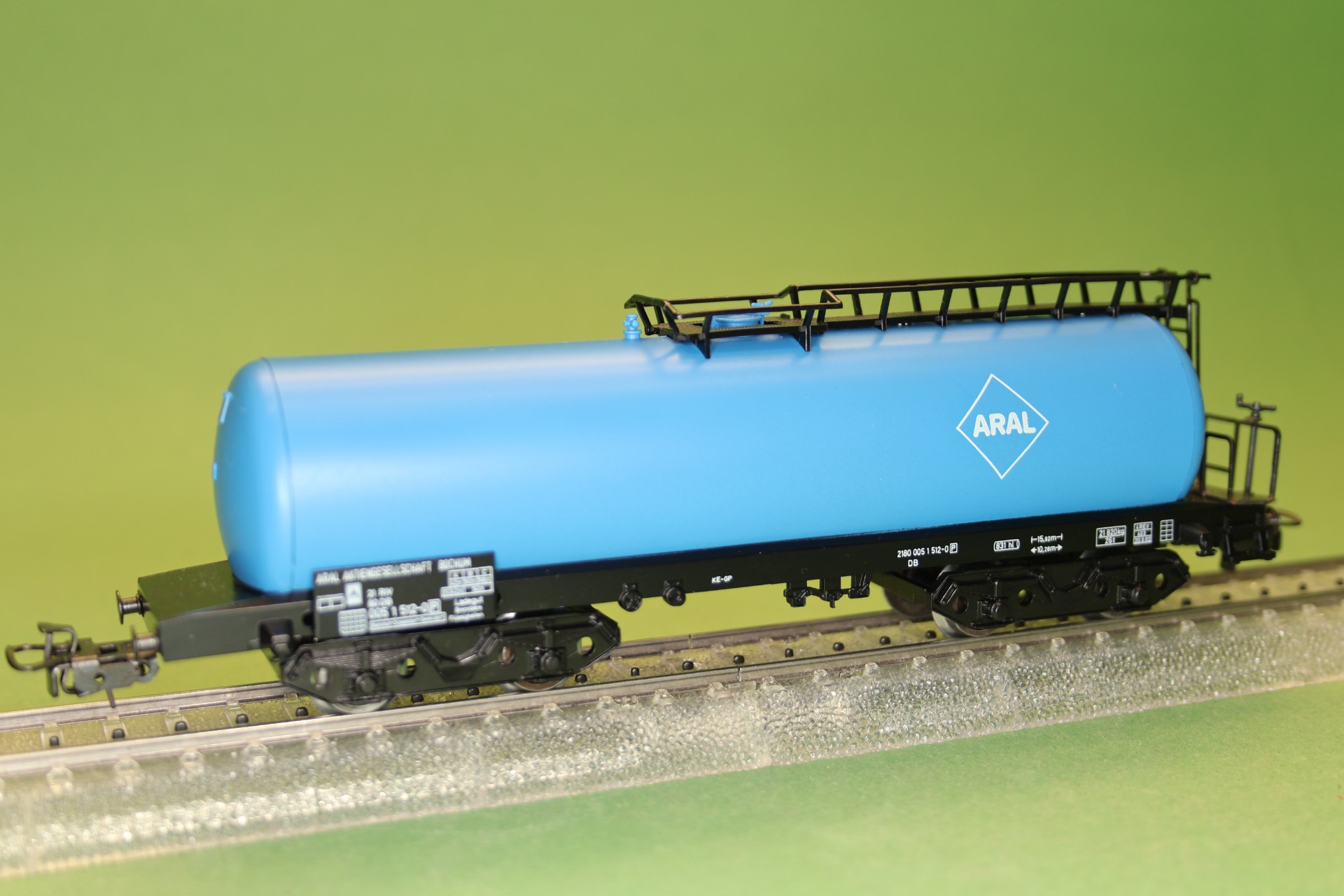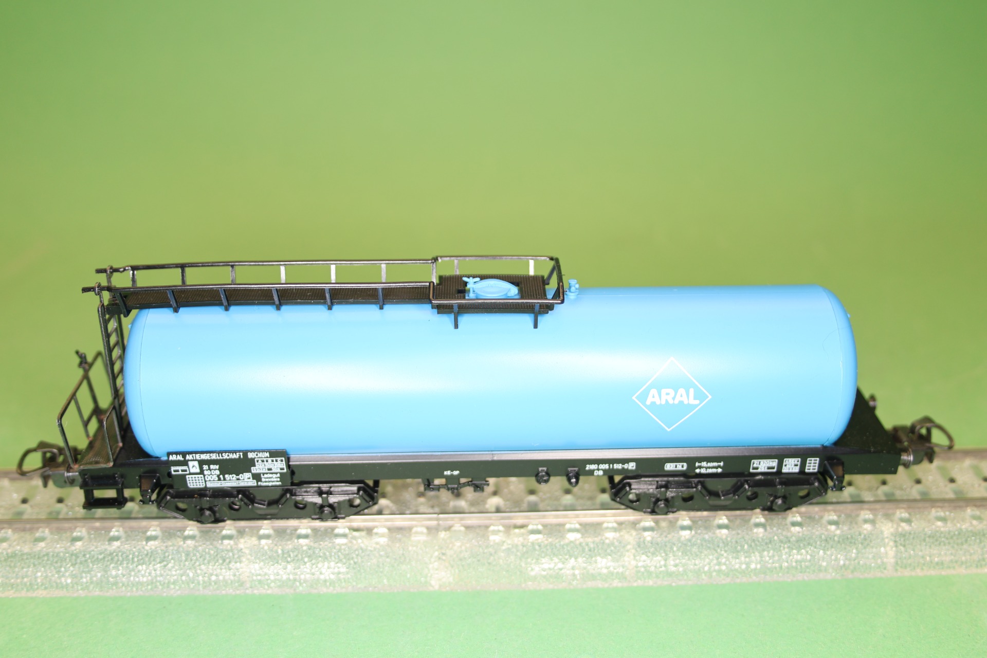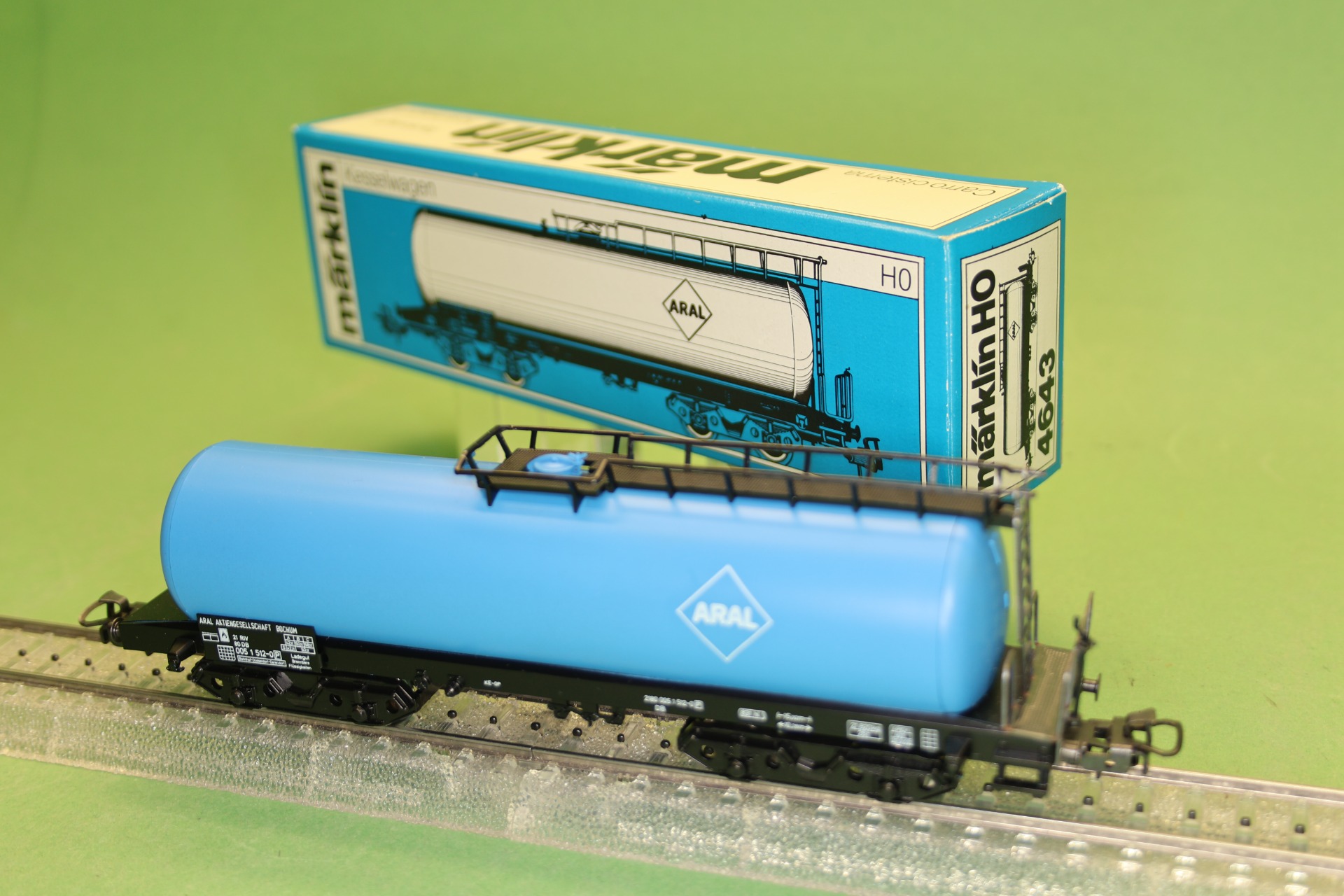 Model: De Märklin 4643 is een Duitse ketelwagon met opdruk "Aral" uit tijdperk IV ingedeeld bij de Deutsche Bundesbahn (DB). Het model heeft 2 draaistellen (4-assen) en heeft een lengte van 16,5 cm. Het model is voorzien van een remmersbordes en gemonteerde ladders.