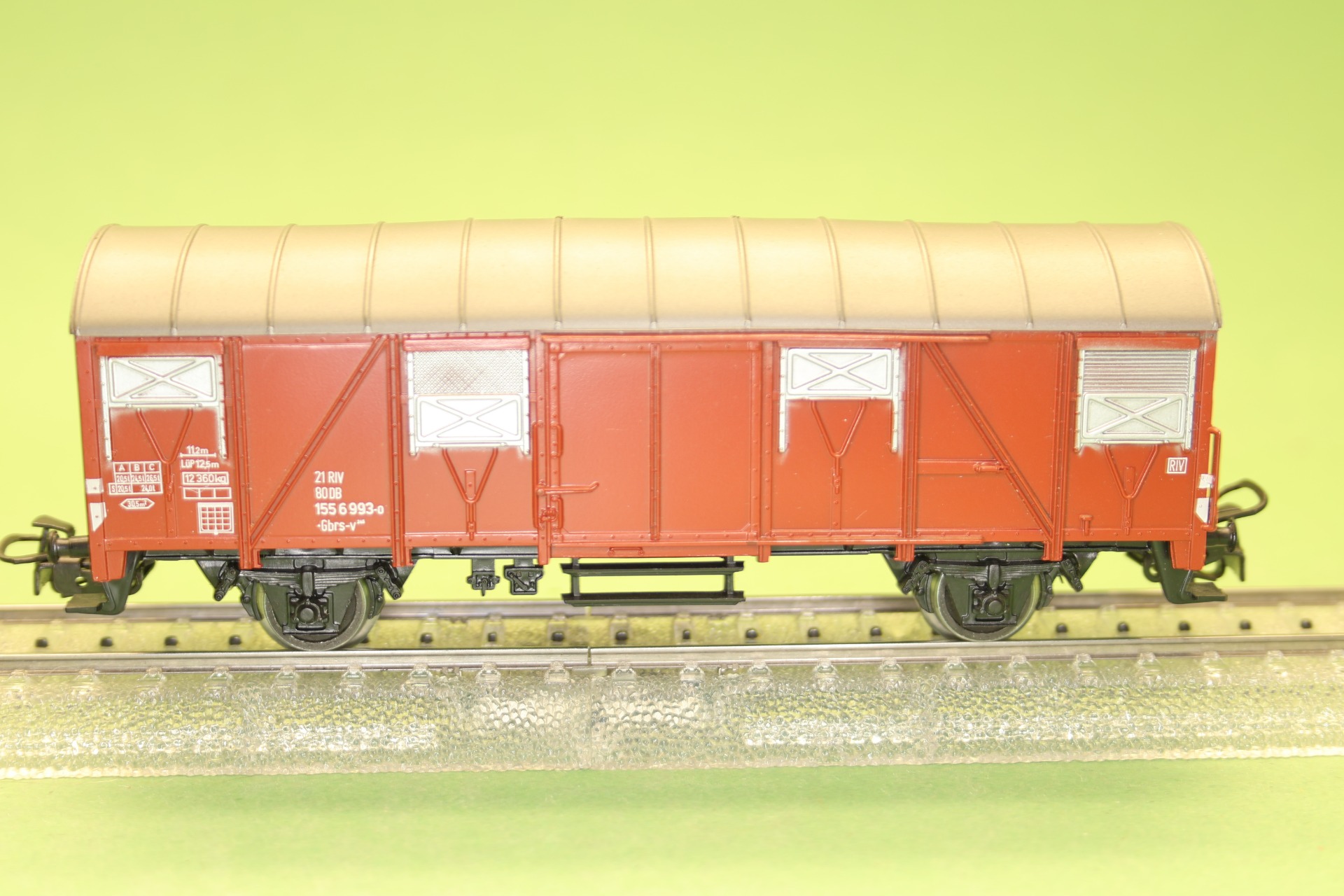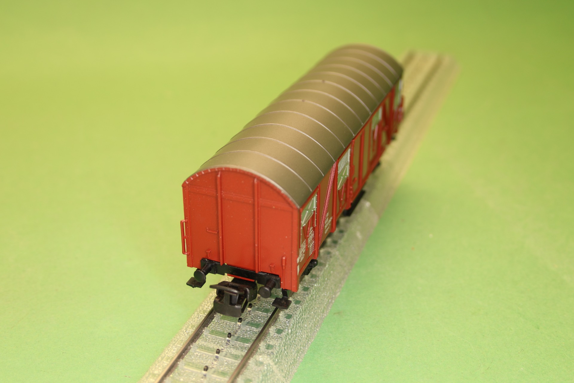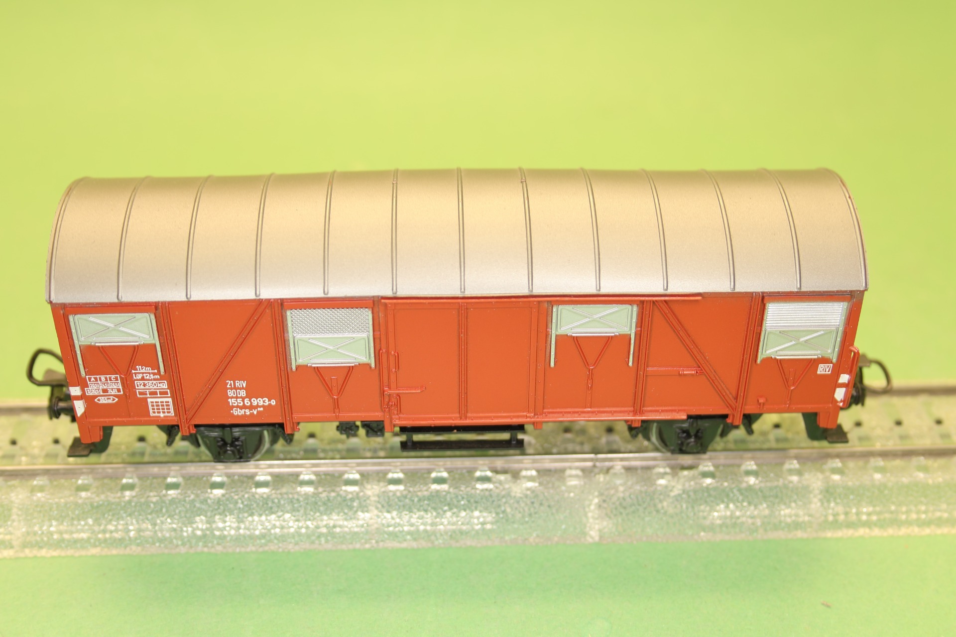 Gesloten goederen wagon van het type Glmmehs 57 van de Deutsche Bundesbahn (DB) uit tijdperk III. De wagon is roodbruin met een zilverkleurig dak. De wagon heeft 2 assen en heeft een totale lengte van 13,4 cm. De wagon is voorzien van relex kortkoppelingen (RK).
