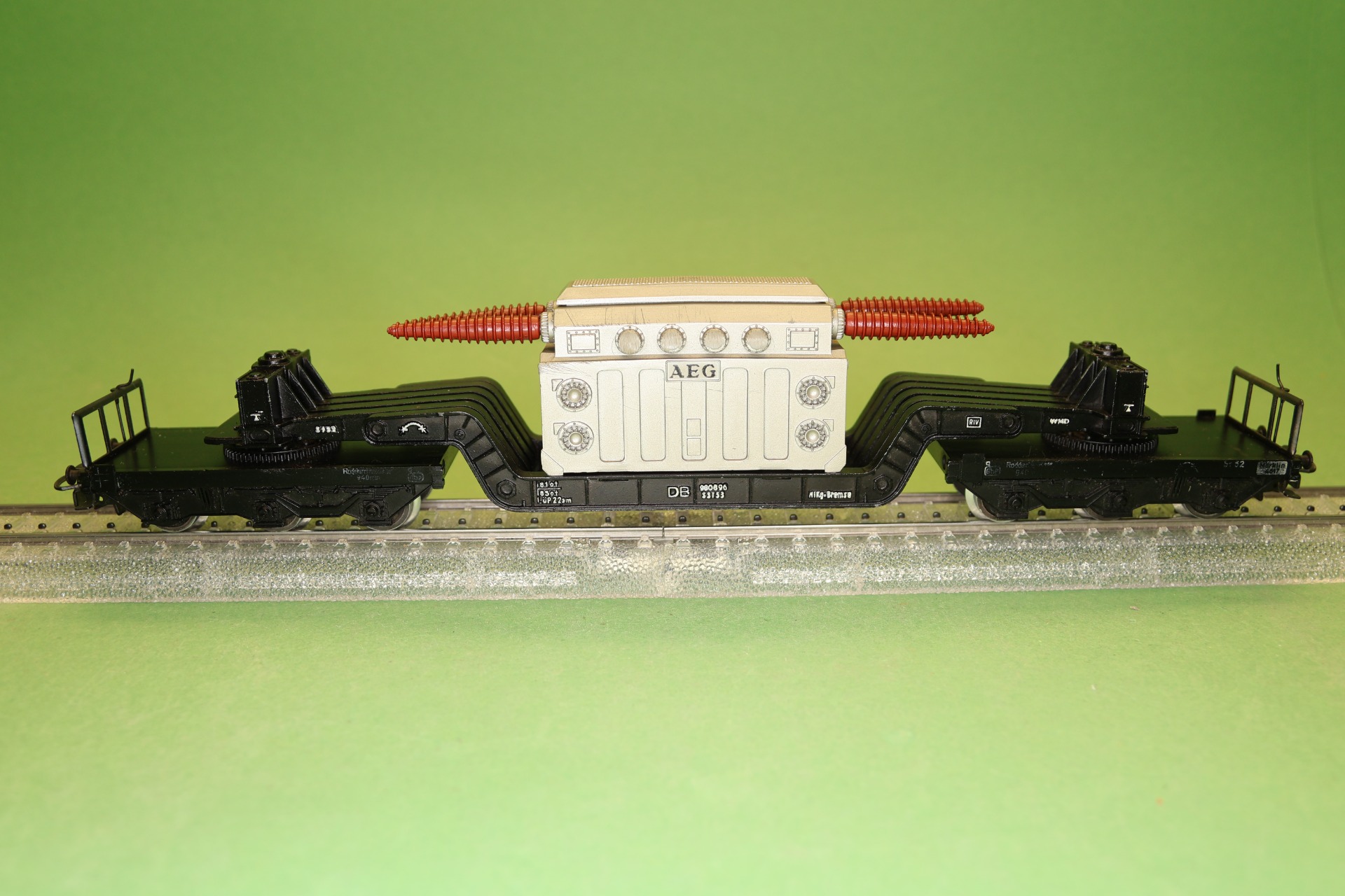 Dieplader wagon (ook wel kuilwagen genoemd) van het type SSI 53, van de Deutsche Bundesbahn (DB) uit tijdperk III. De wagon is voorzien van een zilverkleurige transformator met een bord van "AEG". De wagon heeft een lengte van 25 cm en is voorzien van beugel-koppelingen (BK). Er zijn door Märklin meerdere typen van deze kuilwagen uitgebracht die onderling verschillend kunnen zijn wat kleur, belettering, opschriften en soort belading betreft. De dieplader is van het type SSI 53 v.d. DB. Een 6-assige wagen van gietwerk/kunststof. Wagenchassis met verlaagd laadplateau en 2 draaistellen. Belading: afneembare transformator of kist. Lengte over de buffers 25 cm.