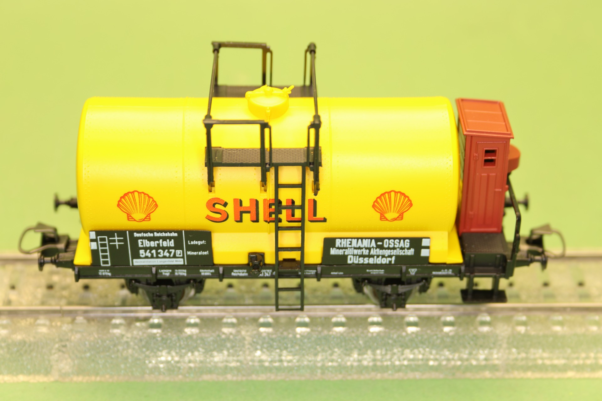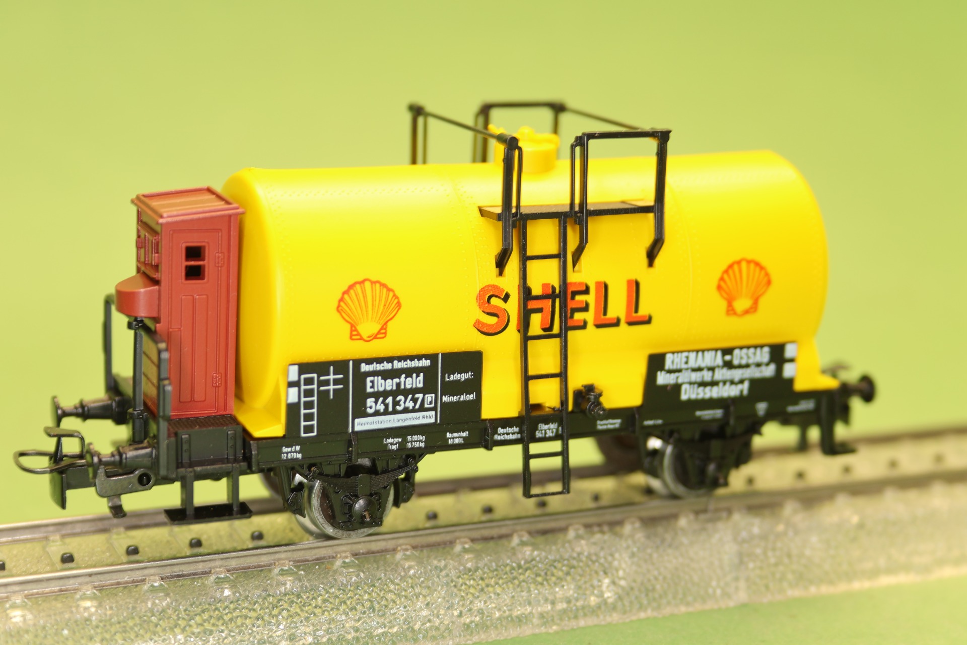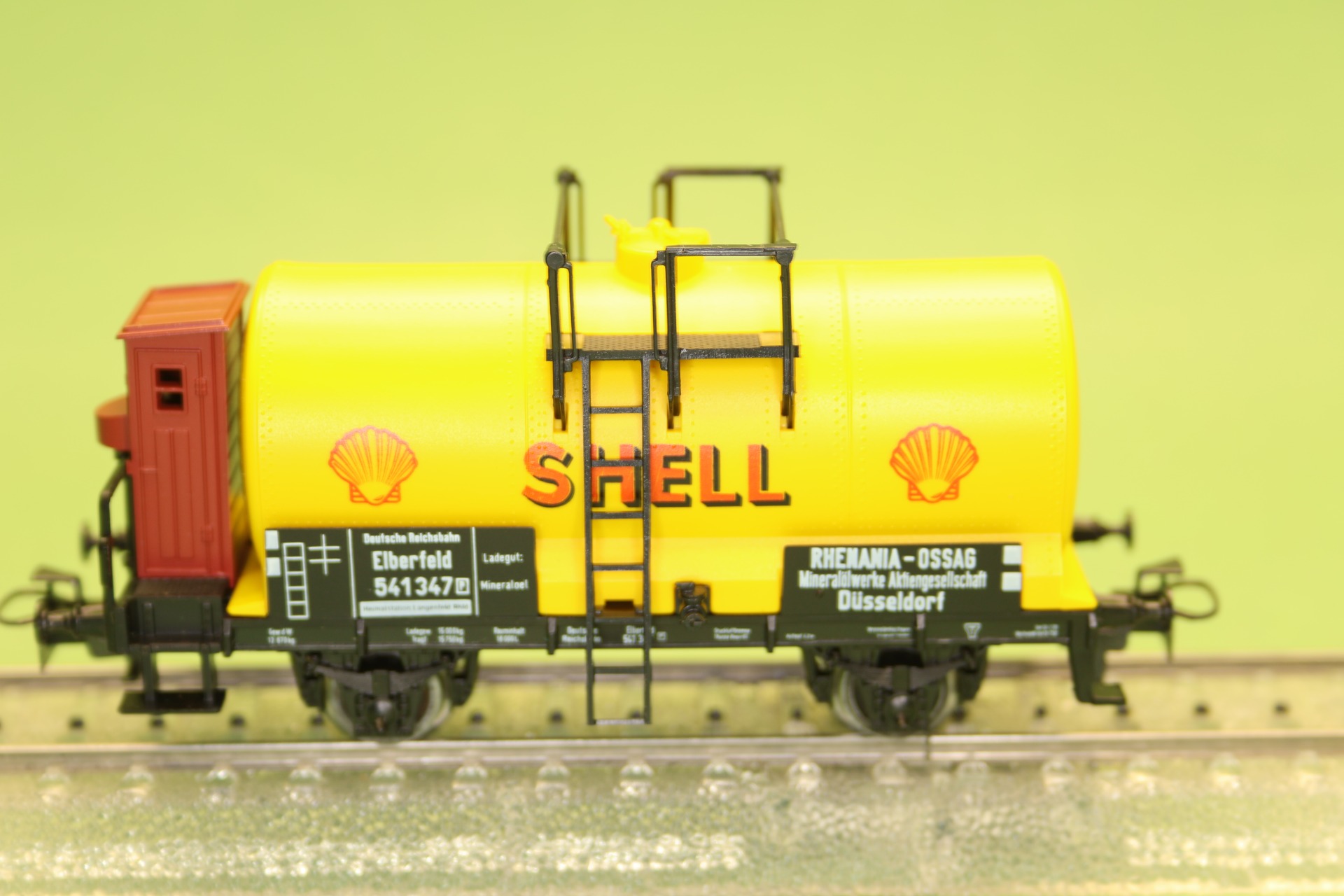 ketelwagon van "Shell" met remhuis, ondergebracht bij de Deutsche Reichsbahn. De wagon heeft 2 assen en heeft een totale lengte van 10,1 cm.