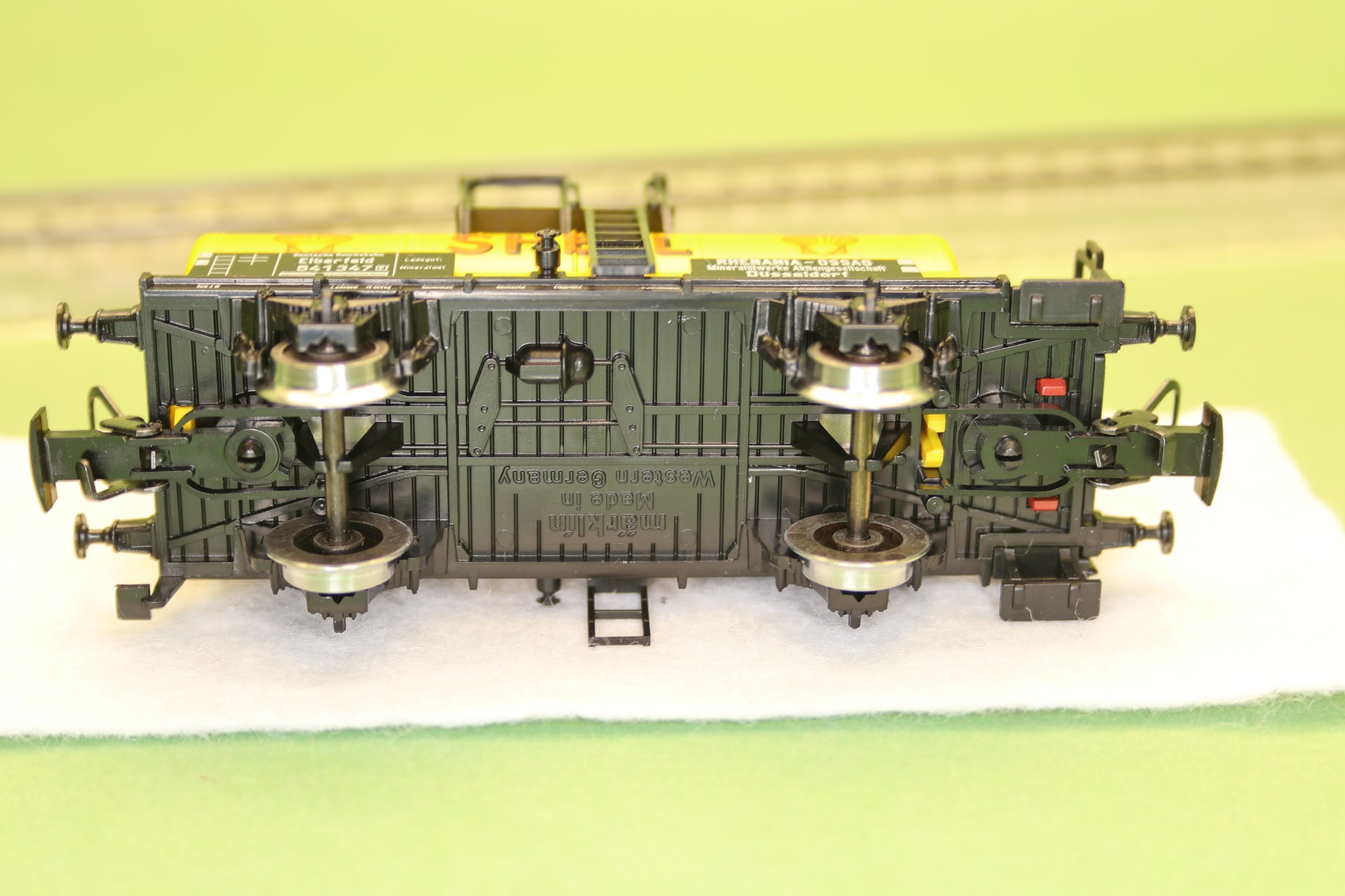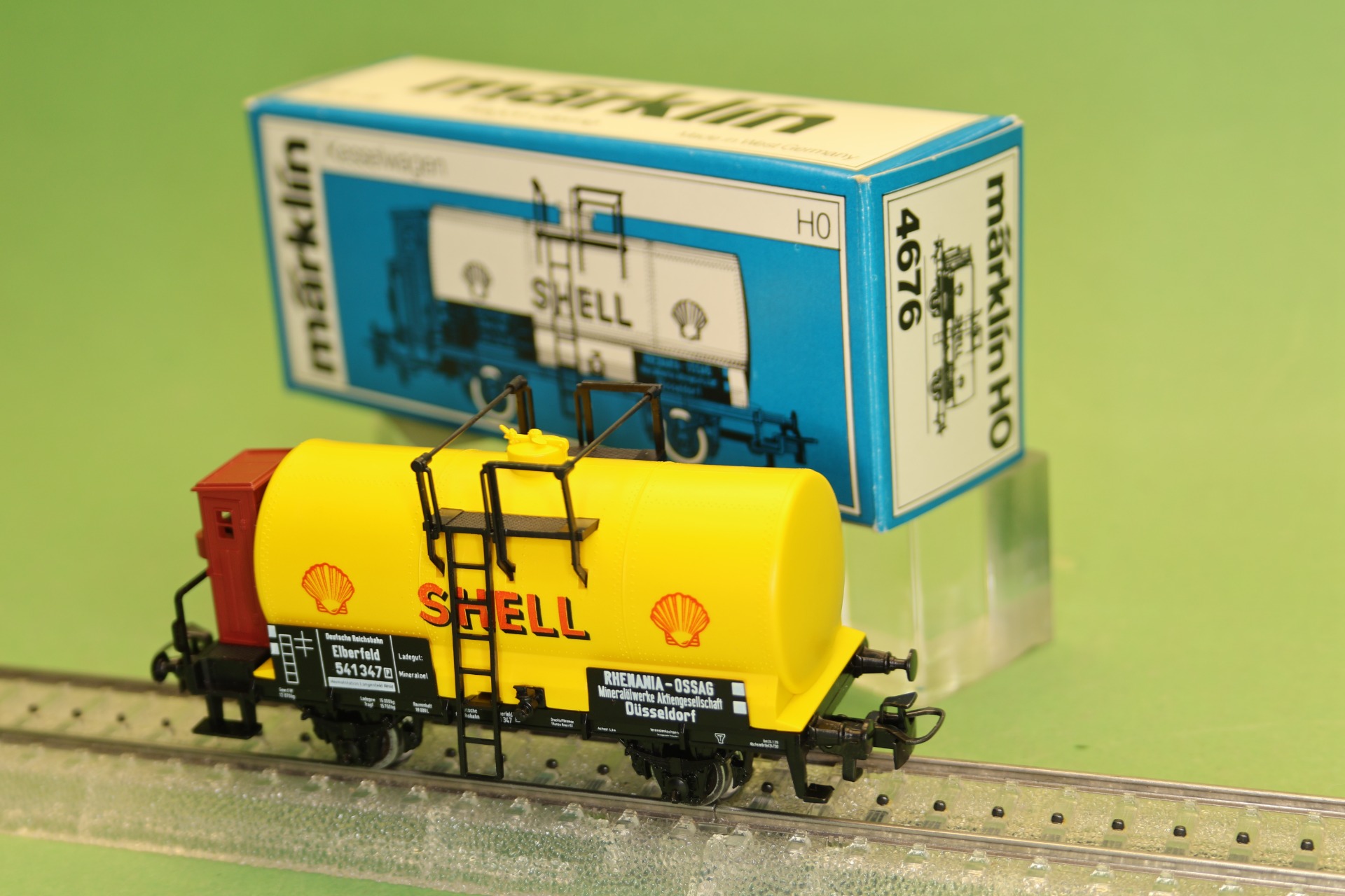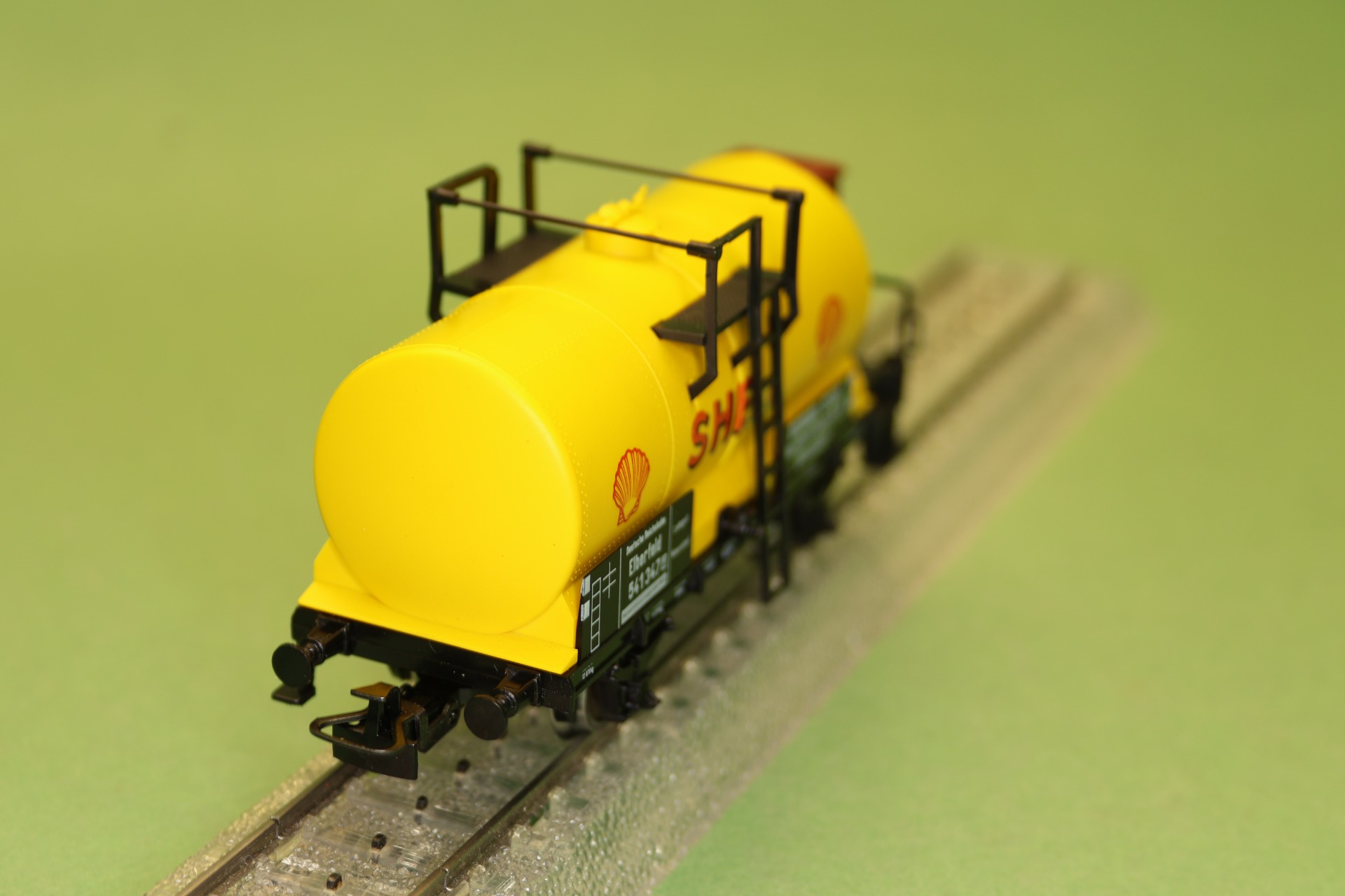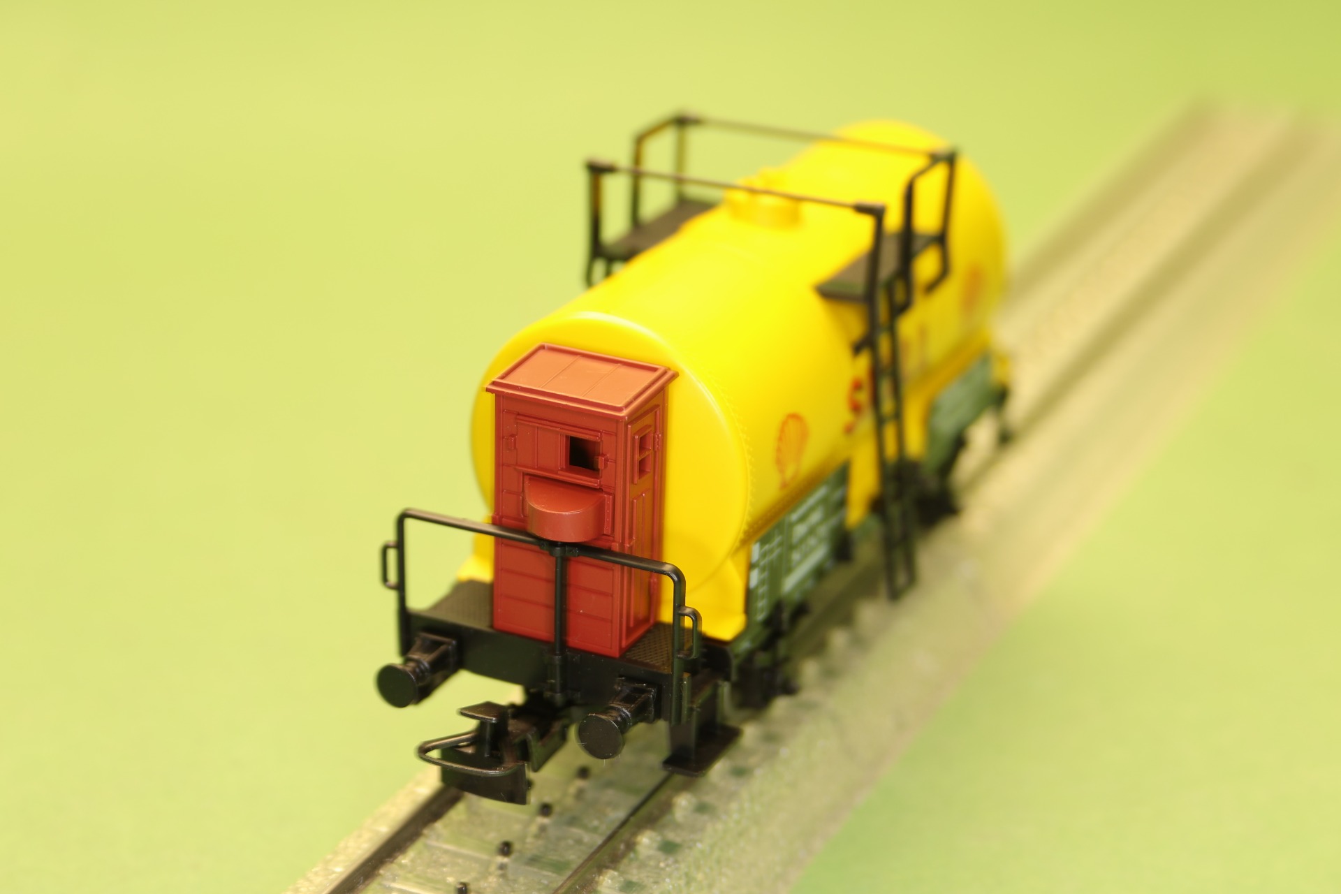 ketelwagon van "Shell" met remhuis, ondergebracht bij de Deutsche Reichsbahn. De wagon heeft 2 assen en heeft een totale lengte van 10,1 cm.