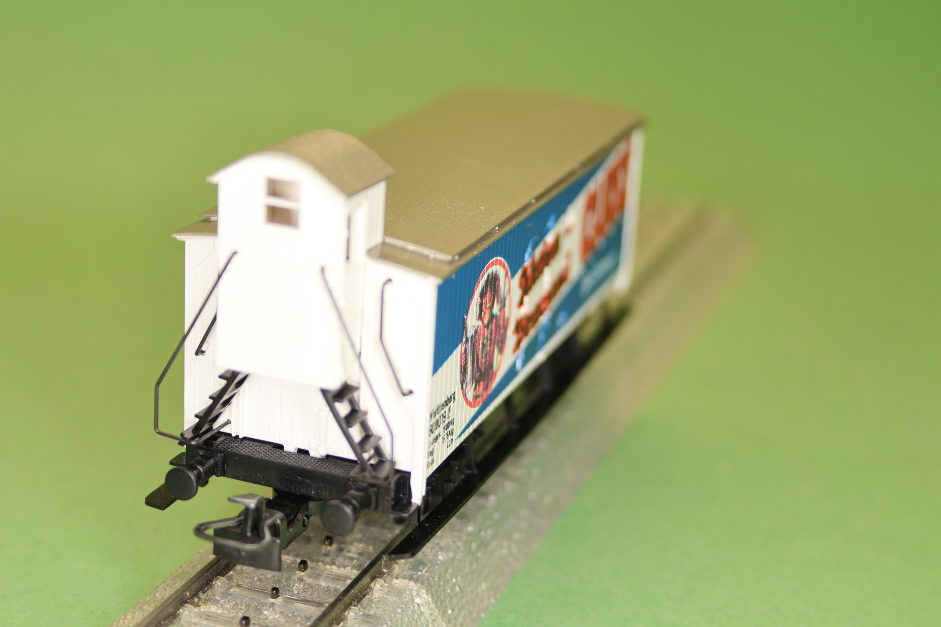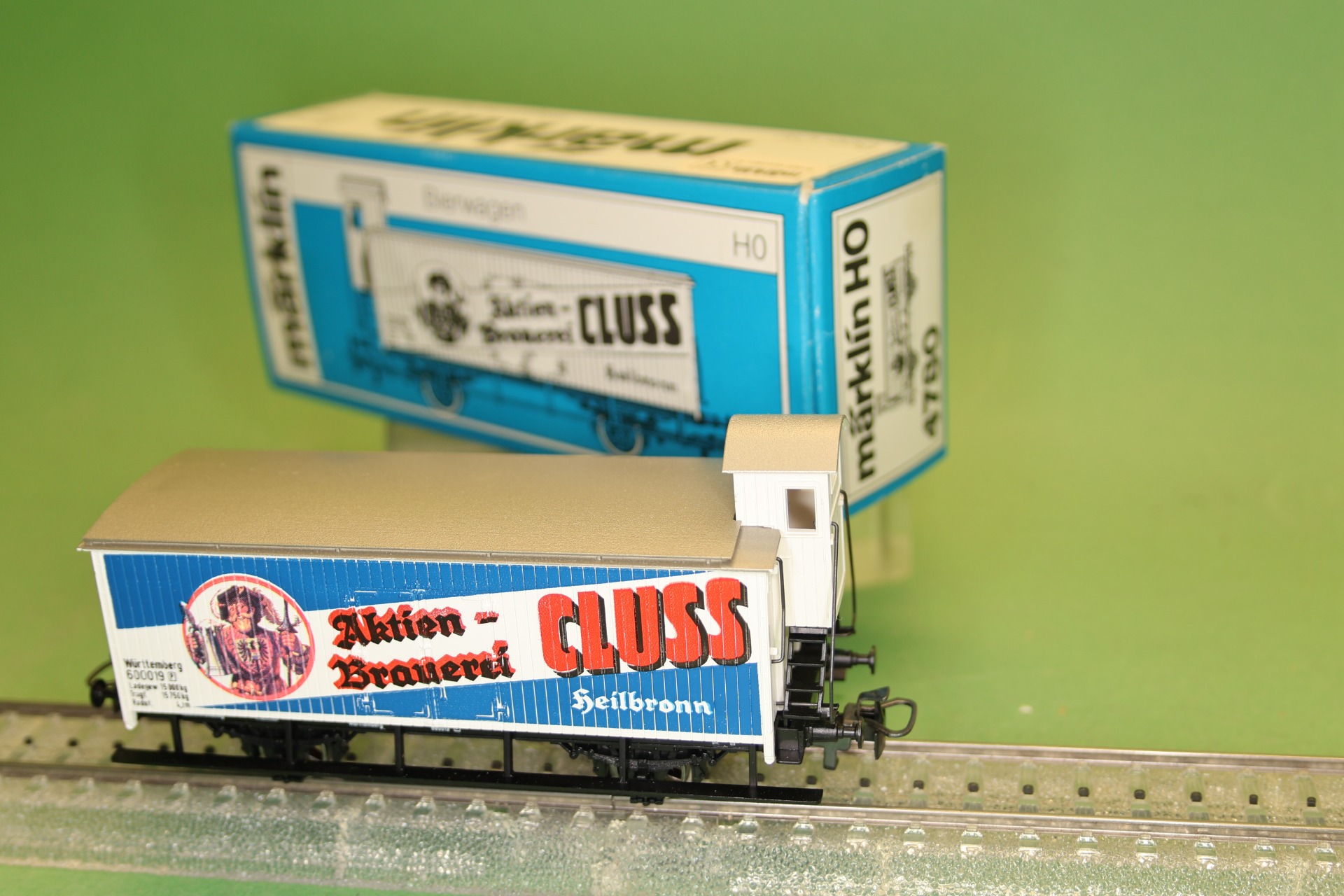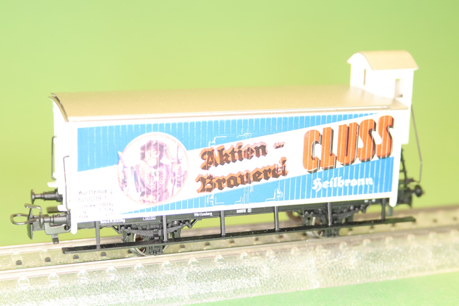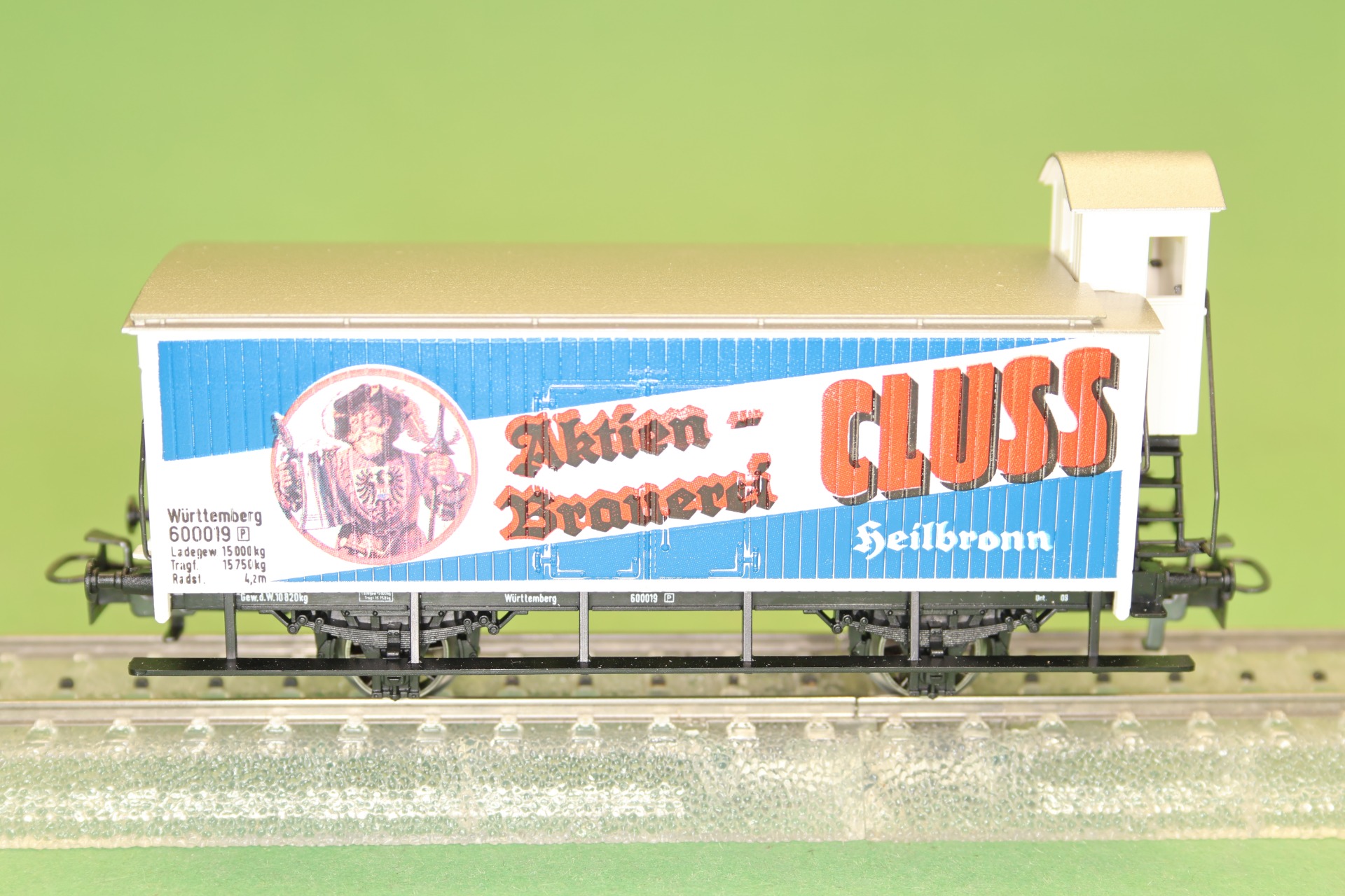 gesloten goederenwagon met remmershuis van de Königlich Württembergischen Staats-Eisenbahnen (K.W.St.E.) uit tijdperk I, met bierreclame van de "Aktienbrauerei CLUSS". Het model is voorzien van Relex koppelingen. Lengte van de wagon over de buffers is 11 cm.