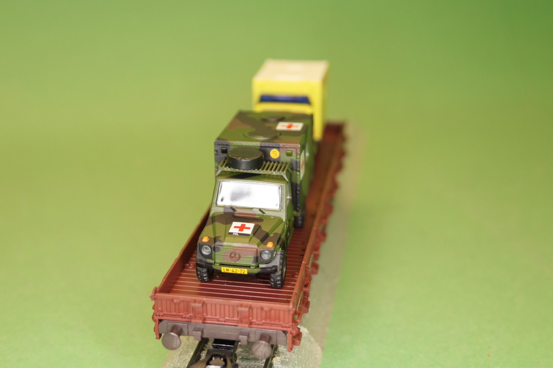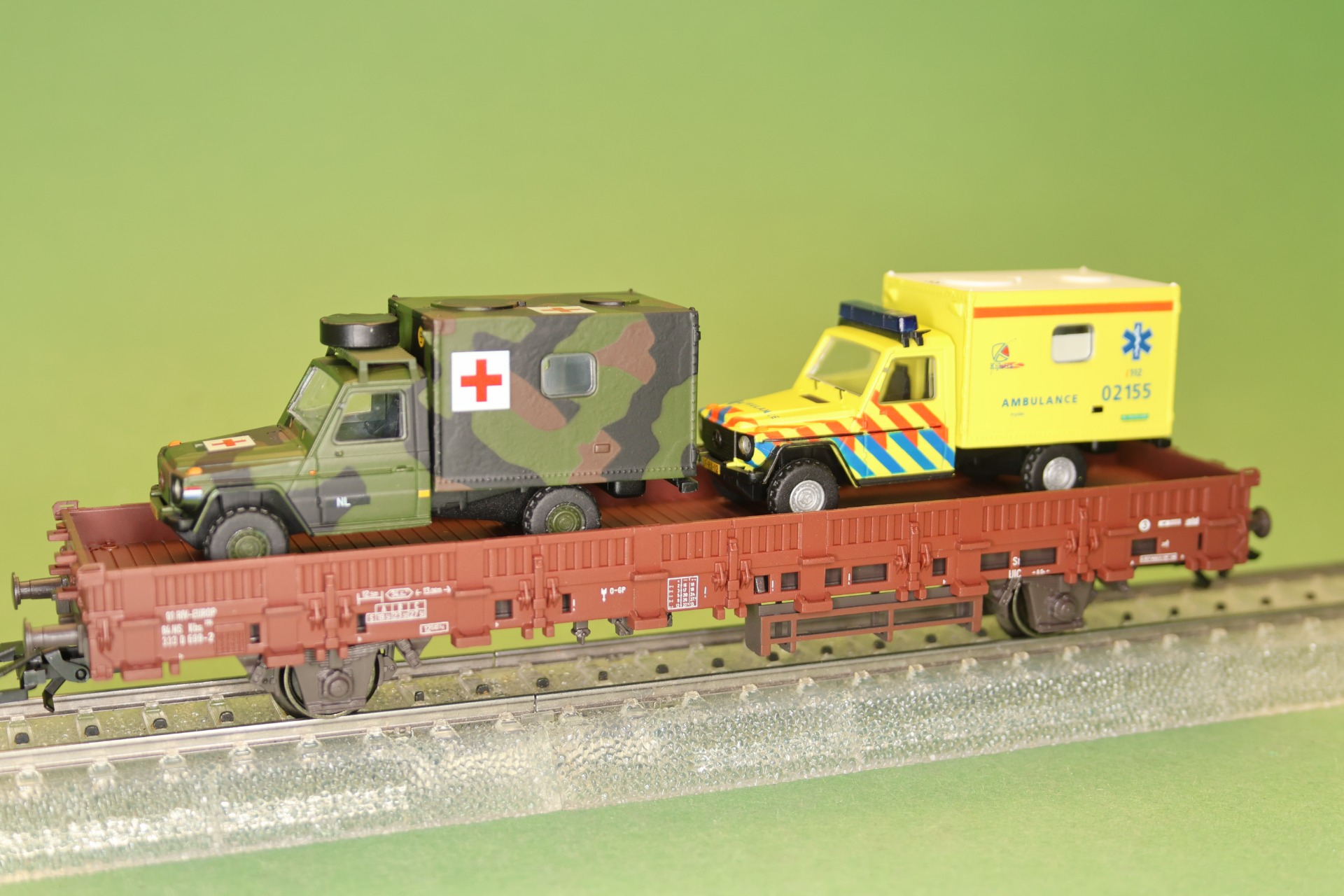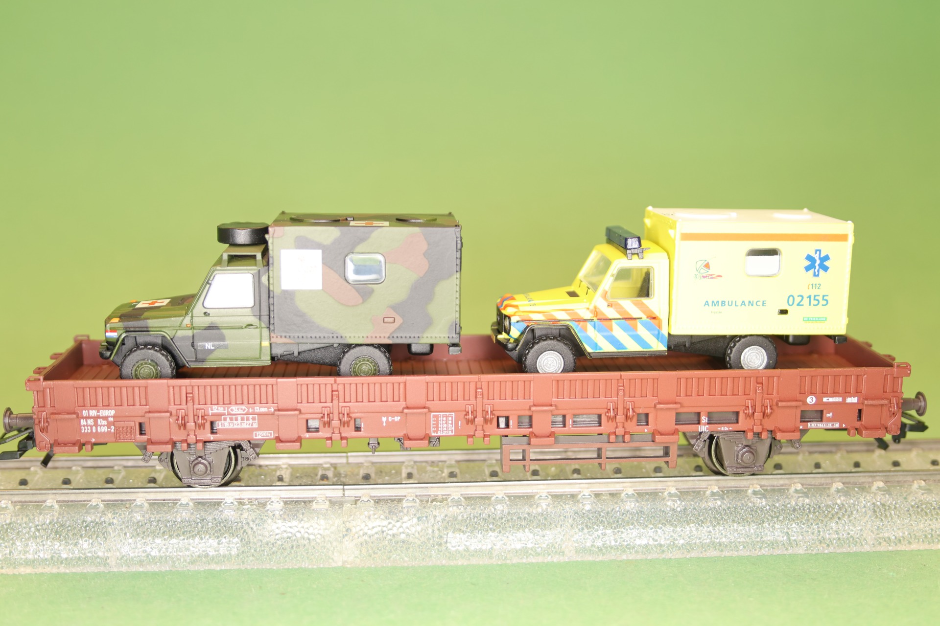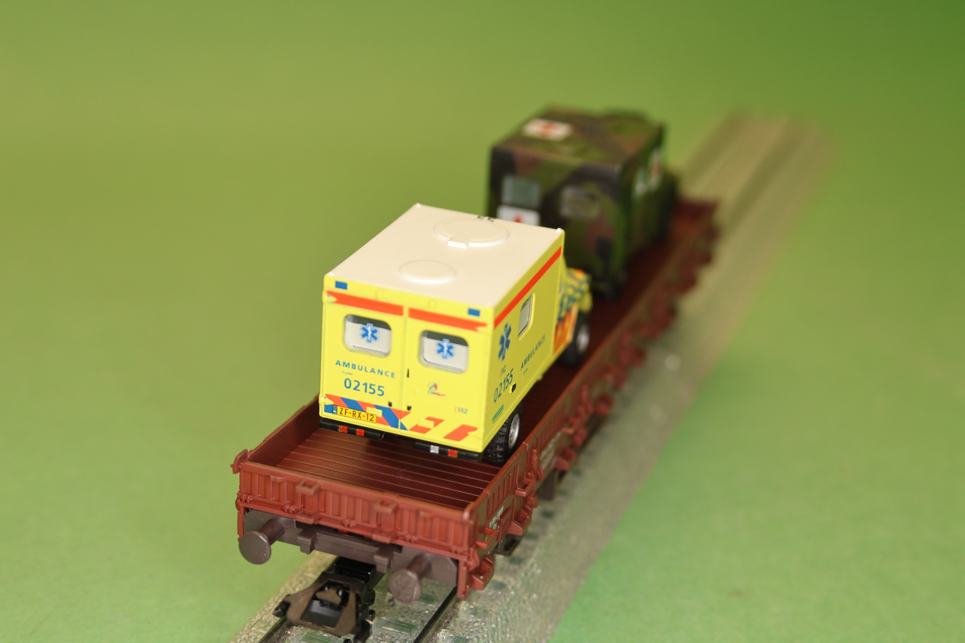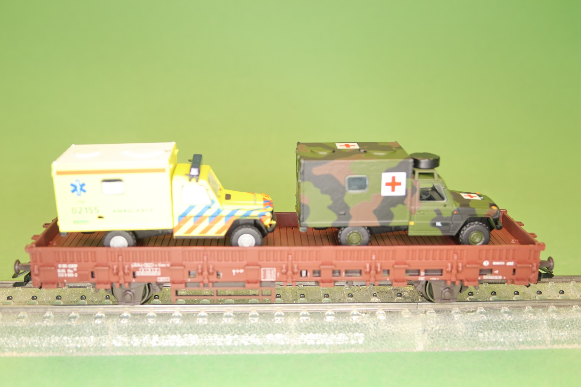 Märklin 46968 4MFOR Lageboordwagen KBS met 2 mercedes G Ambulancewagen