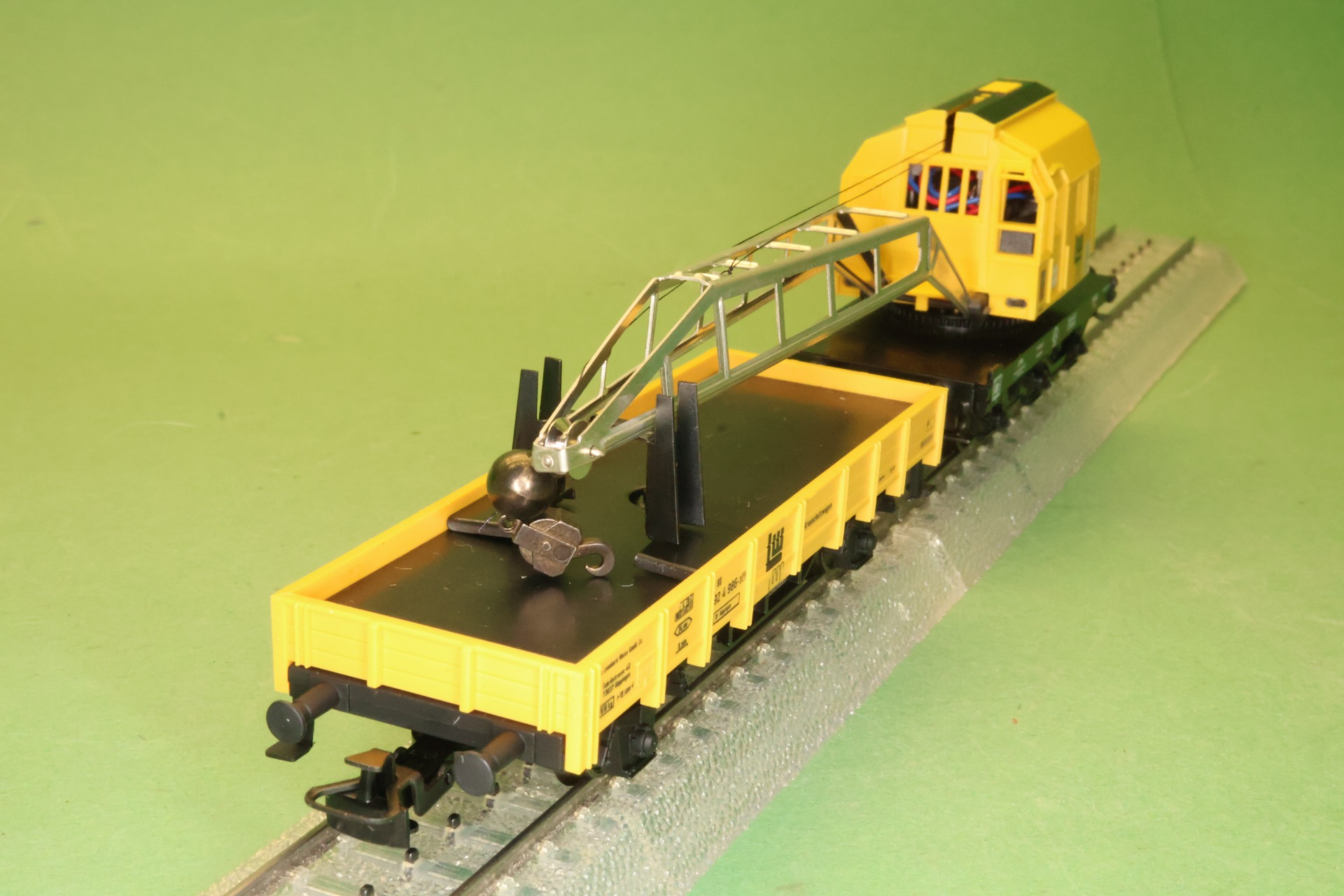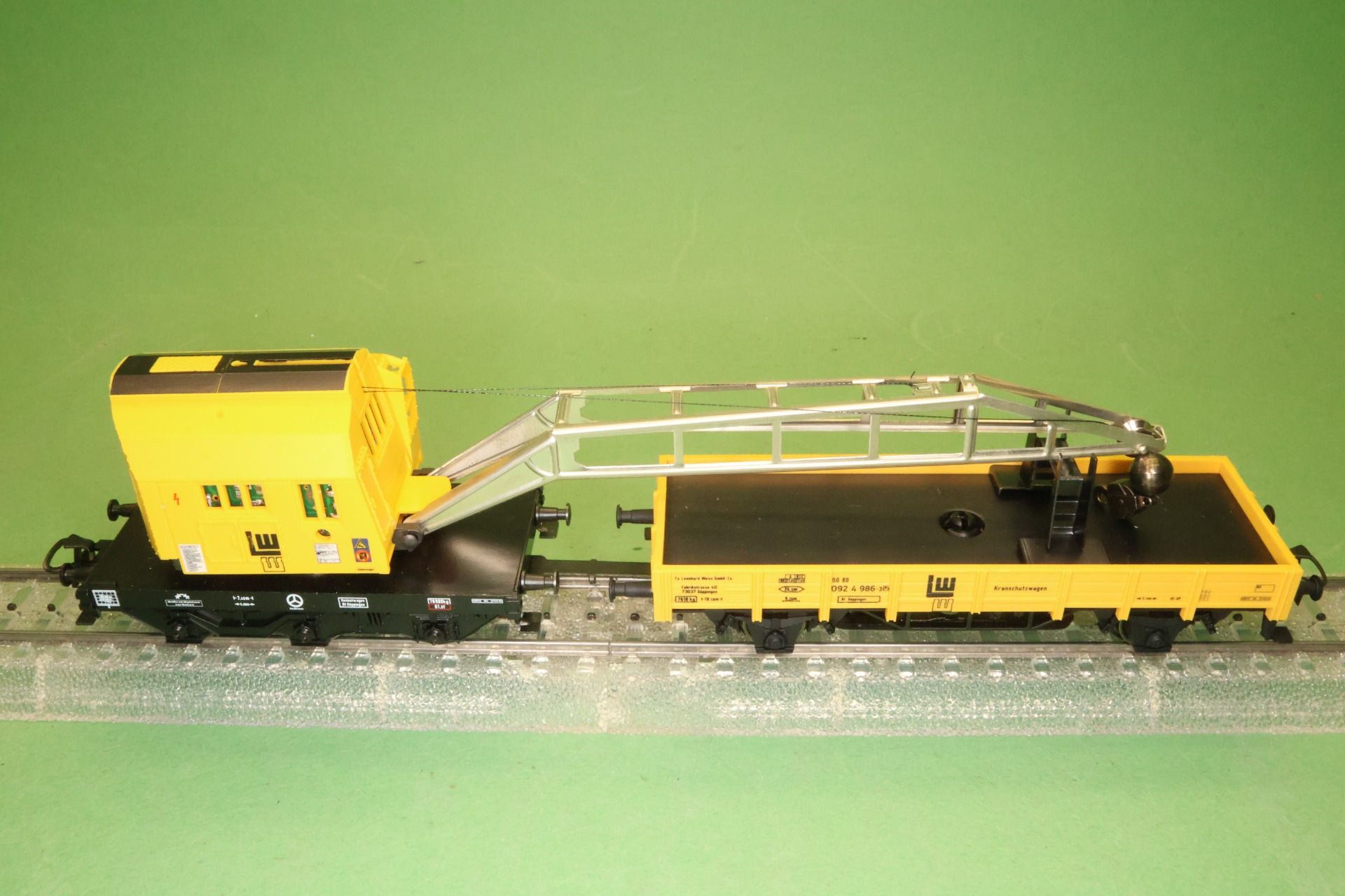 Model: Kraanwagen met 3 ingebouwde piëzo-aandrijvingen en Digital-decoder in een speciale uitvoerin. Kraanwagen en kraanhulpwagen vast gekoppeld. Kraanhulpwagen met hulpsteunen voor het afleggen van de kraangiek. Kraanhulpwagen met vast gemonteerd sleepcontact voor de voeding. Relex-koppelingen. Totale lengte over buffers 20,8 cm.
