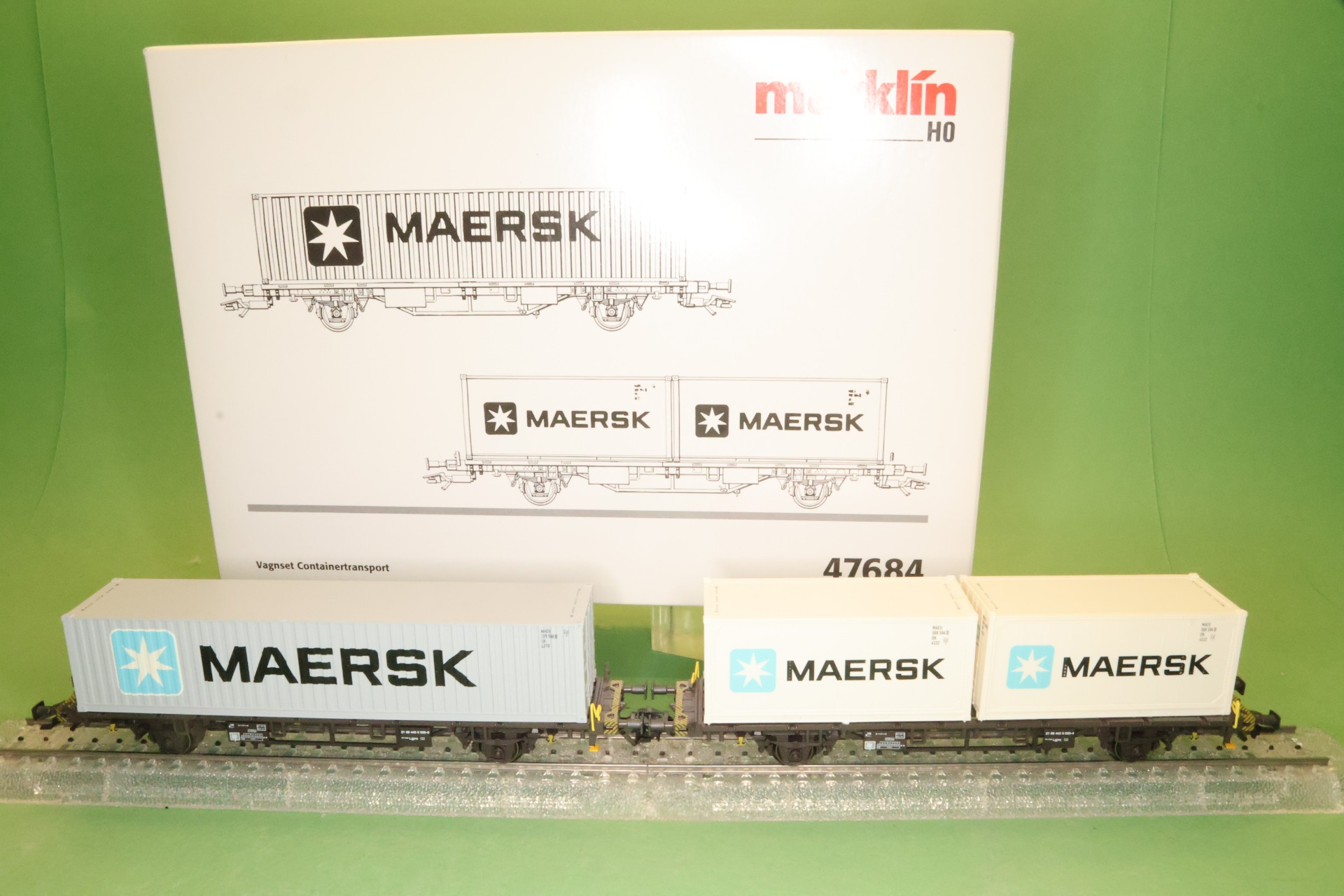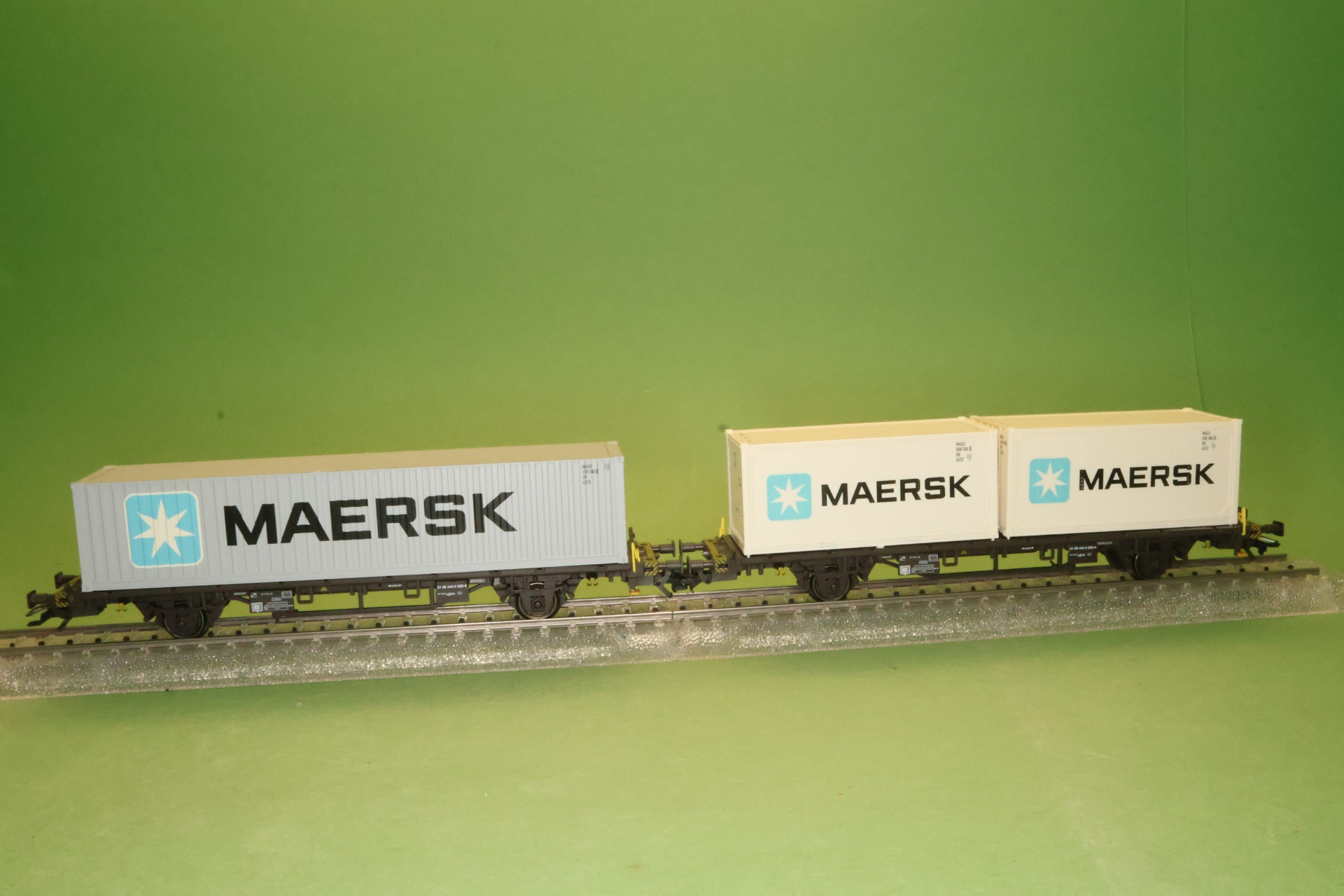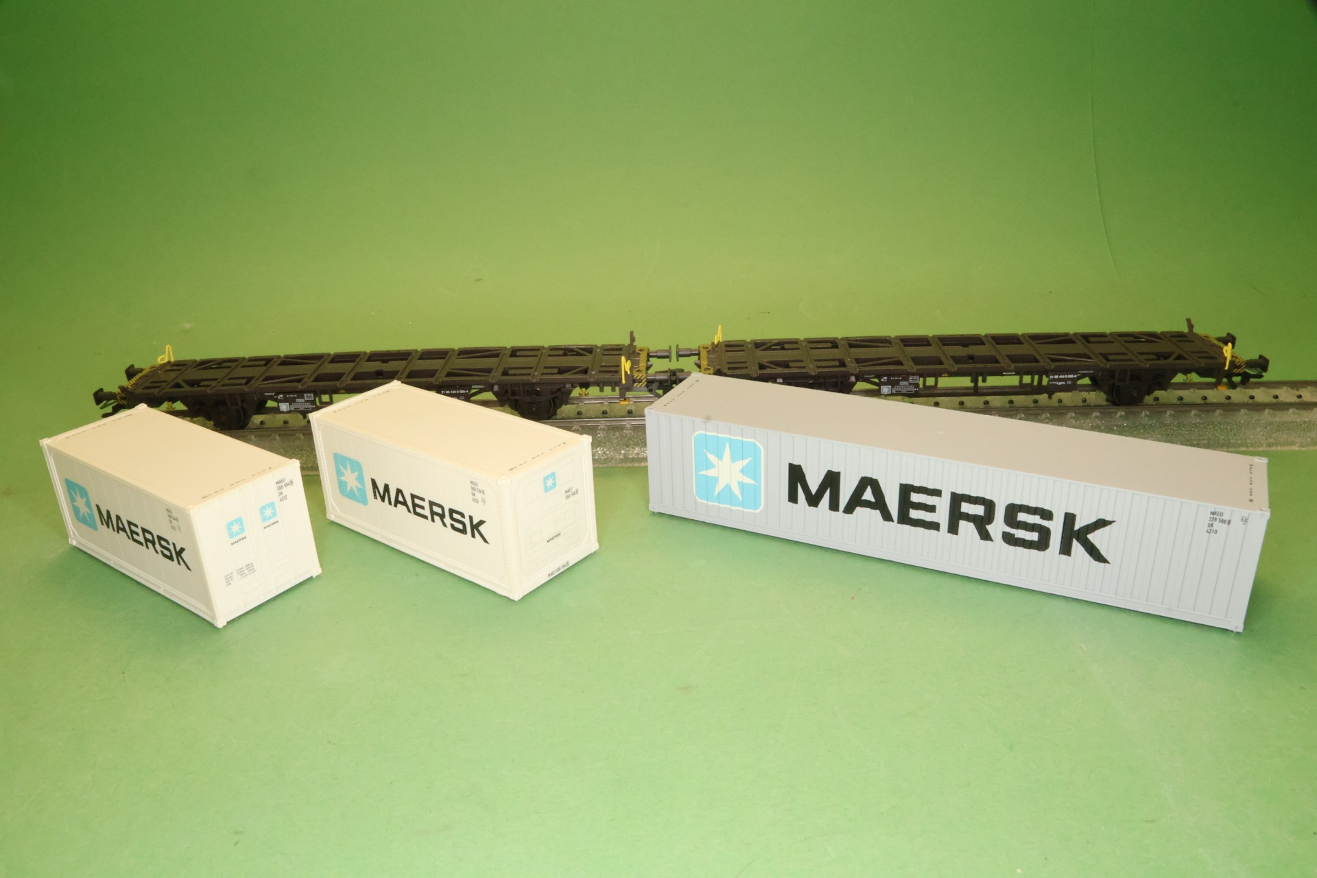 Type Lgjns van de Deense Staatsspoorwegen (DSB). Type met trekwerk. Container van de firma Maersk met 40 foot- en 20 foot-lengte.