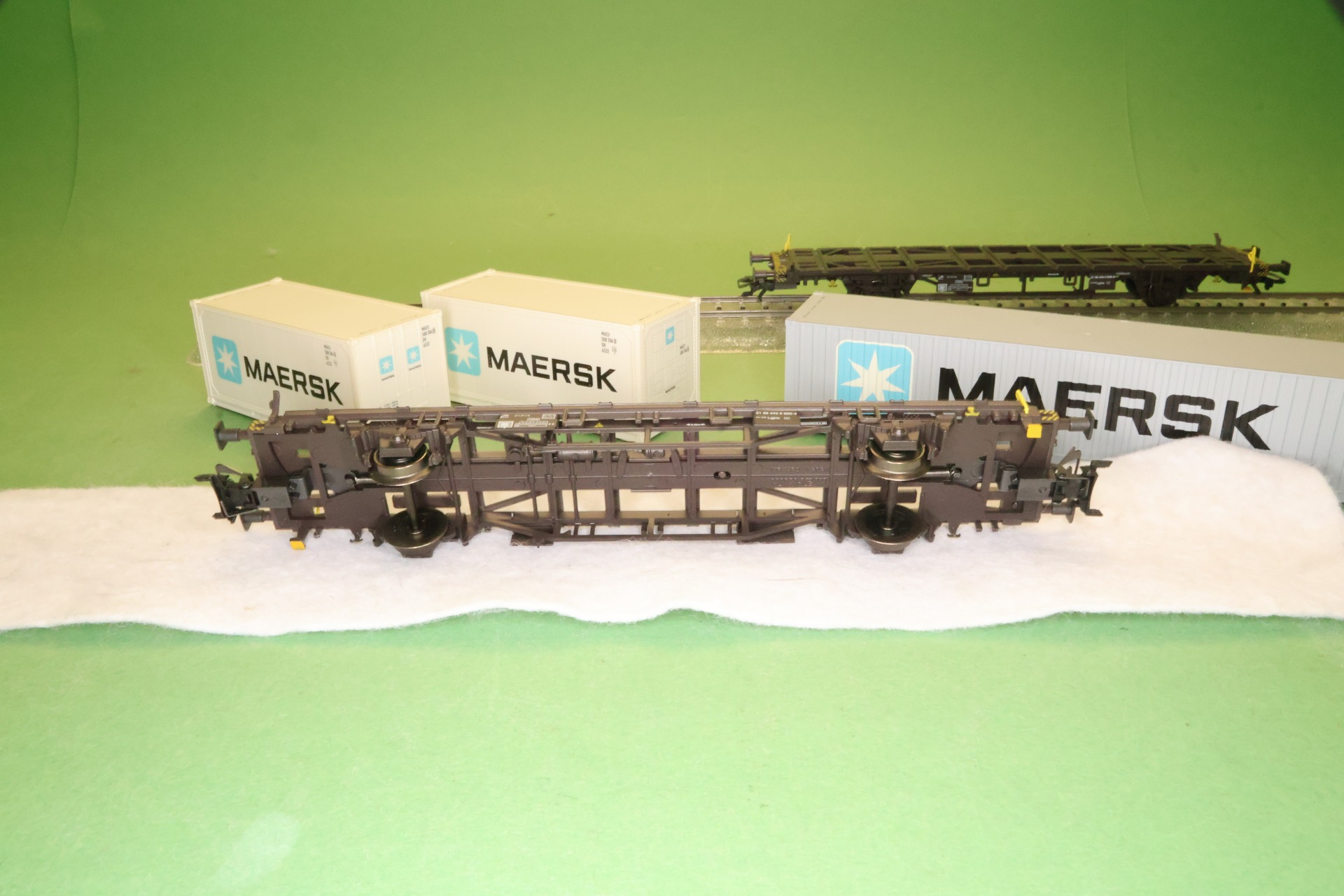 Model: Laadvlak met doorbroken frame. Beladen met 3 afneembare containers. Wagen en containers met verschillende bedrijfsnummers. Lengte over de buffers 34,1 cm.