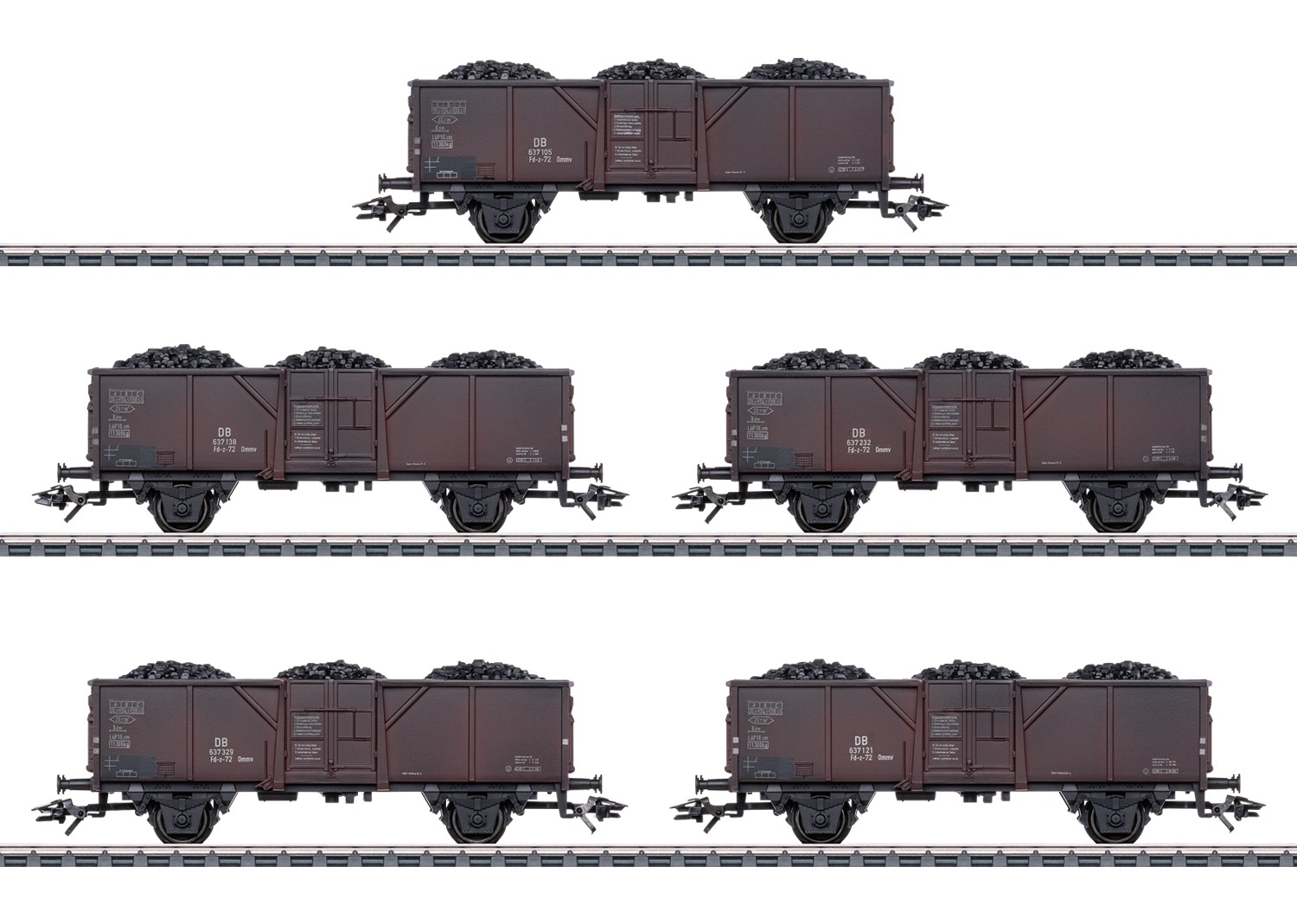 Modellen: Met kortkoppeling in een schacht die niet meeveert.Met voorbeeldgetrouwe verouderingssporen.Allevijf de wagens hebben verschillende wagennummers.