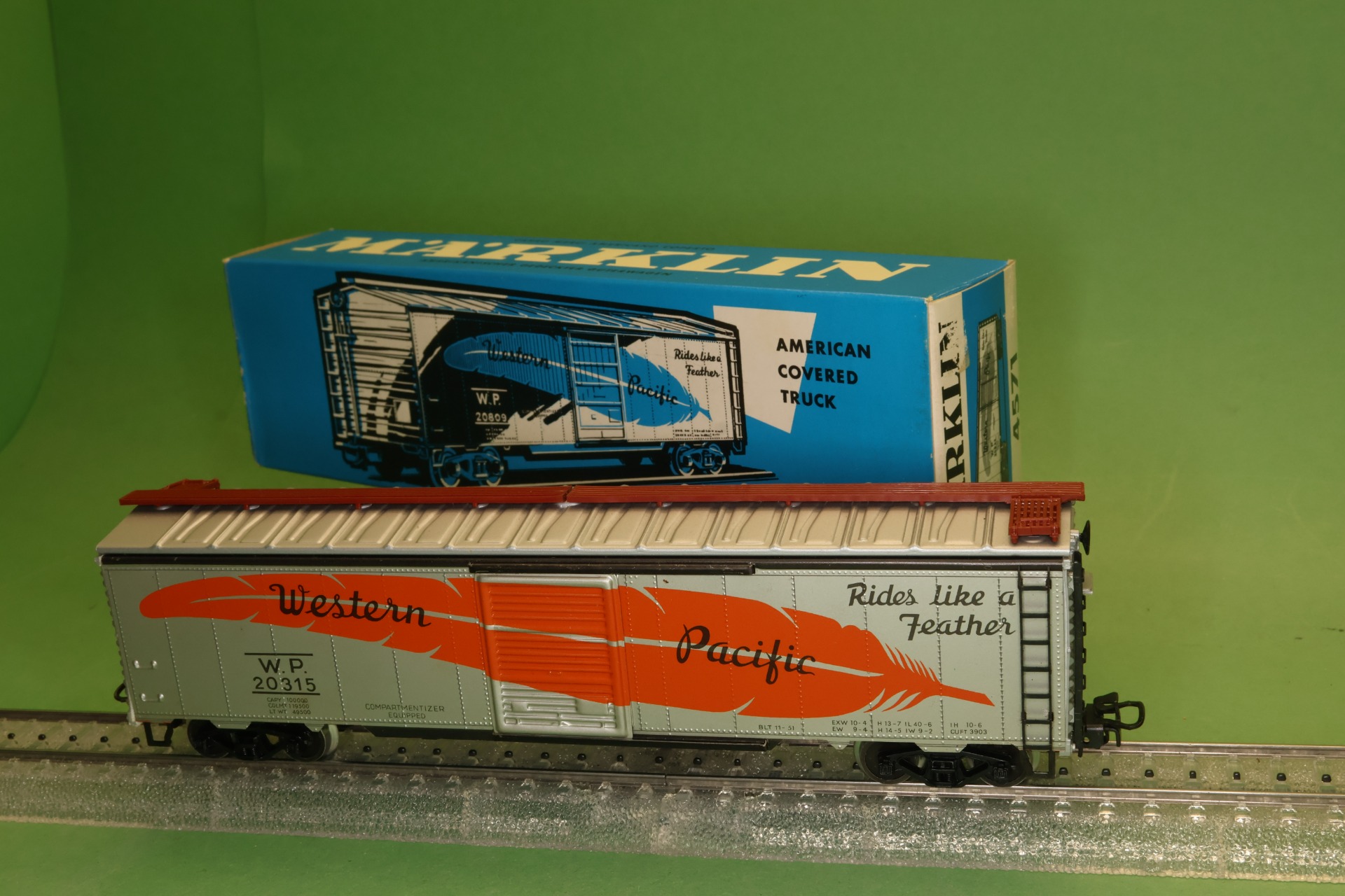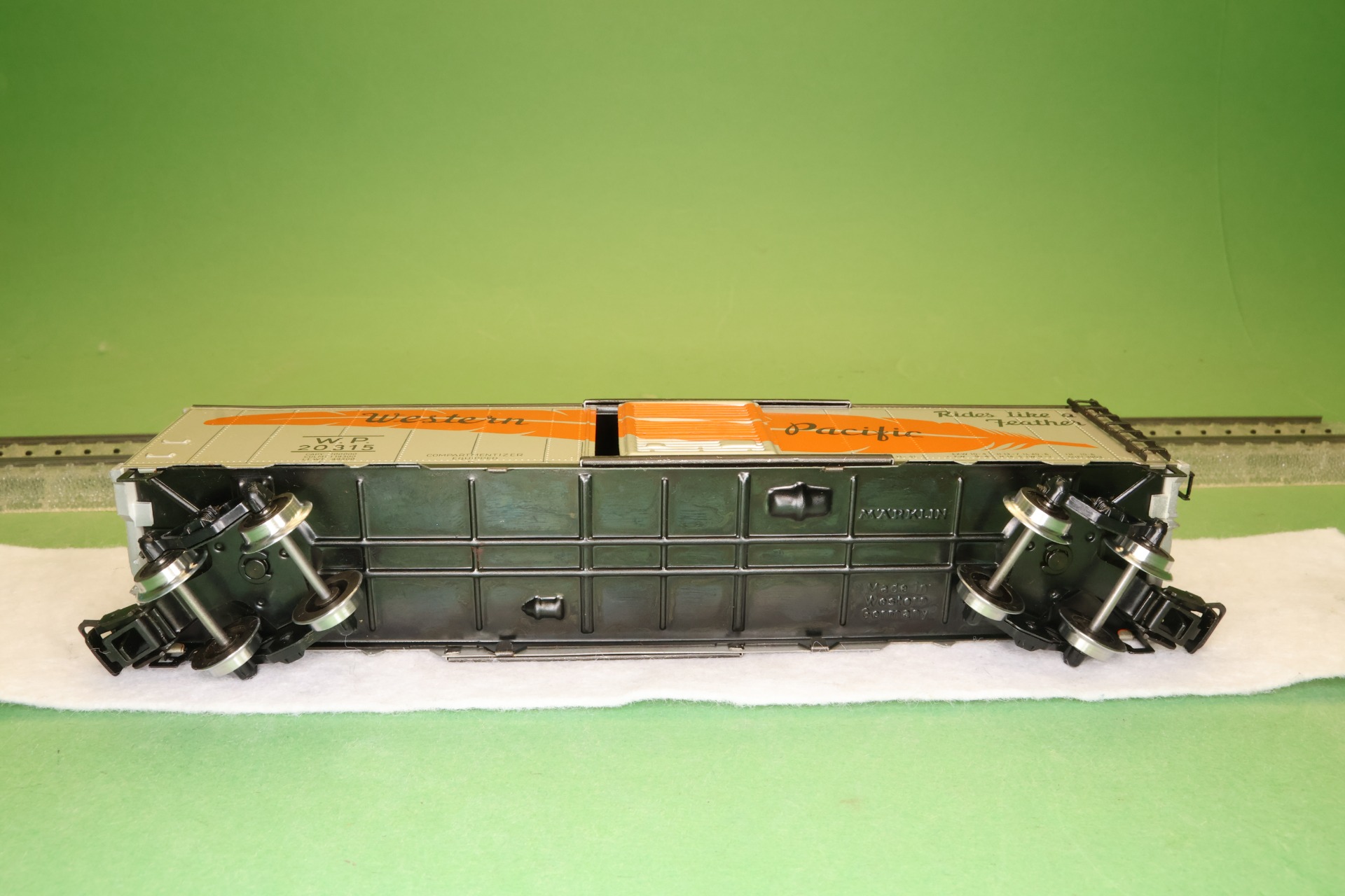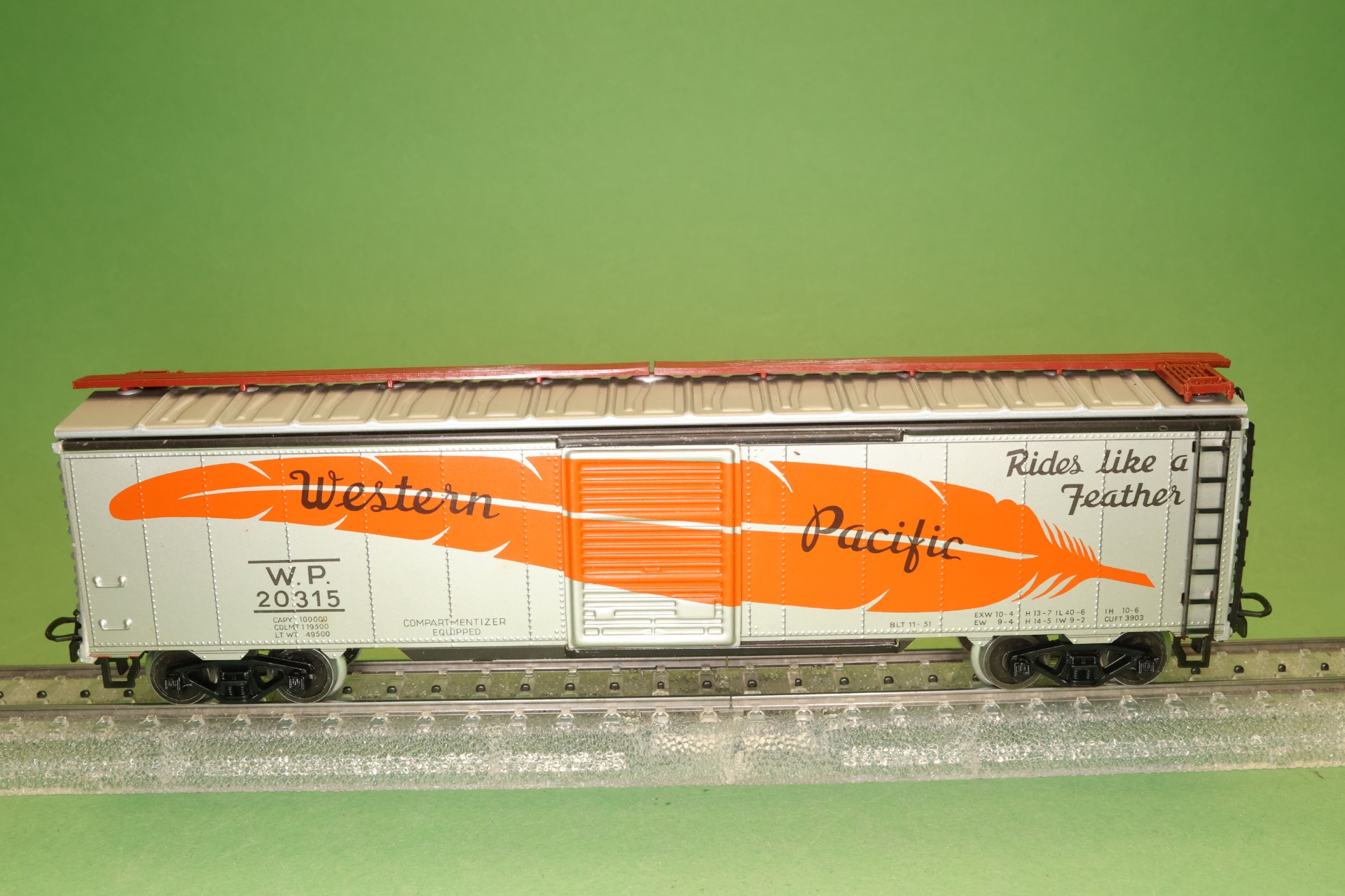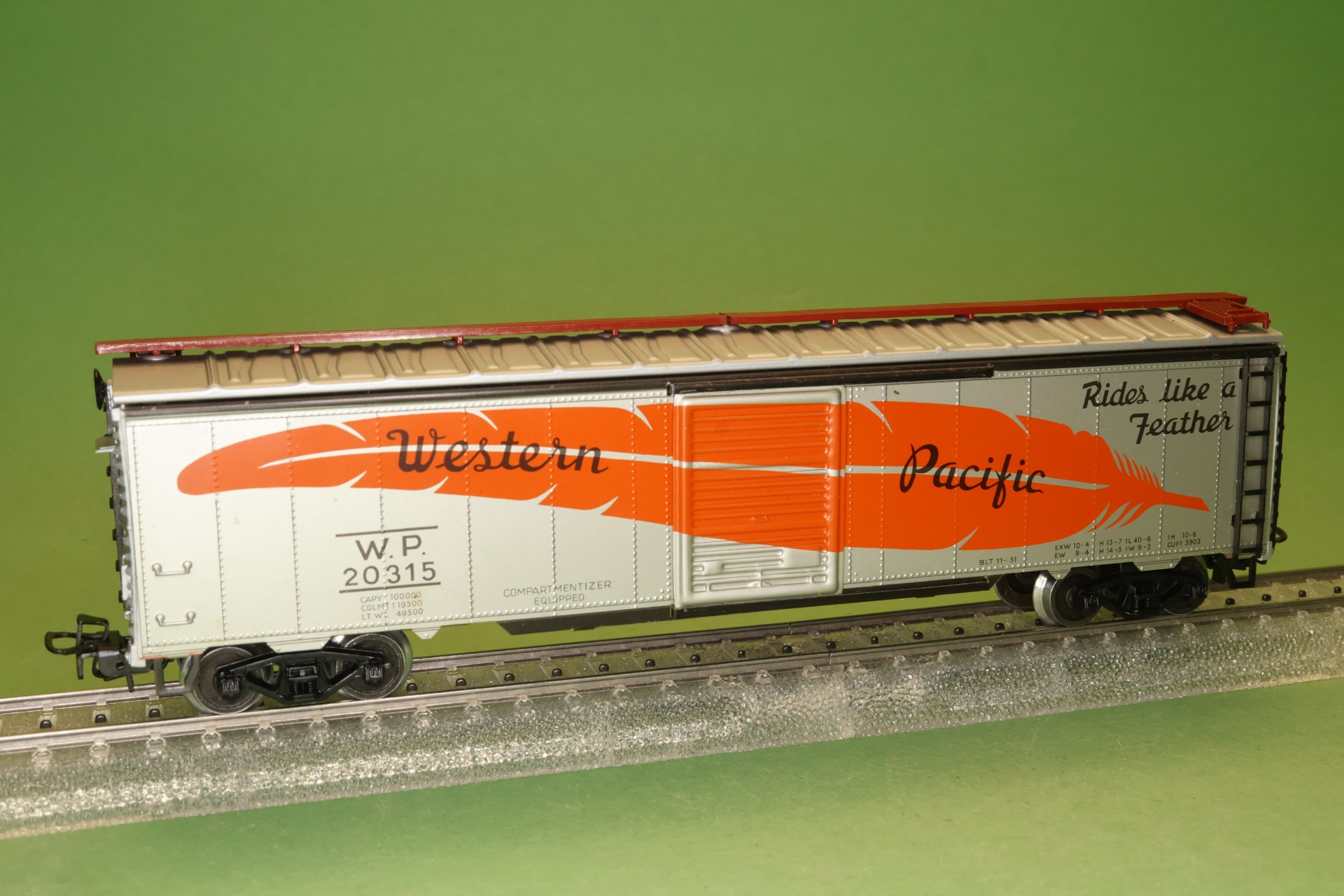 Goederenwagon van het type Boxcar van de USA van de Western Pacific uit tijdperk III, De wagon heeft 4 assen en heeft een totale lengte van 18,4 cm. Het model is zilverkleurig met een oranje veer op de zijkant. Op de zijkant staat tekst "Western Pacific" en "Rides like a feather" in zwarte letters gedrukt. Het model is voorzien van Relex koppelingen (K7).