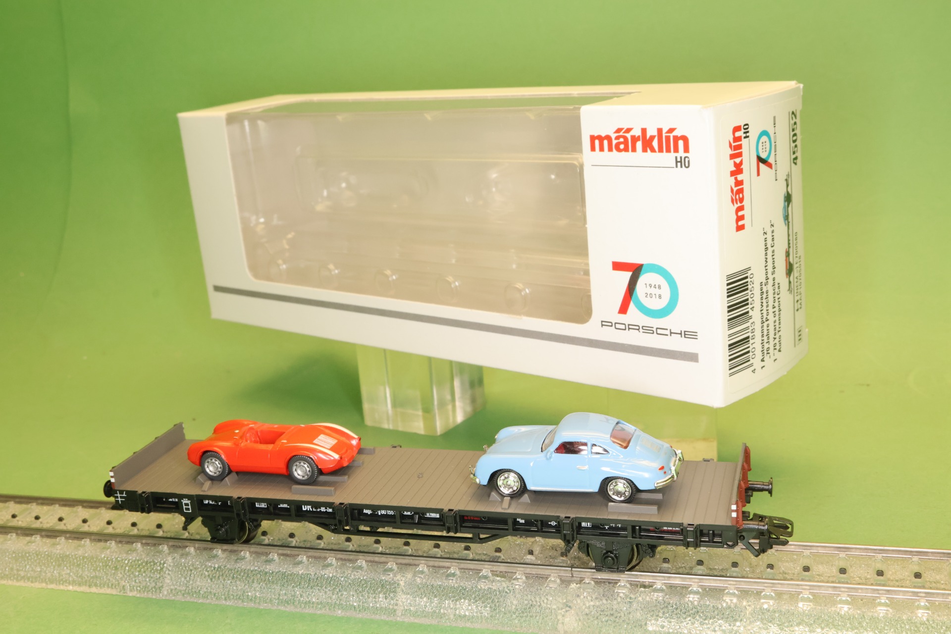 Platte wagen Sm Augsburg (verwisselbare type) van de Deutsche Bundesbahn (DB), als open goederenwagen voor het transport van motorvoertuigen. De platte wagen is met 1 Porsche 356 A en 1 Porsche 550 Spyder beladen. Zoals in gebruik rond 1955.