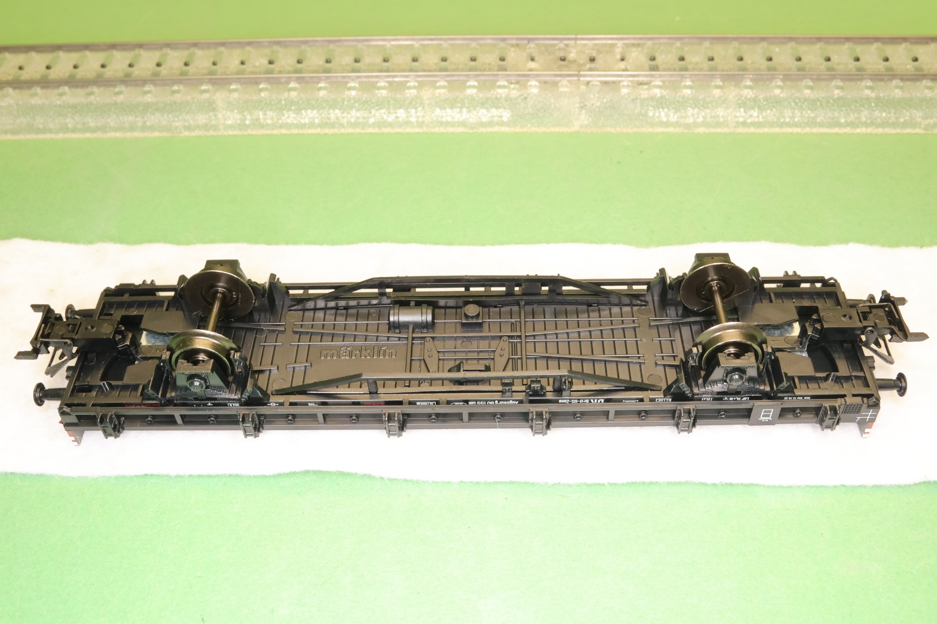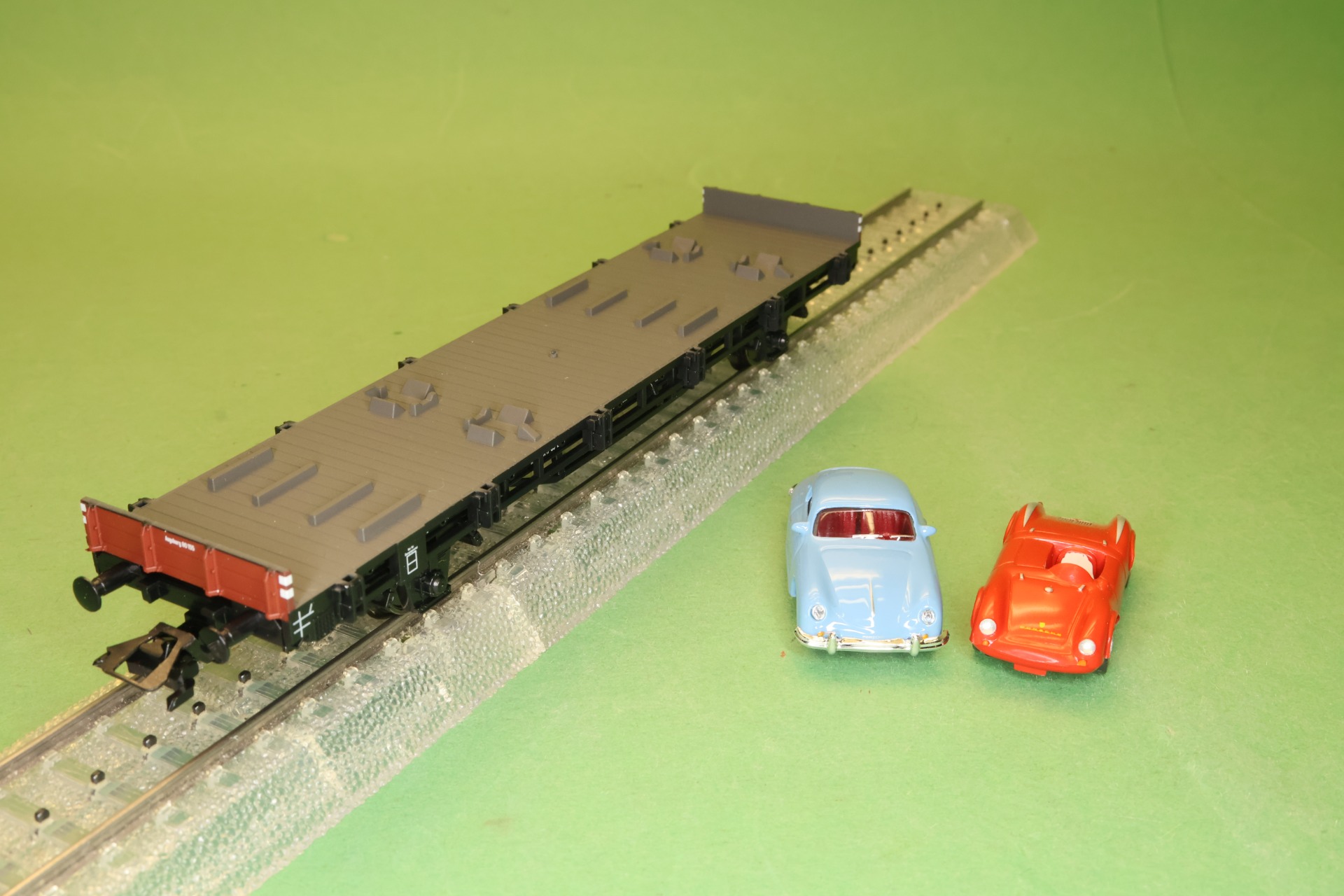 Model: Platte wagen met lange wielbasis. Opbouw platte wagen met houders voor vrachtwagens. Beladen met 1 Porsche-model van het bedrijf Schuco en 1 Porsche-model van het bedrijf Wiking.