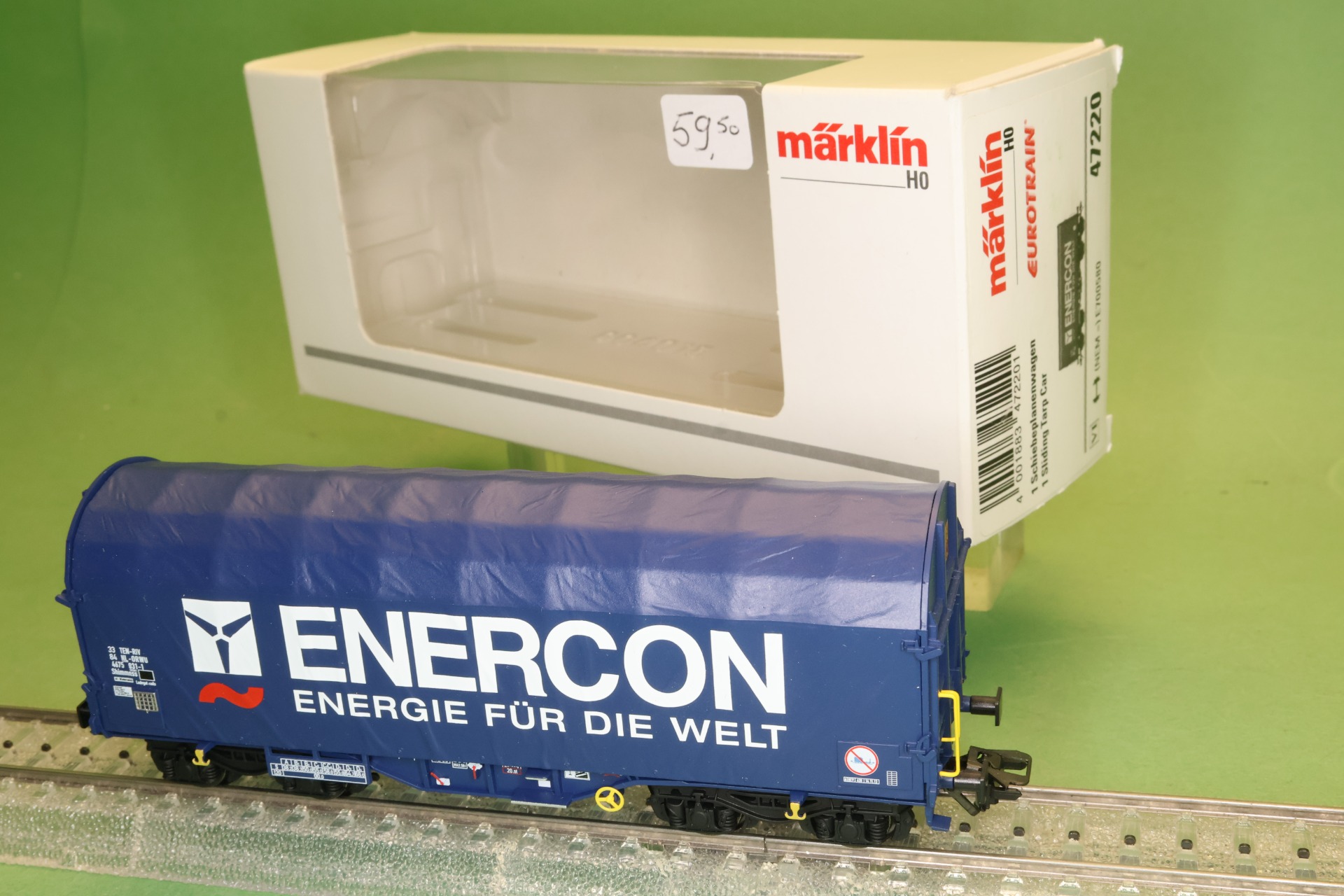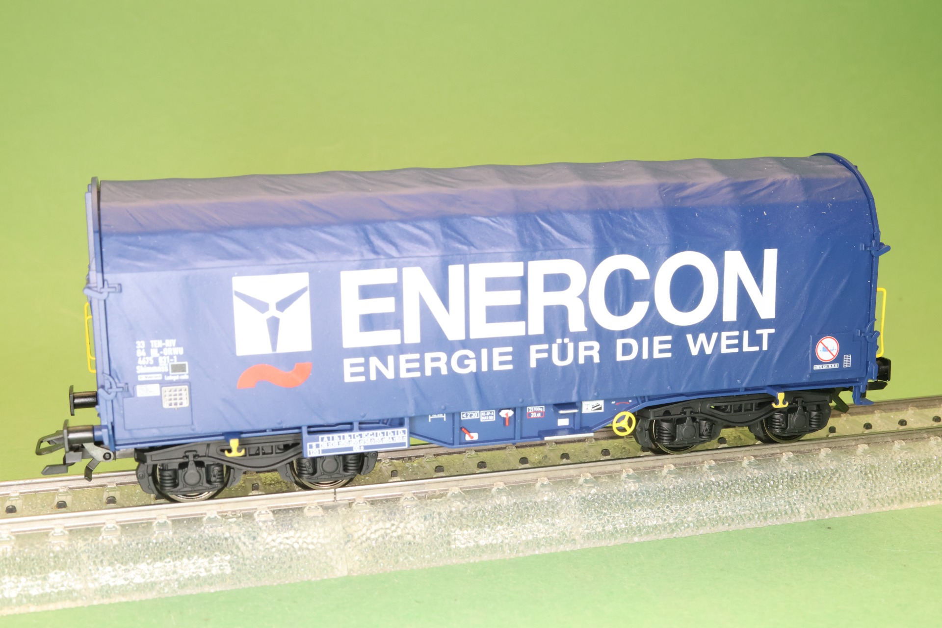 Coil wagon met verschuifbare huif van het type Shimmns 718 van de NS met Enercon reclame uit tijdperk VI. De wagon heeft 4 assen en heeft een totale lengte van 13,8 cm en is voorzien van Märklin kortkoppelingen (KK). De wagon is blauw. Dit model betreft een eenmalige uitgave voor de speelgoed-keten Idee+Spiel (Eurotrain).