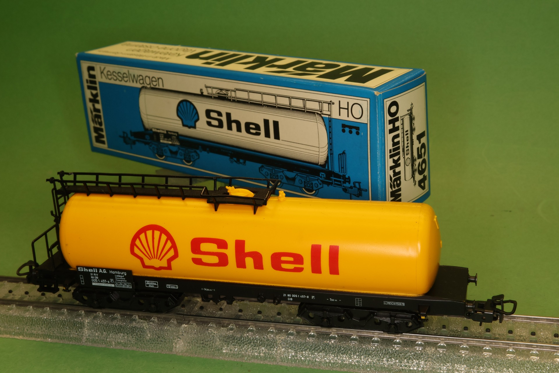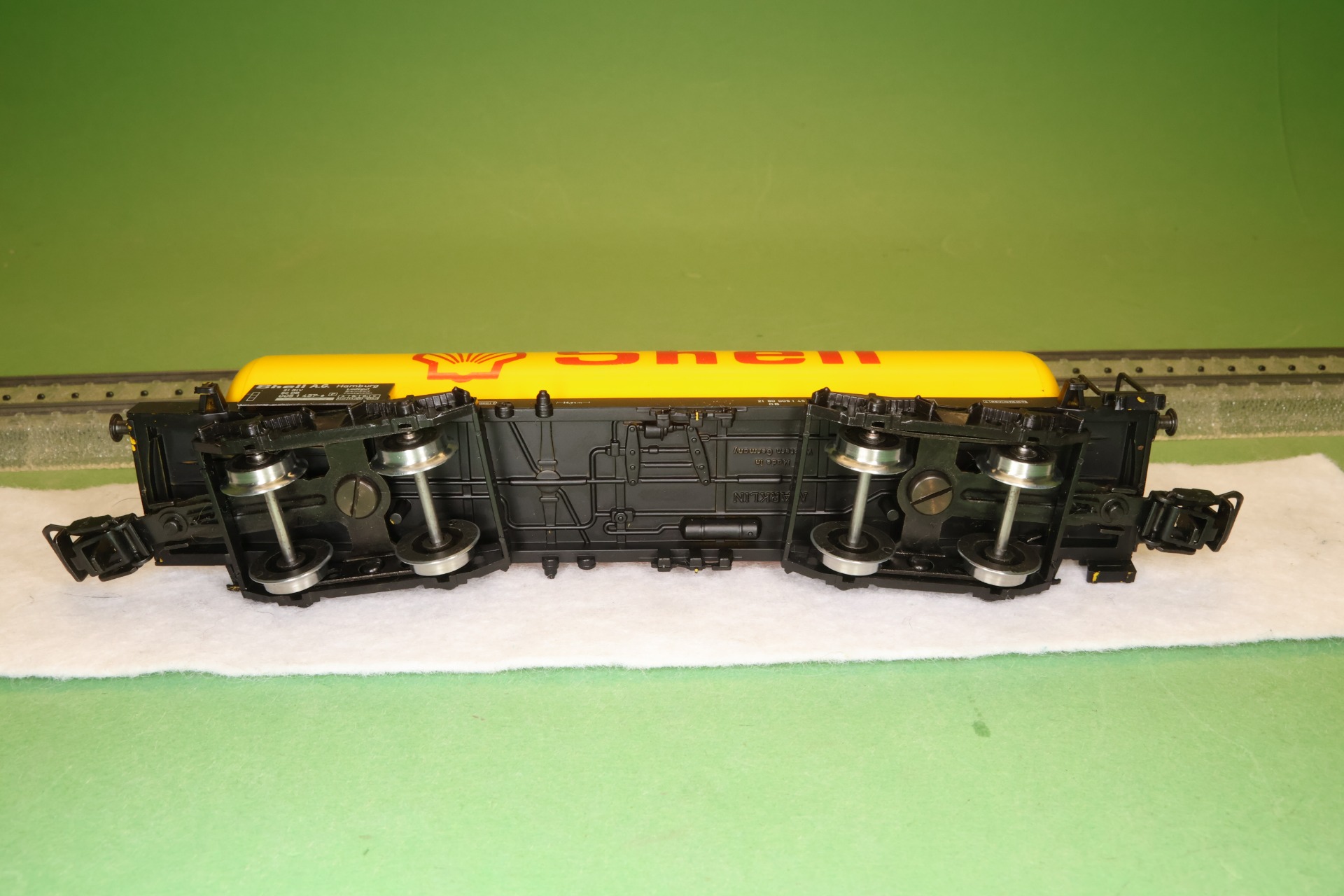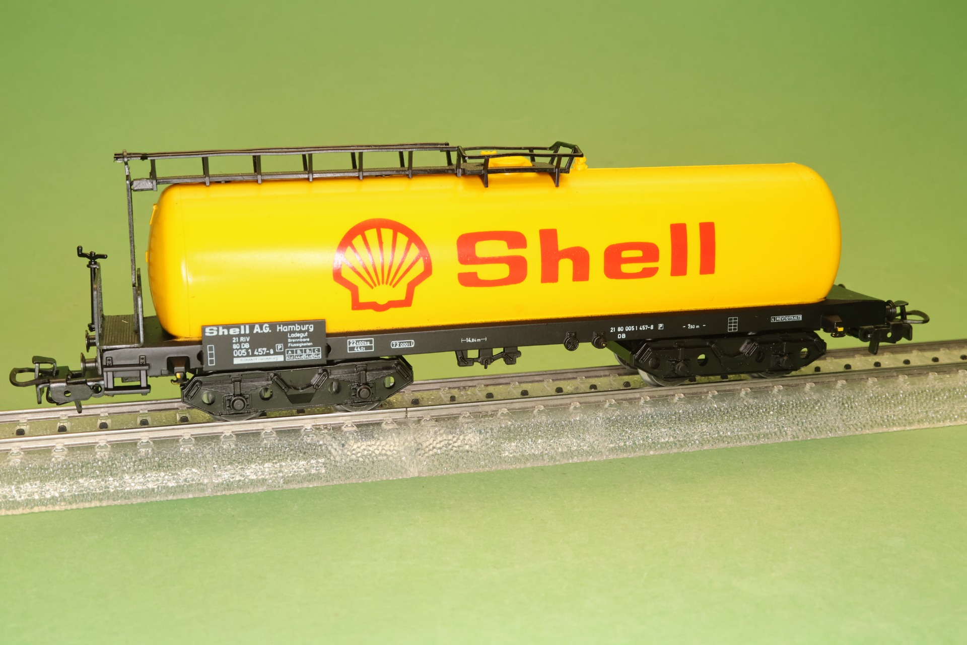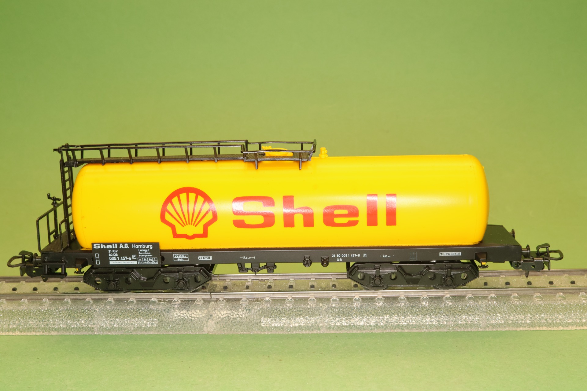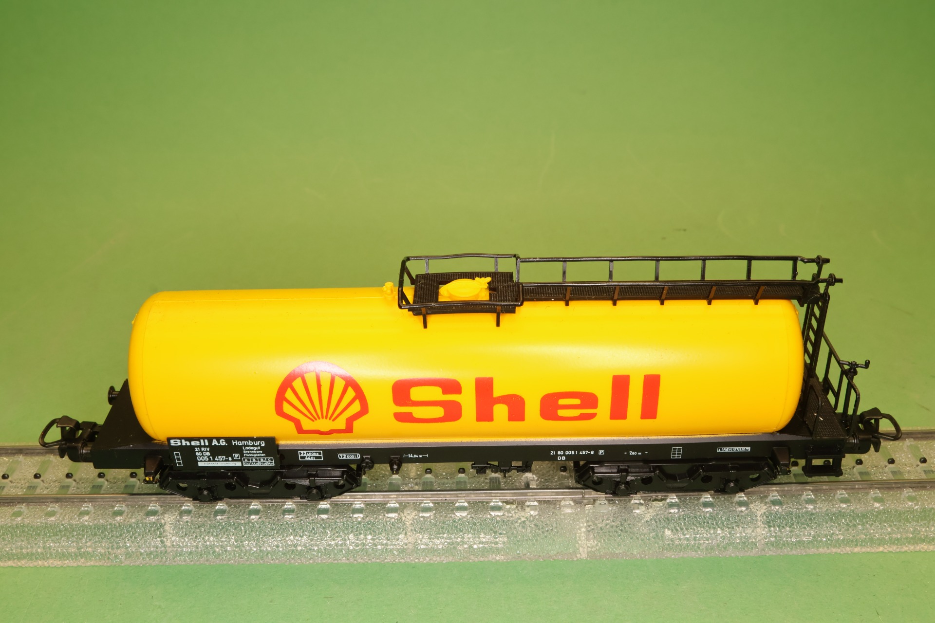 Model: Ketelwagen van "Shell" in dienst van de Deutsche Bundesbahn (DB) uit tijdperk IV/V. De wagon heeft 4 assen en heeft een totale lengte van 16,5 cm. Het model is geel met rode letters Shell en een rood Shell-embleem op de ketel bedrukt.