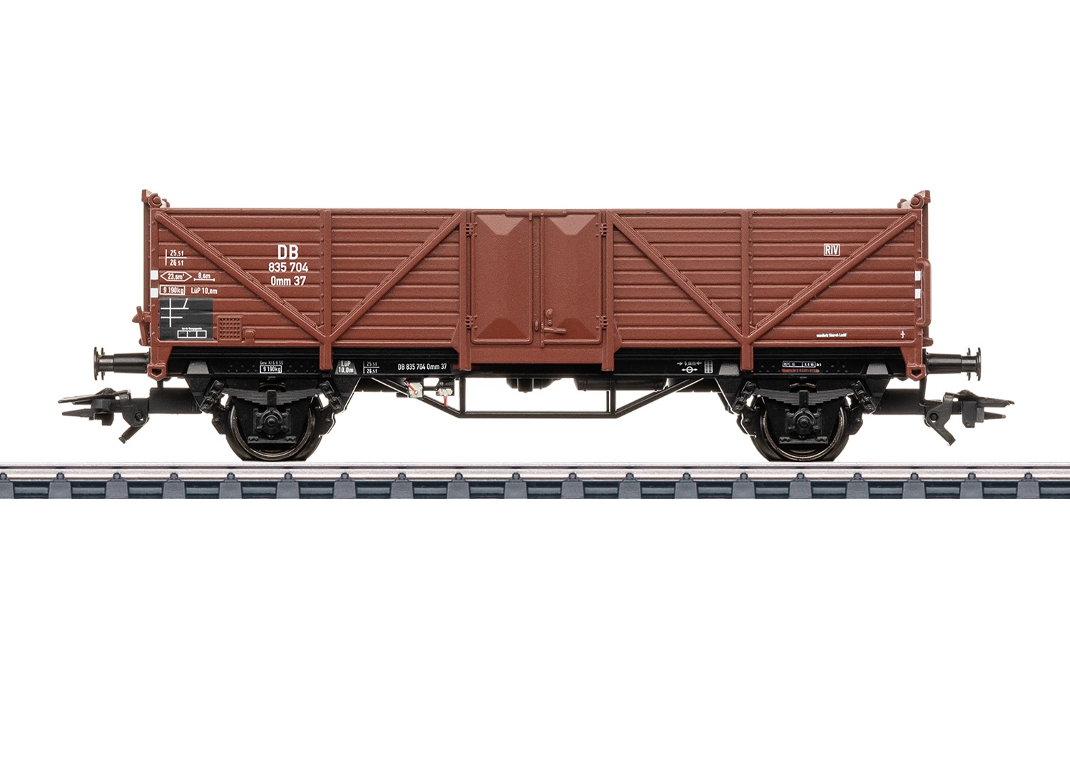 Open goederenwagen met hoge boorden type Omm 37 van de Deutsche Bundesbahn (DB). Kleur roodbruin. Zoals in gebruik in het midden van de jaren ‘50