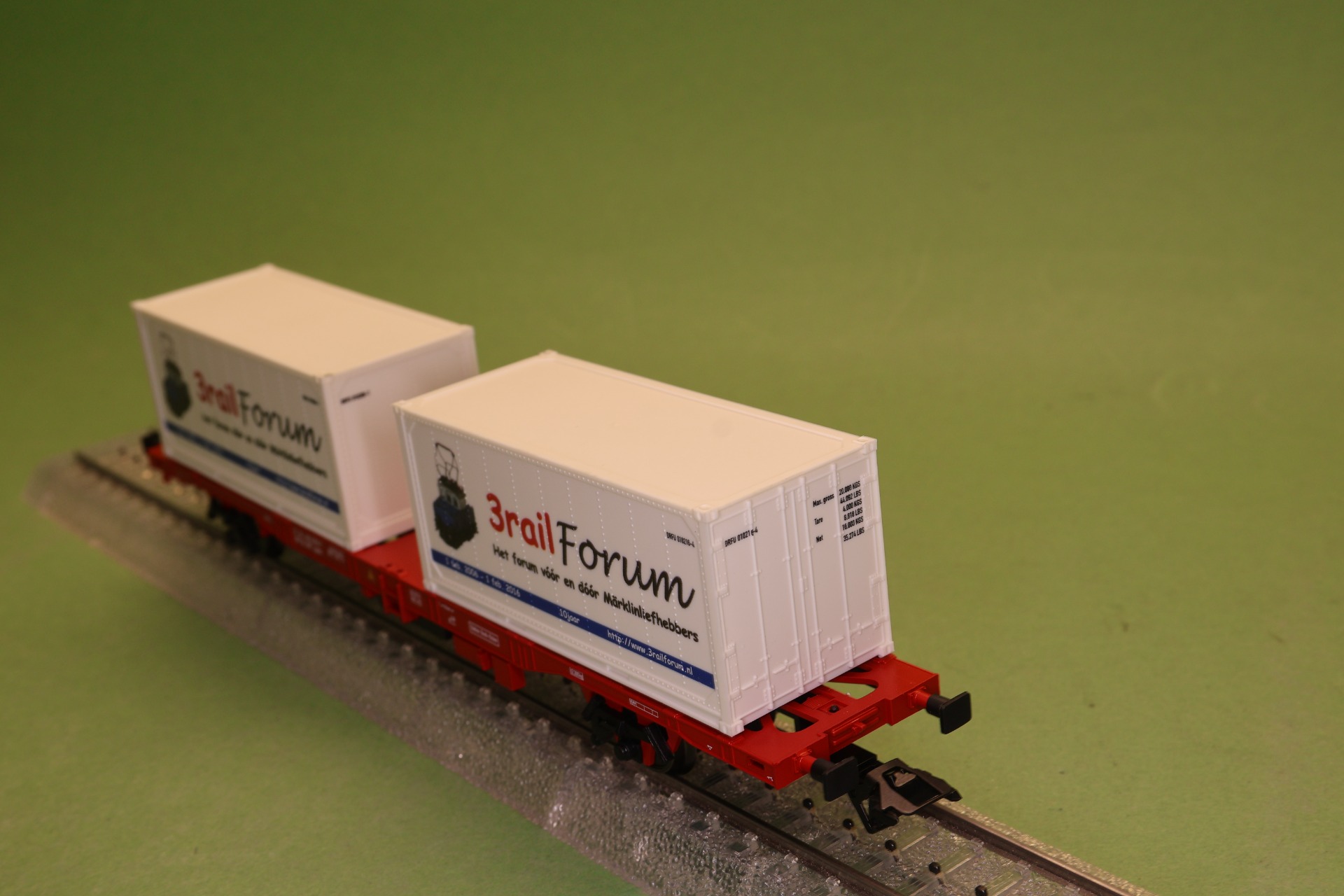 De Märklin 94490 is een 2 assige vlakke wagon voor container transporten, beladen met 2 containers met "10 jaar 3railforum" reclame. De wagon is verkeersrood en de containers zijn wit. Onderstel en containers zijn van kunststof. De wagon is voorzien van Märklin kortkoppeling (KKK). De wagon heeft een lengte van 19,1 cm.
