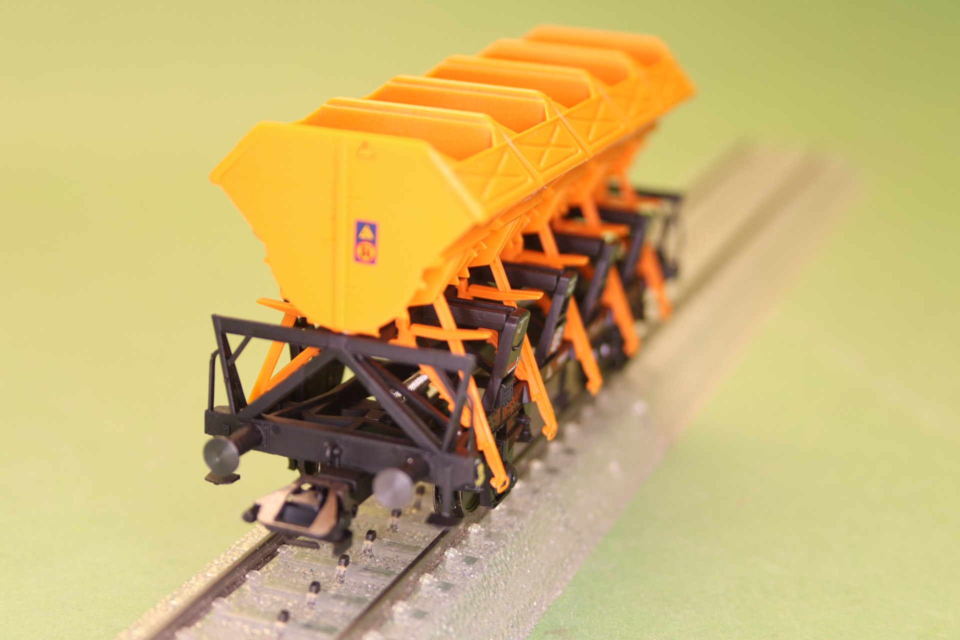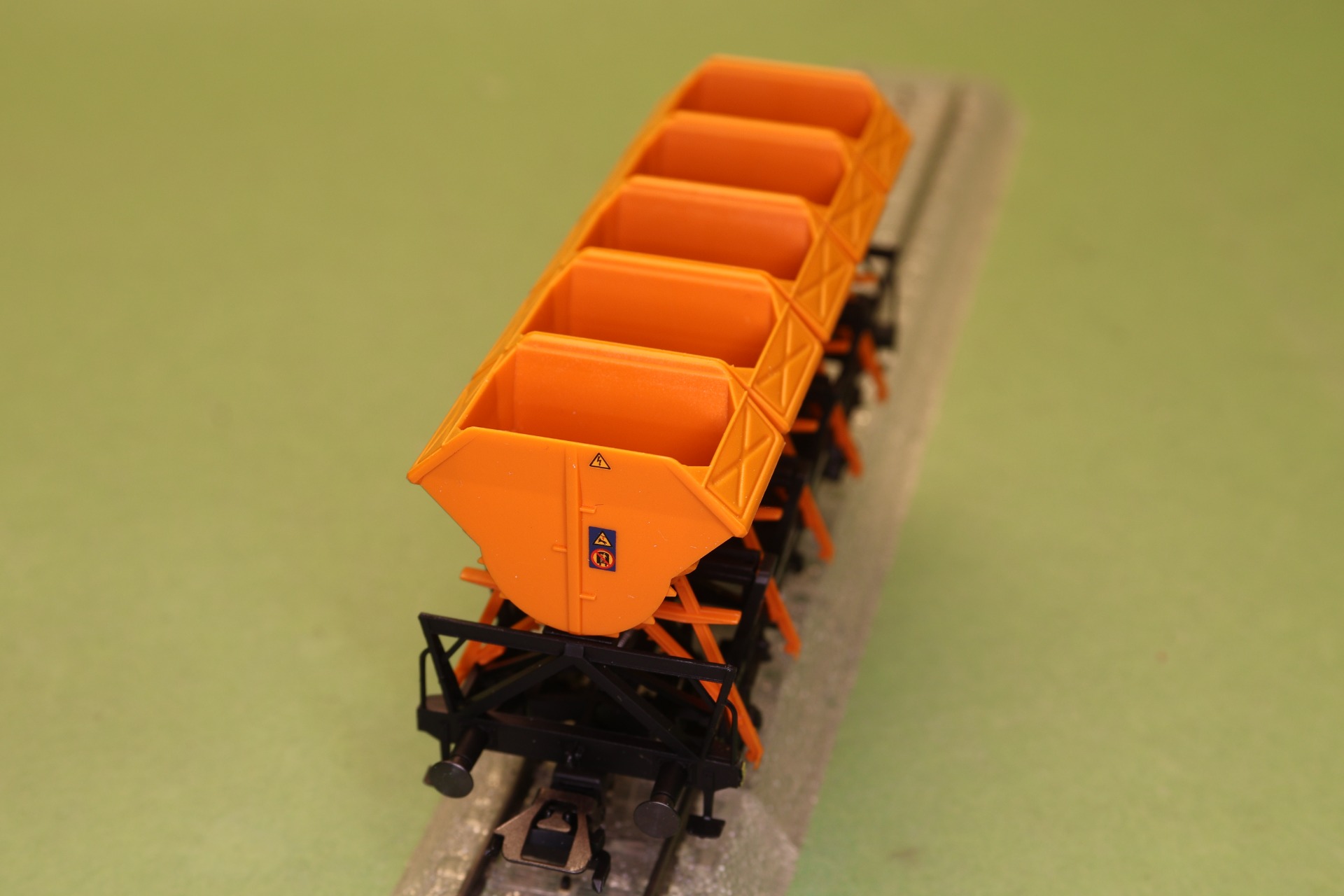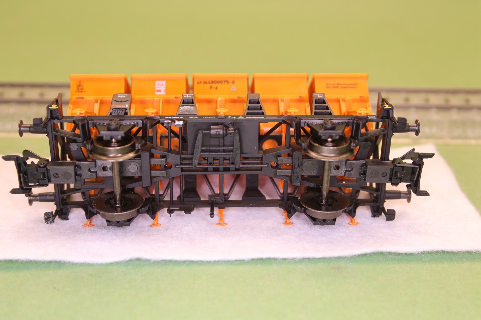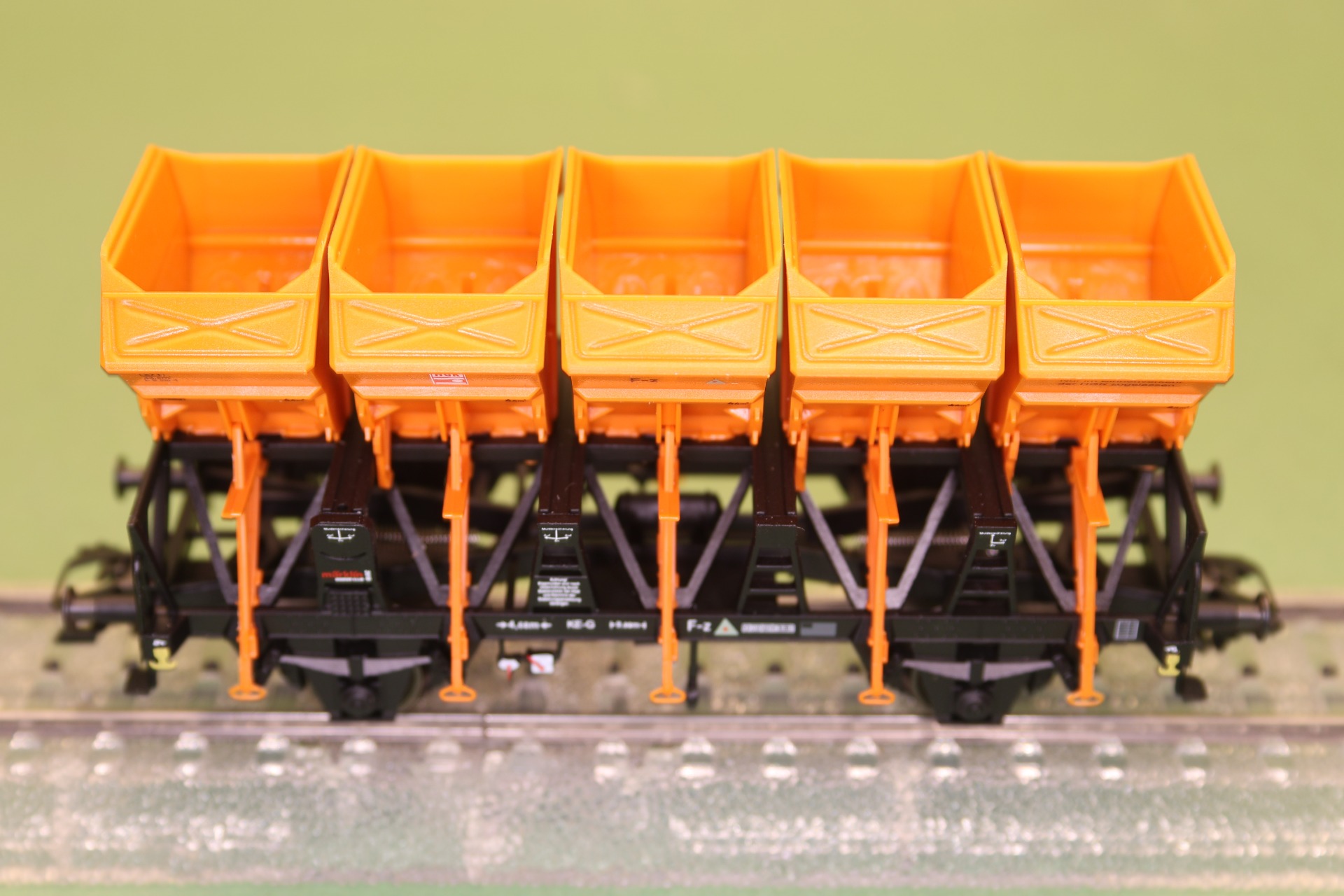 Gedetailleerde uitvoering met doorbroken frame, afzonderlijke gemonteerde railtangen en afzonderlijk gemonteerde kantelbakken. Zonder remcabine. Lengte over de buffers 10,4 cm.