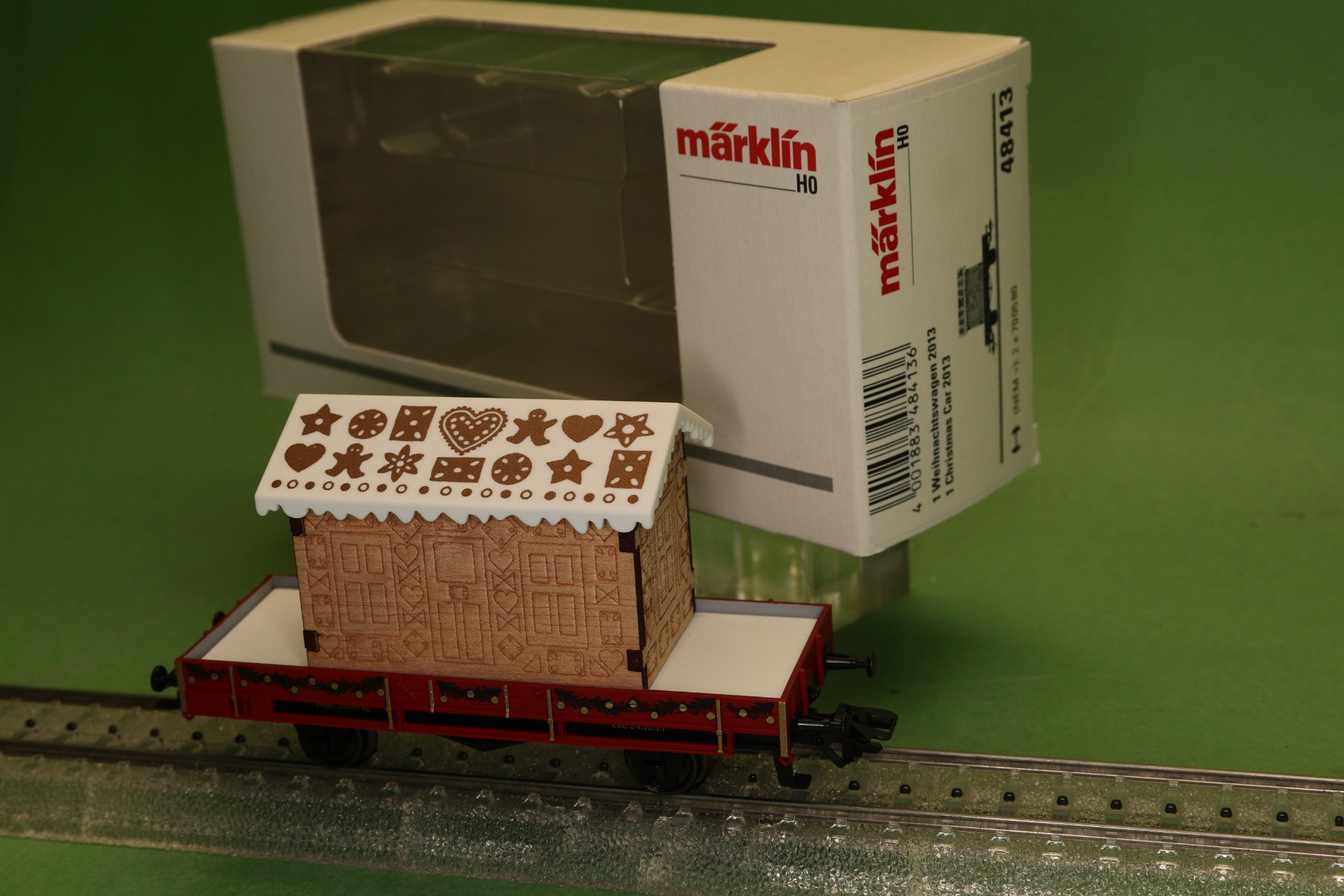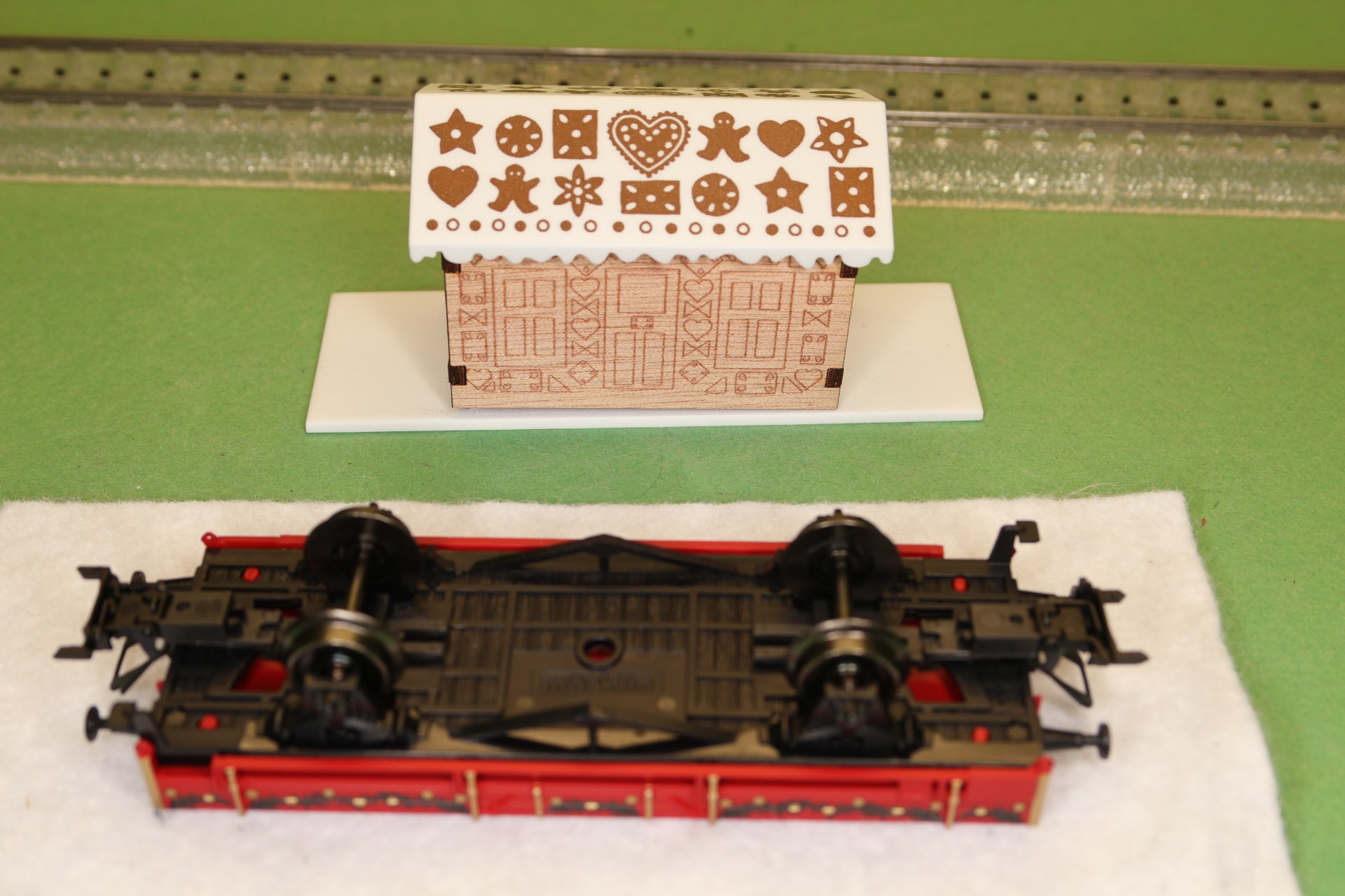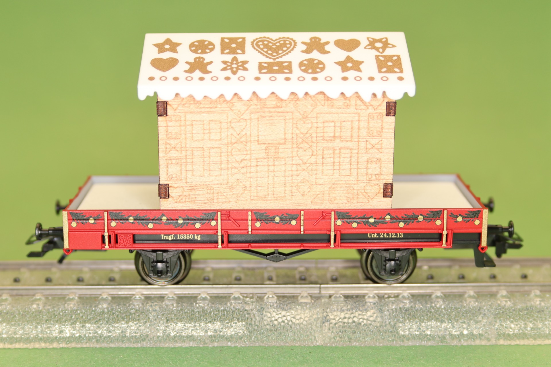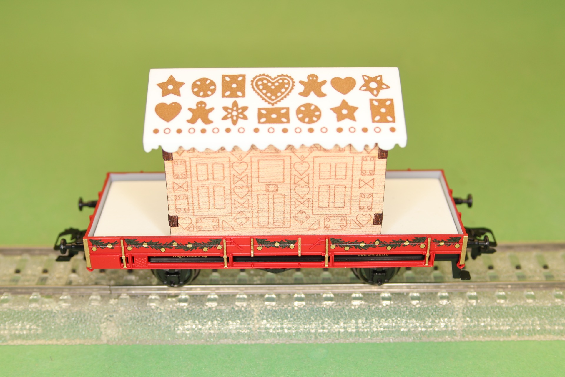 Model: Lageboordwagenbeladen met een houten speculaashuis. Wagen met kortkoppeling met schaargeleiding.