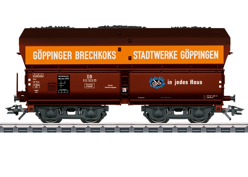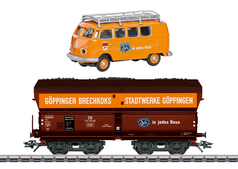 Model: Zelflosser in gedetailleerde uitvoering, met remplatform en stelwiel aan de kopzijde. Beladen met lading-inzetstukken en echte kolen op schaal. Lengte over de buffers 11,5 cm. Schuco-model van een VW-bus T1 met bagagedrager wordt meegeleverd.