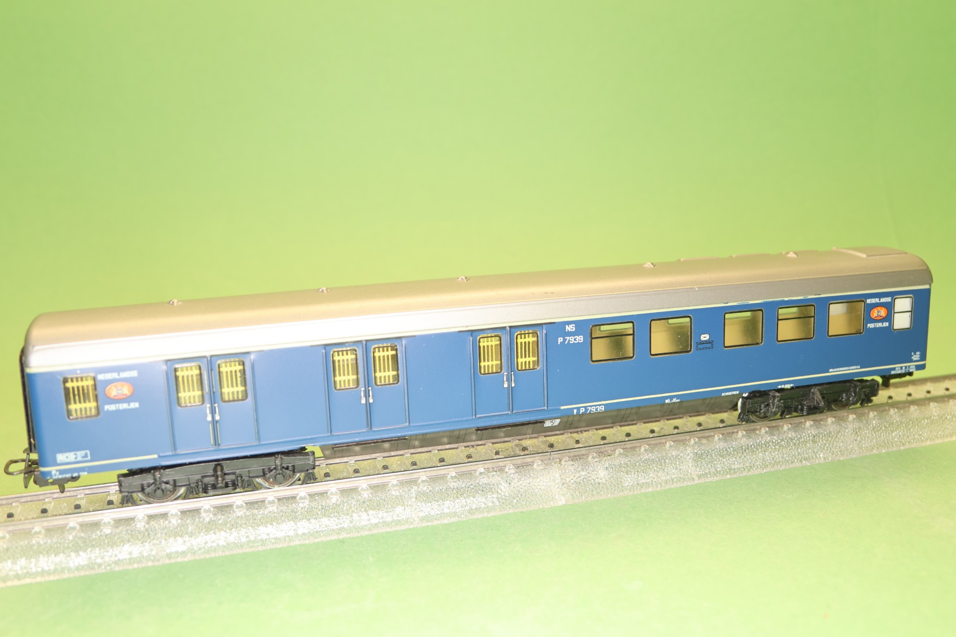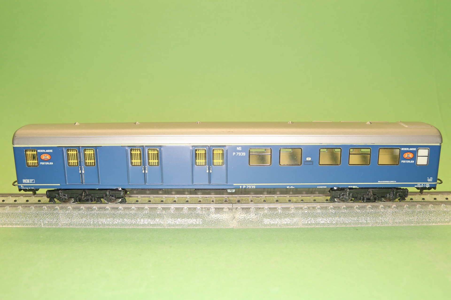 4-assig NS - Postrijtuig ,Serie P7900 Plan E. Kleur blauw, met ingezette vensters met zwarte rand waarvan sommige v.v. gele tralies. Verder v.v. witte opschriften NS P 7939 „NEDERLANDSE POSTERIJEN” en tevens kleurig PTT logo. Lengte over de buffers 24cm.