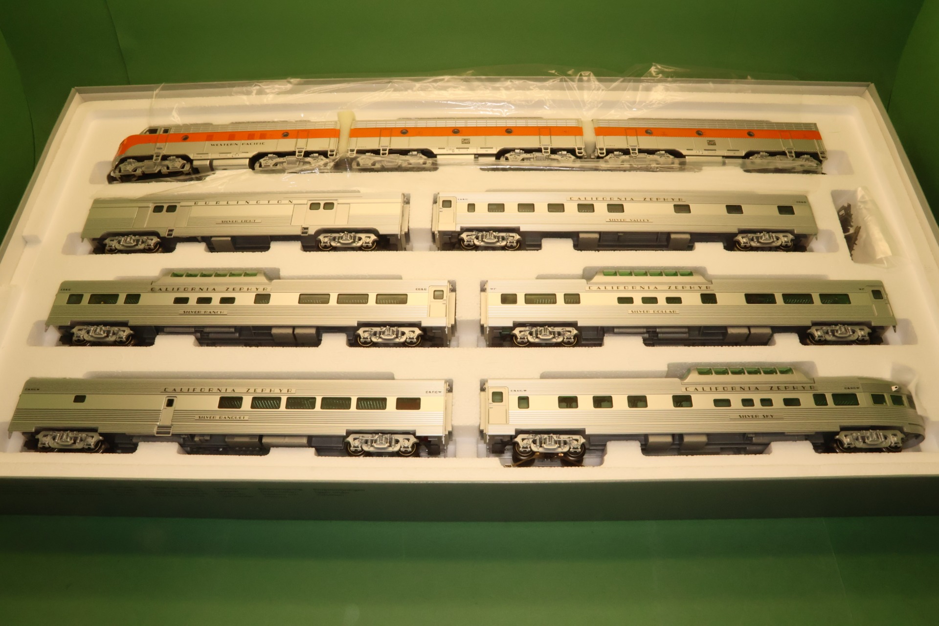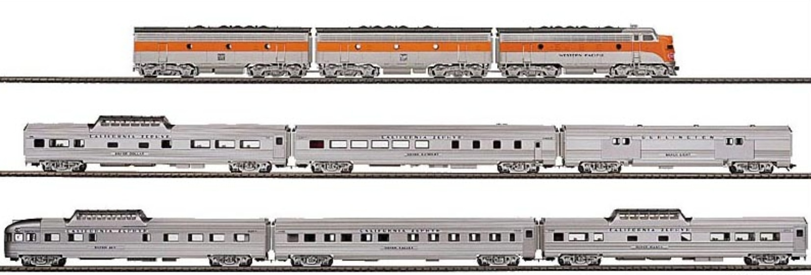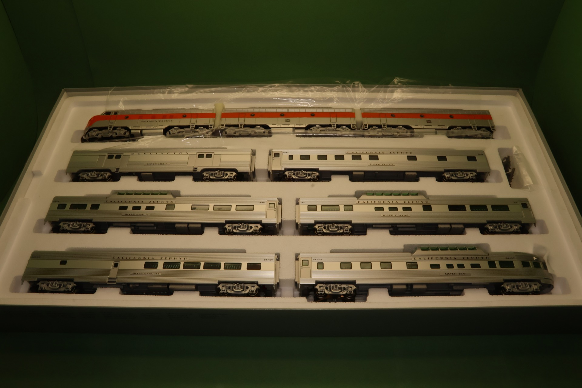 Western Pacific California Zephyr gestroomlijnde reizigerstreinset. General Motors EMD F7-ABB diesellocomotiefset, bagagewagen en vijf gestroomlijnde reizigersrijtuigen. Inclusief rijtuigen met Vista Dome-daken en observatierijtuig.