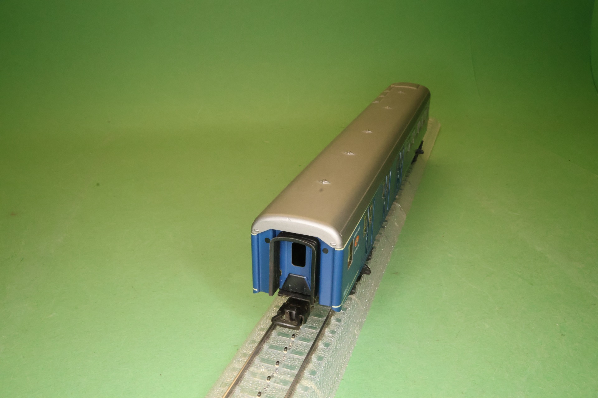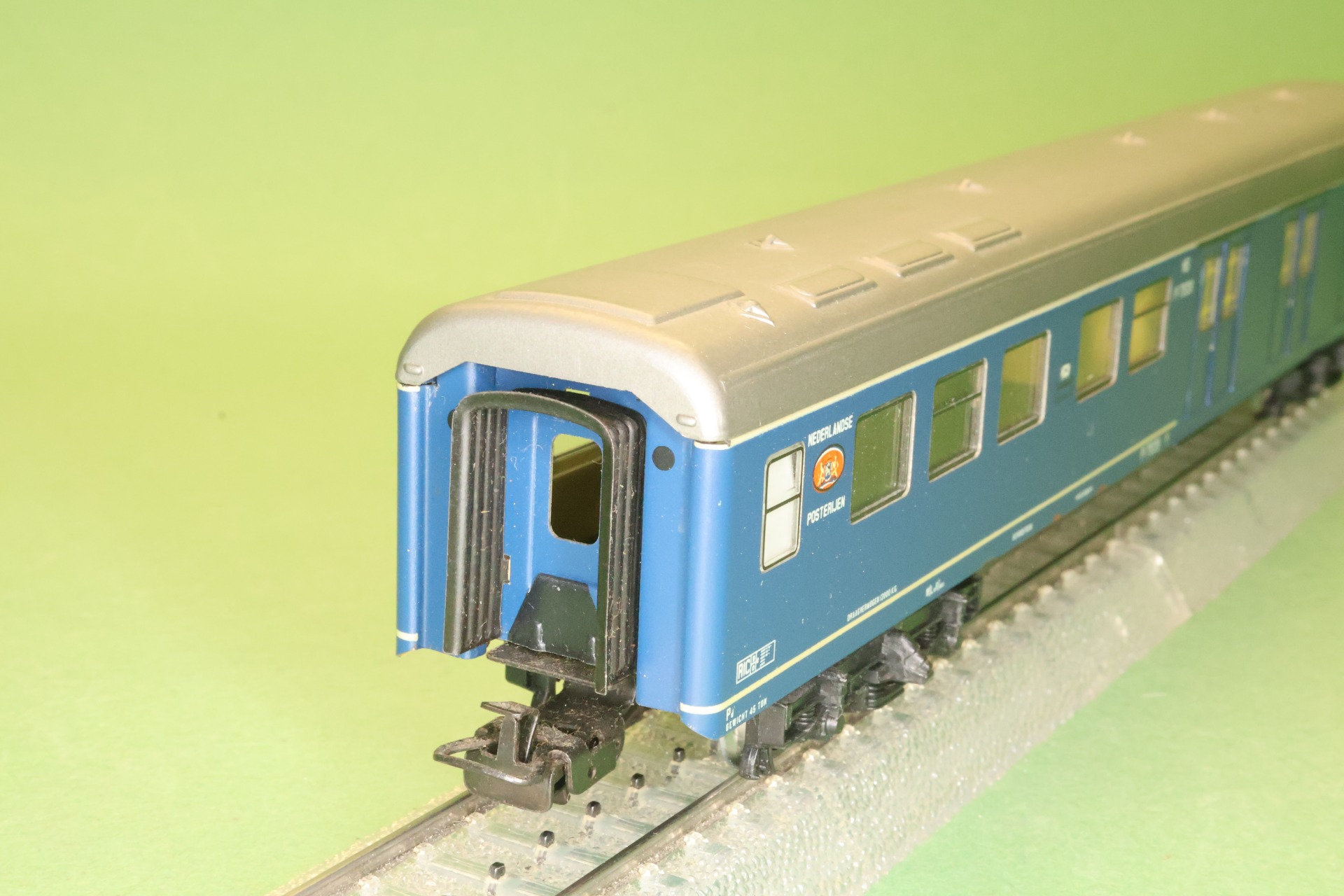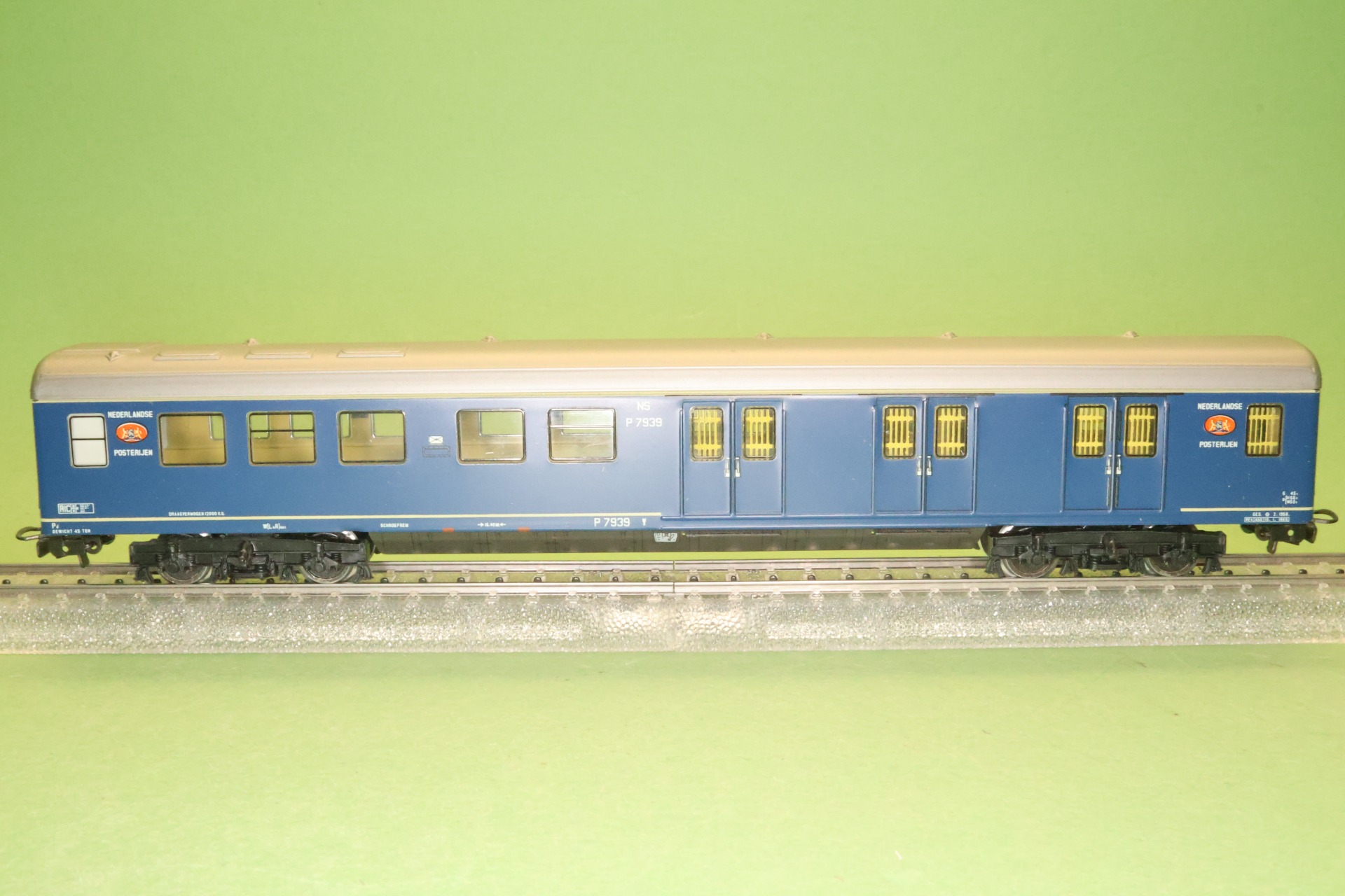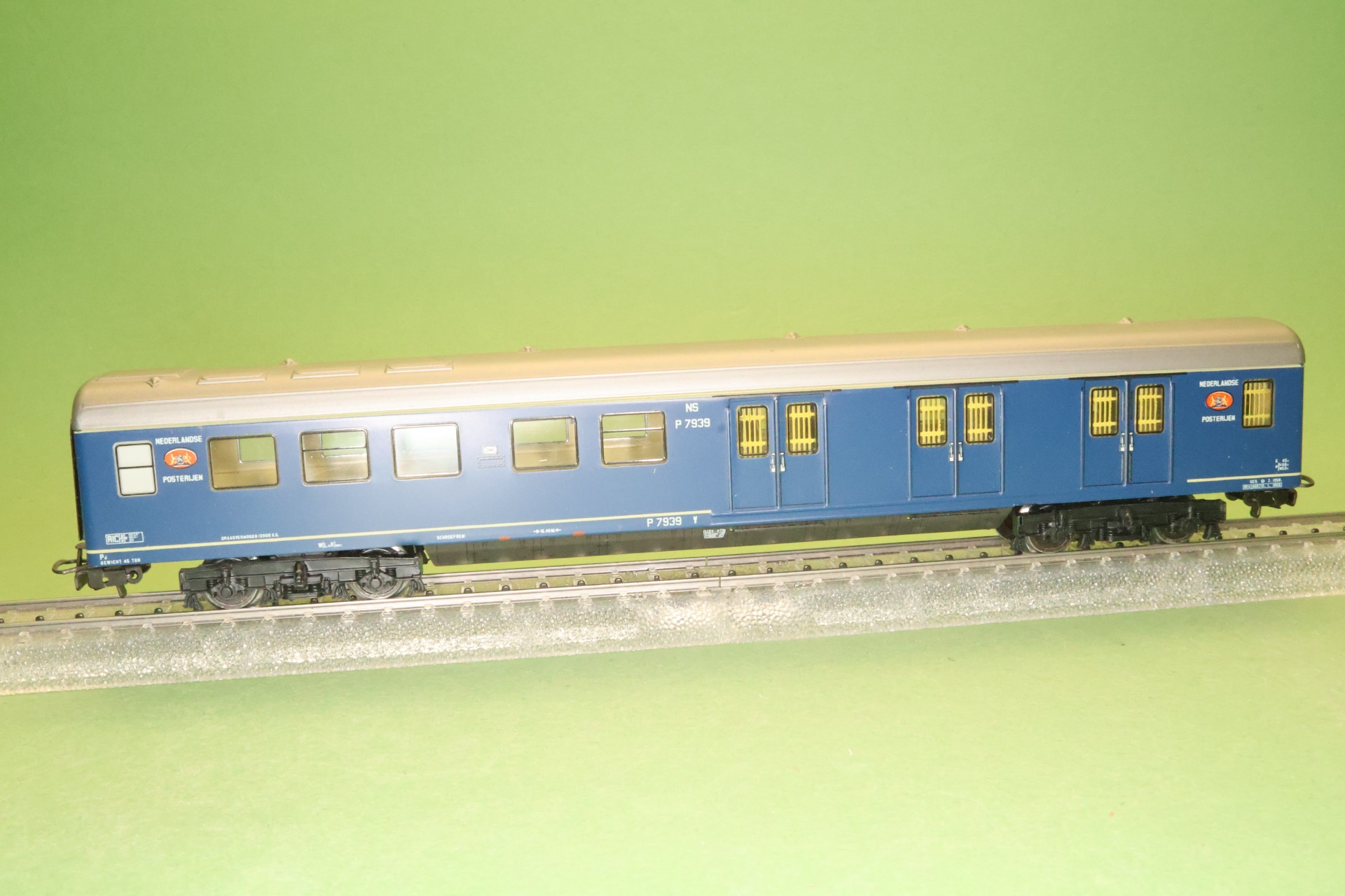 4-assig NS - Postrijtuig ,Serie P7900 Plan E. Kleur blauw, met ingezette vensters met zwarte rand waarvan sommige v.v. gele tralies. Verder v.v. witte opschriften NS P 7939 „NEDERLANDSE POSTERIJEN” en tevens kleurig PTT logo. Lengte over de buffers 24cm.