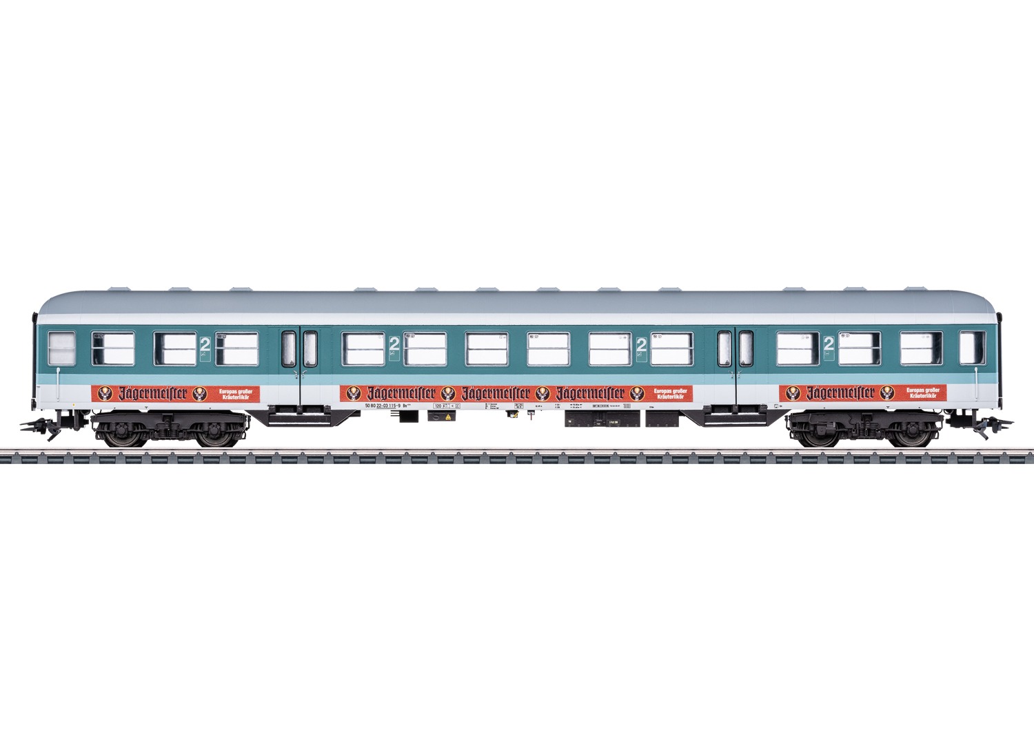 Passagierswagon type Bn 434, 2e klasse, van Deutsche Bahn AG. Lichtblauwe/lichtgrijze kleurstelling met Jägermeister-reclame op de zijkant. Uitvoering met afgerond dak. In gebruik sinds 1996.
