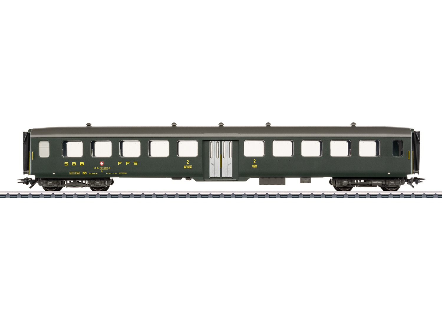Lichtmetalen rijtuig 2e klas van de Zwitserse staatsspoorwegen (SBB CFF FFS) met twee dubbele deuren en middeninstap. Kleur dennengroen. Zoals in gebruik omstreeks 1990.