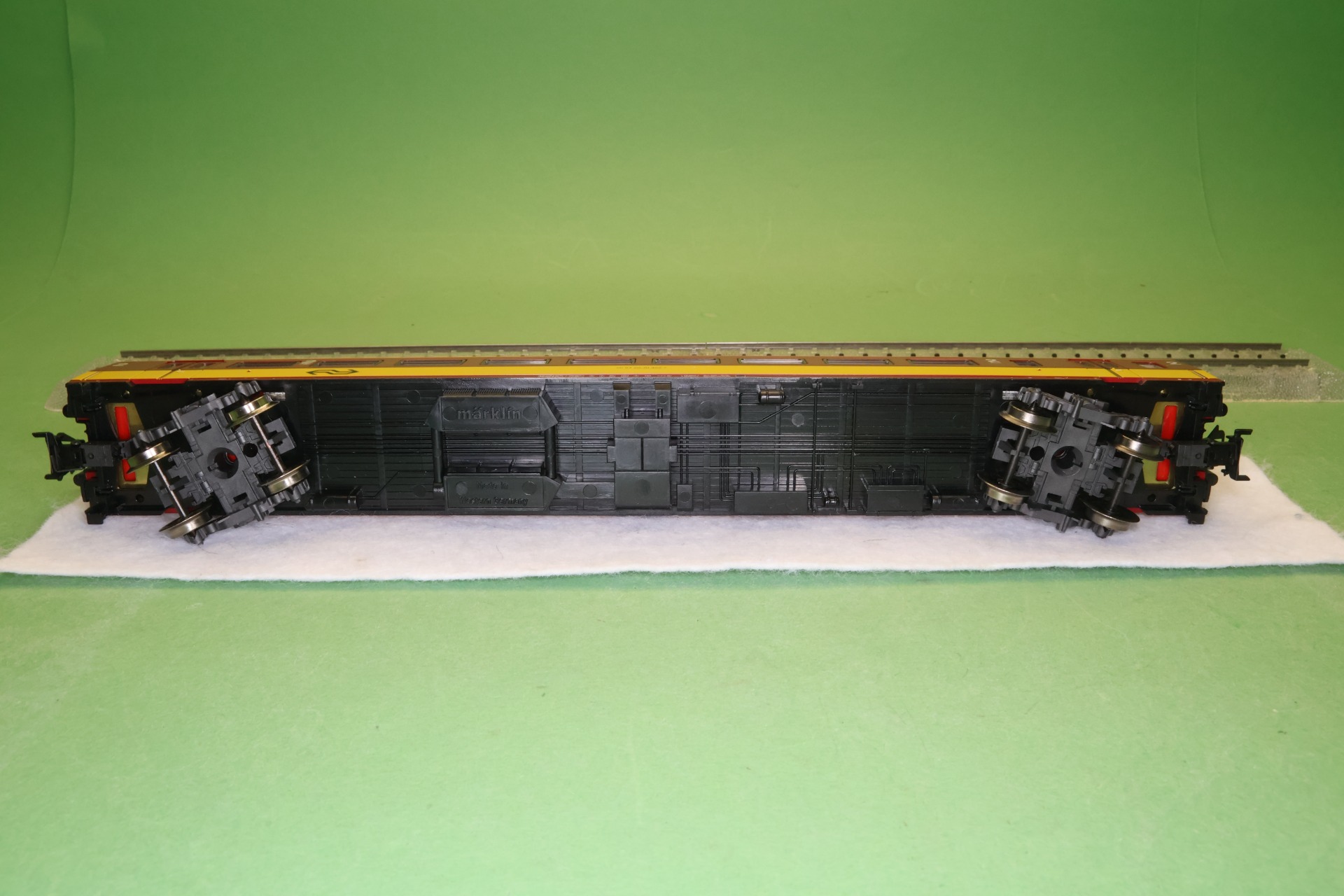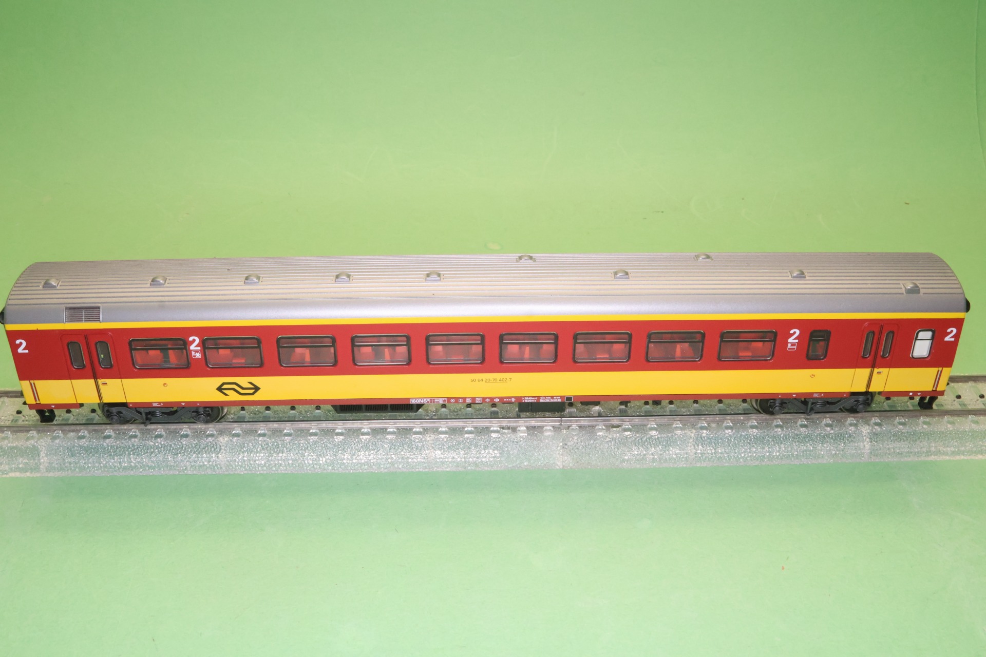 Model: Rijtuig in rood/gele BENELUX-kleurstelling. Lengte over buffers 26,4 cm.