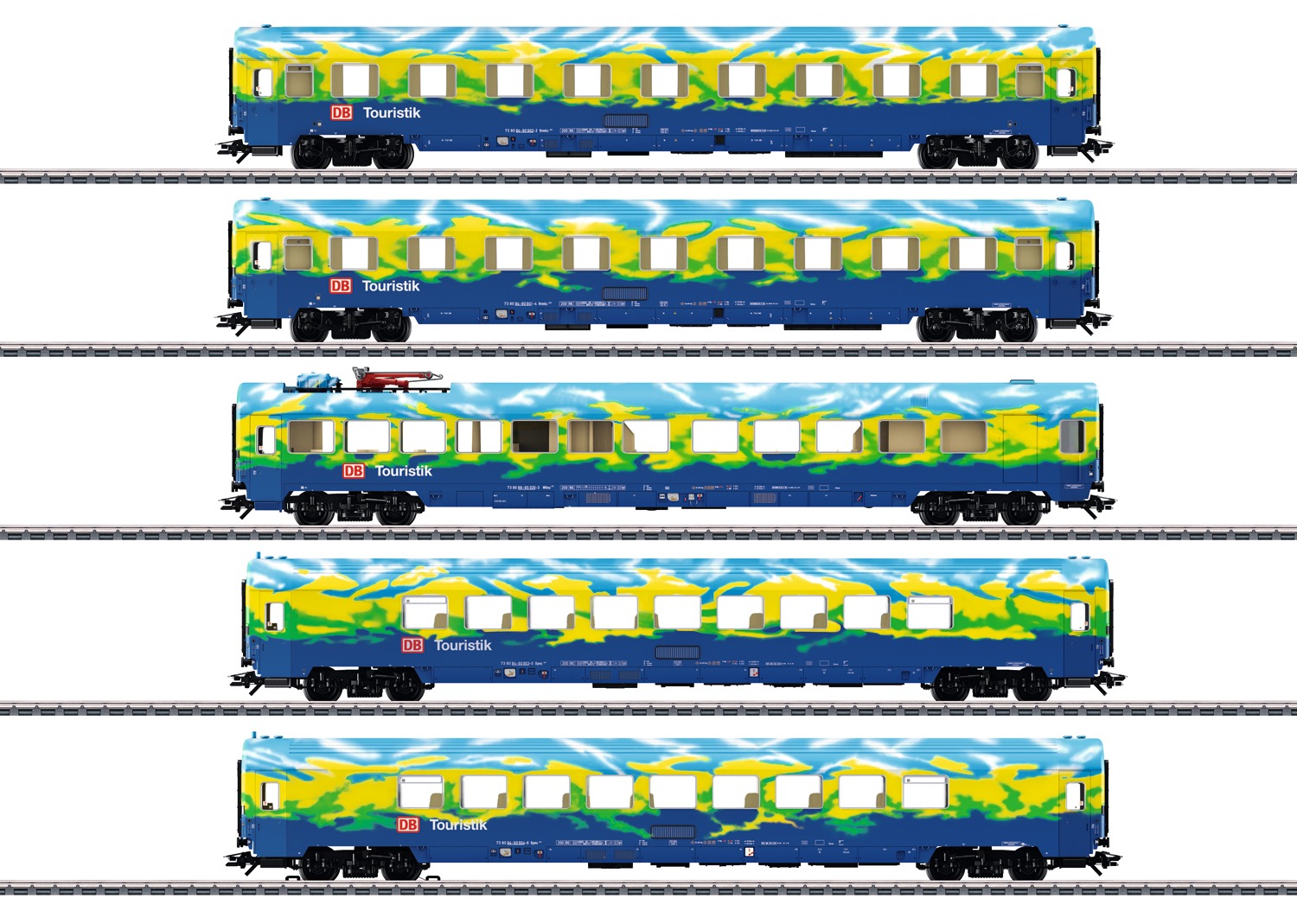 Vijf verschillende types personenrijtuigen van de Deutsche Bahn AG (DB AG). Twee personenrijtuigen type Bvmkz 810, twee personenrijtuig type Bpmz 811 en een restauratierijtuig type WRmz 137. Uitvoering met lakwerk van toeristentrein. Zoals in gebruik rond 1995.